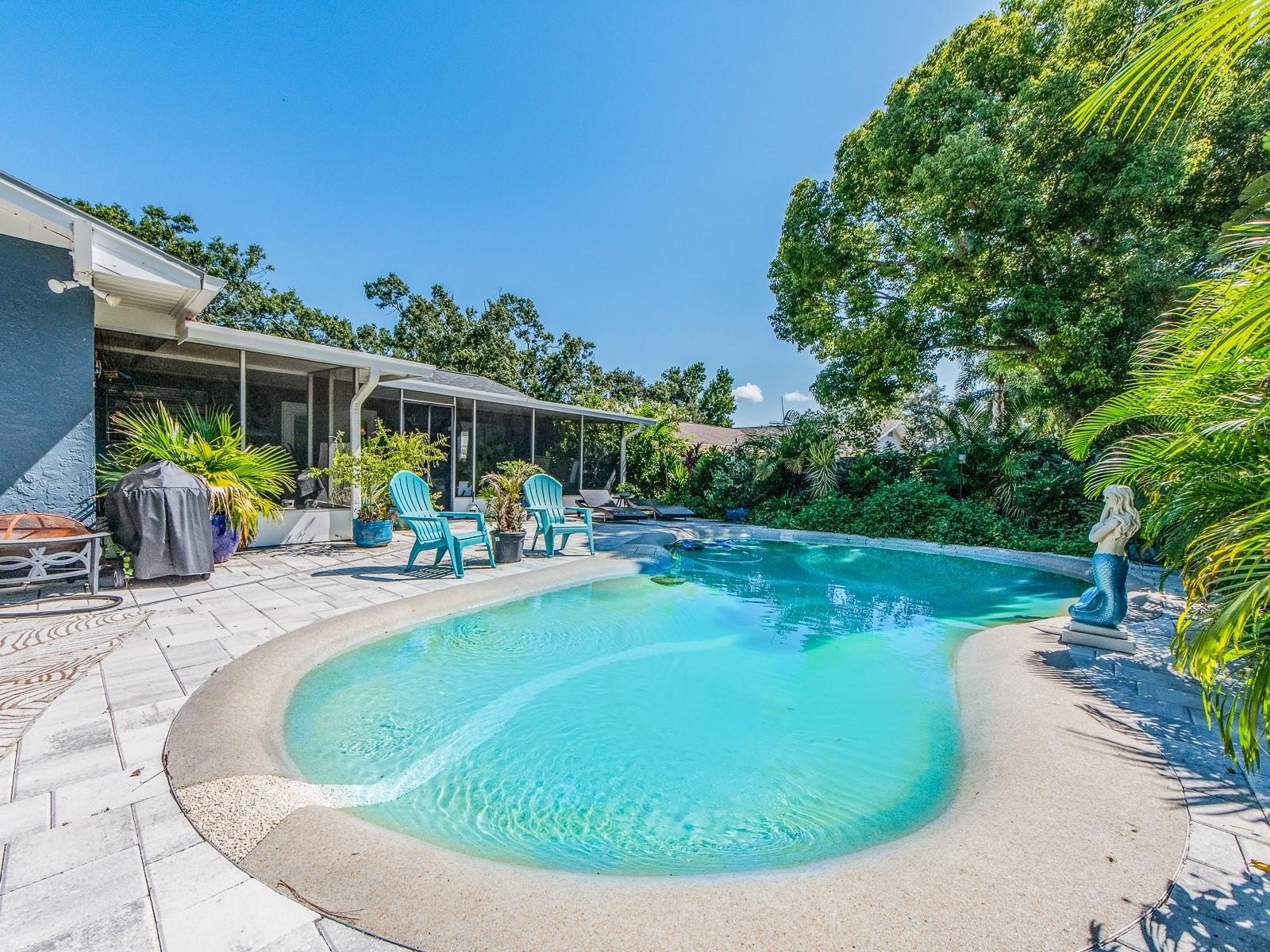 Location is everything! This property is not in a flood zone. Come check out this 4 bedroom, 2 bath with a 2 car garage POOL home on a nice Cul-De-Sac street! Located in a North Pinellas County neighborhood situated between US 19 and Belcher Rd. which provides easy road access to many close by amenities such as great shopping, restaurants, banks, etc. Not far from Honeymoon Island State Park known for its beautiful beach and nature trails. The floor plan offers a split bedroom layout. Primary bedroom with sliding doors opening out to the lanai, has an en-suite bathroom and walk in closet. NEED an OFFICE? On the opposite side of the home, you have 3 rooms that can all be utilized as bedrooms or 2 can be with one used as an OFFICE. The kitchen overlooks the family room and looks out to the fenced in yard and pool. Kitchen features white cabinets and newer appliances. Home has a newer roof (2023), heated salt water lagoon pool (2023), And lush landscaping adds to the tropical enjoyment of the home.