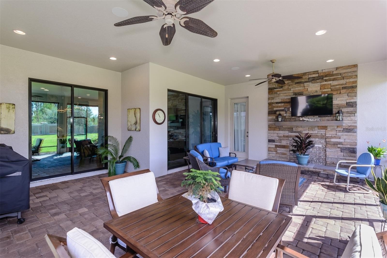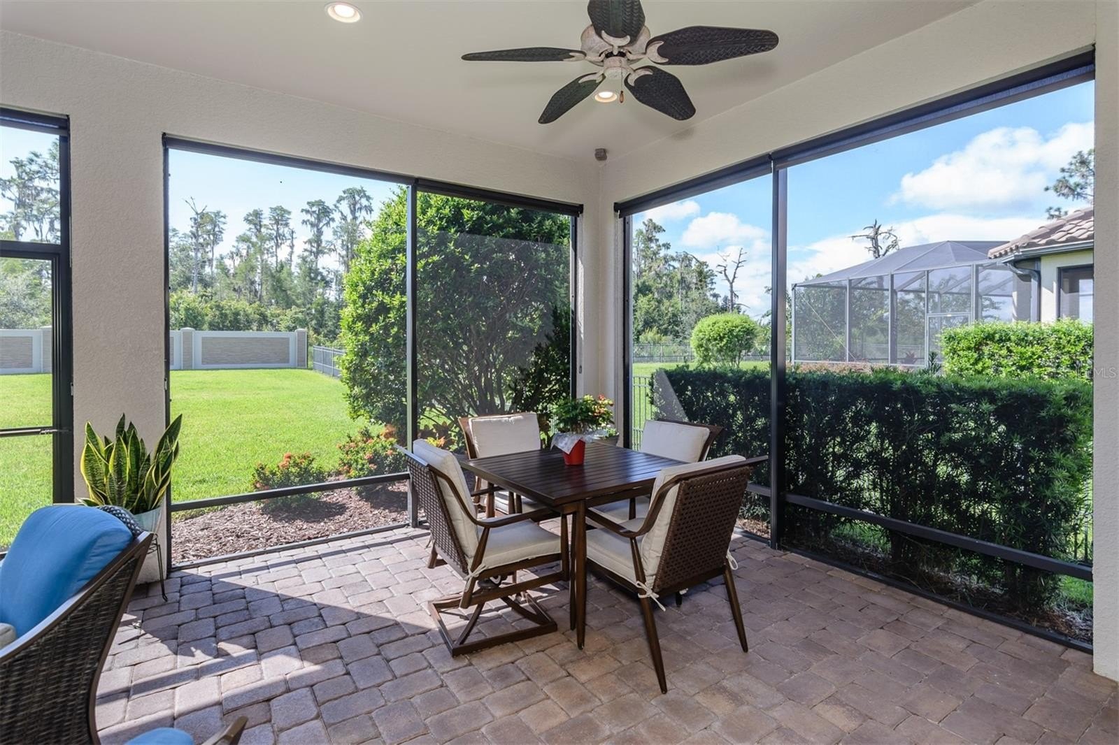 Welcome to Esplanade at Starkey Ranch, a prestigious gated community. This beautiful Taylor Morrison, Lazio model home located on a prime lot has 3 bedrooms, plus office/den or 4th bedroom, 3 bathrooms, and a 2.5-car garage and no rear neighbors. The quarterly HOA fee includes maintenance of the lawn, bushes, and irrigation system. Lovely brick paved sidewalk and driveway with lush landscaping which lead you into this amazing home. The back yard is private, huge and is lovely landscaped. The foyer is large, bright, and airy. The open concept kitchen, living/dining room design maximizes space and makes it easy to entertain. The kitchen boasts: quartz counters, 42” cabinets, island with a breakfast bar and cabinets, gas stove, stainless steel appliances, a closet pantry, and a sliding door to the Lanai. The (22’X24’) Lanai is screened, with roll down blinds for added privacy and lovely brick paver floor and a gorgeous featured wall. The primary bedroom is large with a door to the outside Lani, it features: a massive walk-in closet with custom cabinetry, a huge ensuite bathroom with a walk-in shower, granite counters and dual sinks. There are 2 additional bedrooms with lots of closet space and one of the bedrooms has its own private ensuite with walk in shower, granite counter top sink. An additional Hall bathroom with granite counter and a tub and shower. A bonus room is the office/den/or 4th bedroom. There are volume ceilings and crown molding throughout this incredible home. Separate laundry room with door to the garage. The garage floor is finished with epoxy and there is an abundance of shelving. Esplanade offers a beautiful private Club House, a resort style pool, a resistance pool or rejuvenating spa, fitness center, billiard/card room, a kitchen, tennis/pickleball courts, playground, firepit, and a dog park. There is a lifestyle director to organize activities which you can engage in with the community. Also, the surrounding Starkey Ranch Community has many miles of trails, pools, parks, playgrounds, and a library. It is close to great schools, churches, restaurants, shopping, the Suncoast highway, Golf courses, and a short drive to Florida’s award-winning beaches. This home is a must see!!!