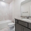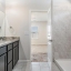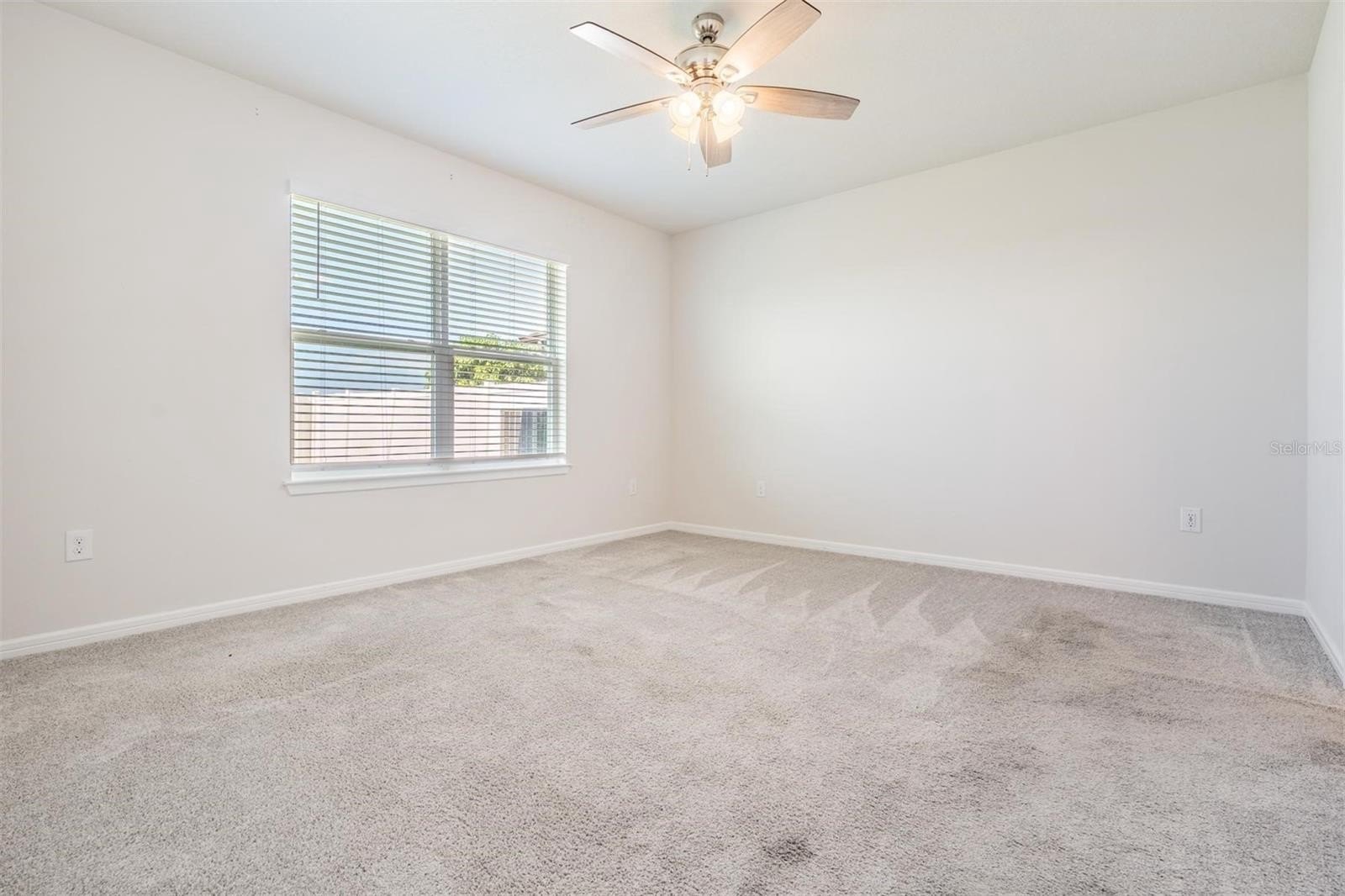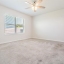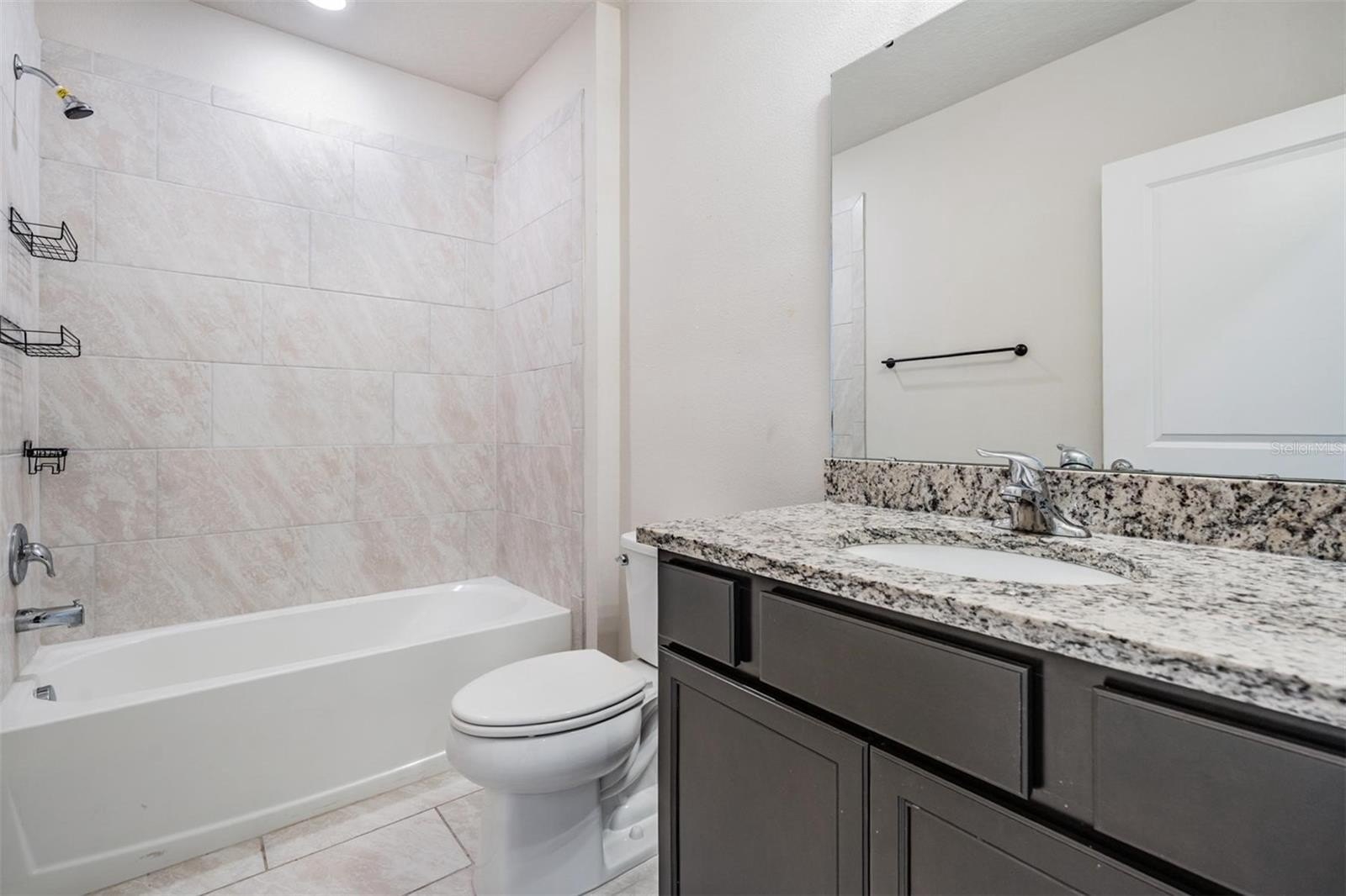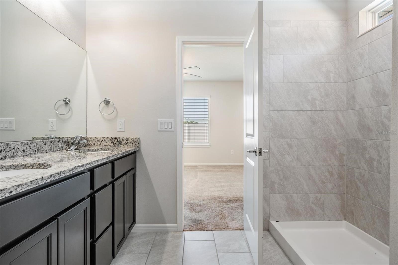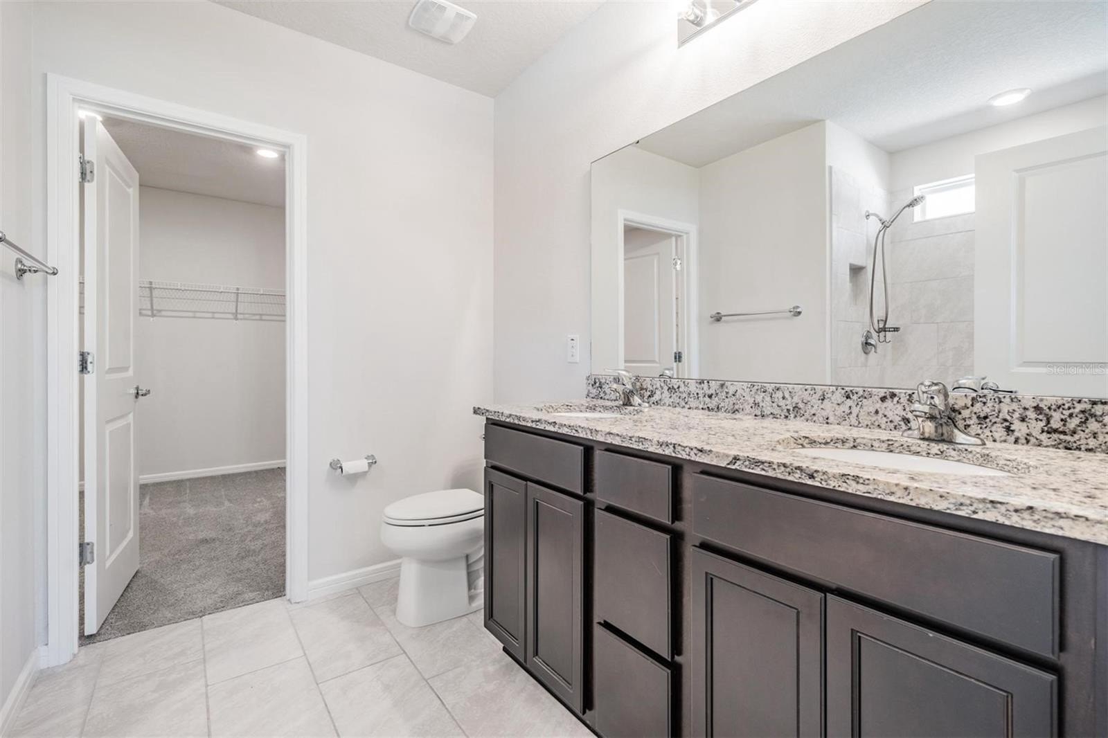 At the rear of the home, the owner’s suite offers peace and comfort with its ensuite bathroom featuring granite countertops, dual vanity, a spacious walk-in shower with ceramic tile, and a generous walk-in closet.