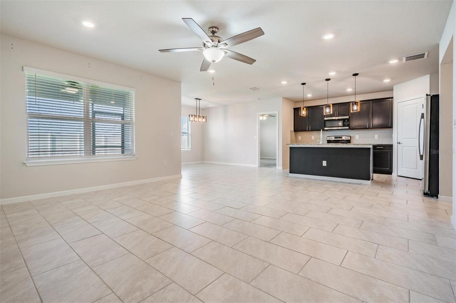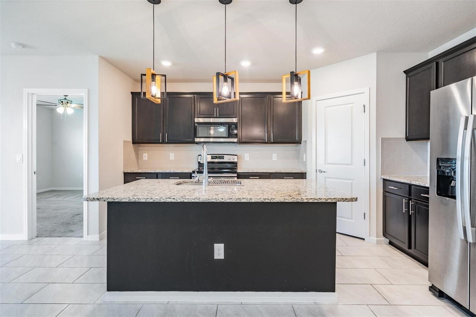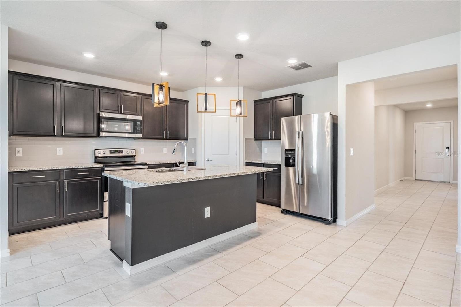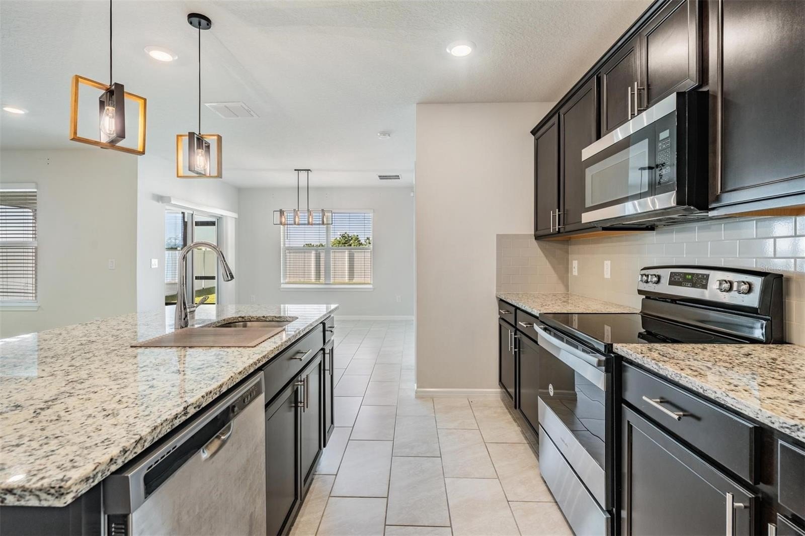 Continuing down the hallway, the home opens into a bright and welcoming kitchen overlooking the spacious living area. The kitchen features granite countertops, a sizeable island with modern pendant lighting, and all appliances included—built-in dishwasher, electric range, and microwave—making everyday meals and entertaining effortless. Just off to the side, the dining room is perfectly positioned with backyard views, creating a cozy spot for family dinners or morning coffee. From here, sliding doors lead to a covered lanai and large fenced backyard, the perfect place to relax in privacy and enjoy Florida’s beautiful sunsets.