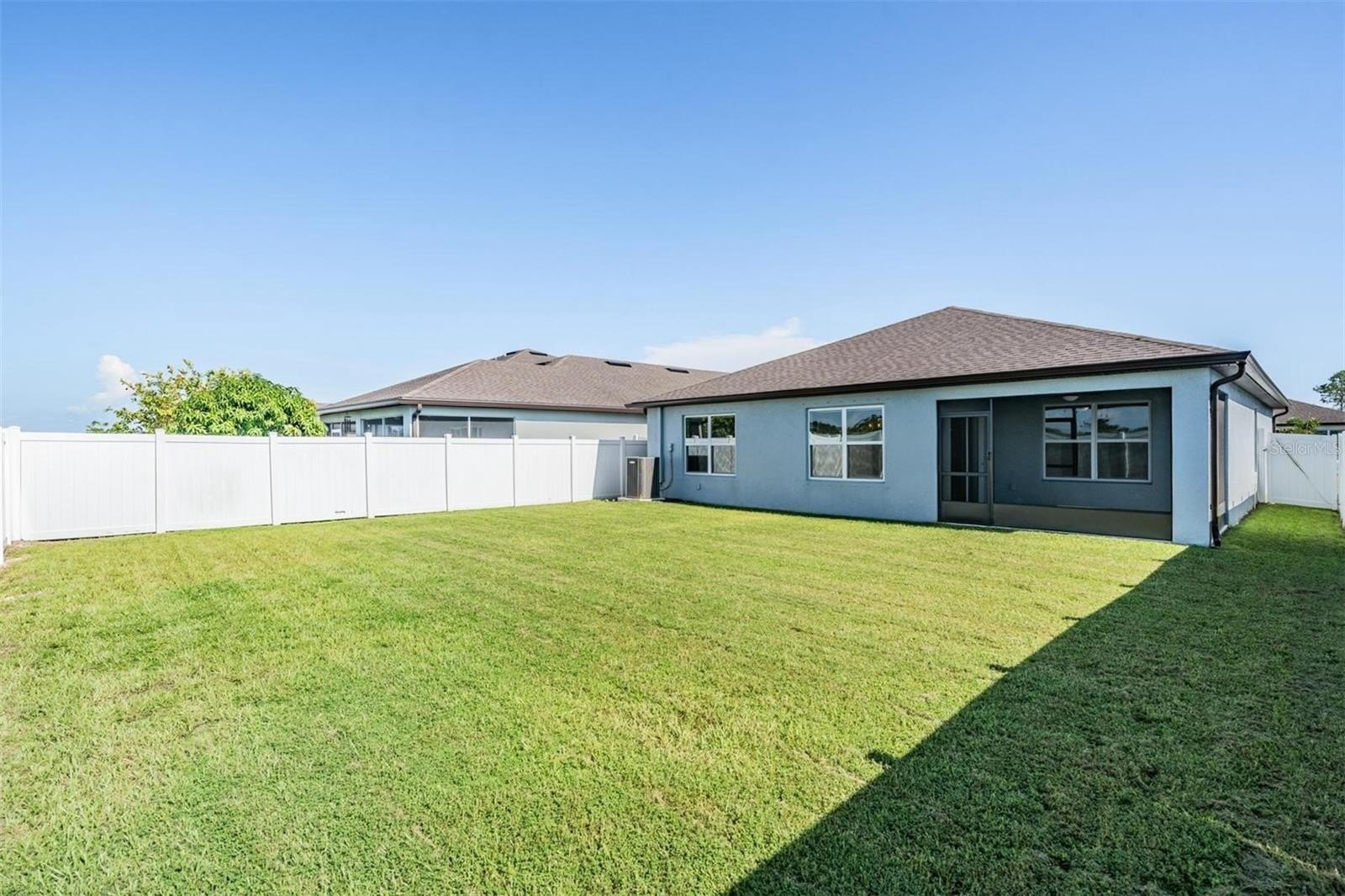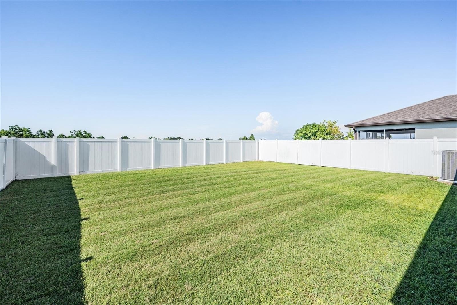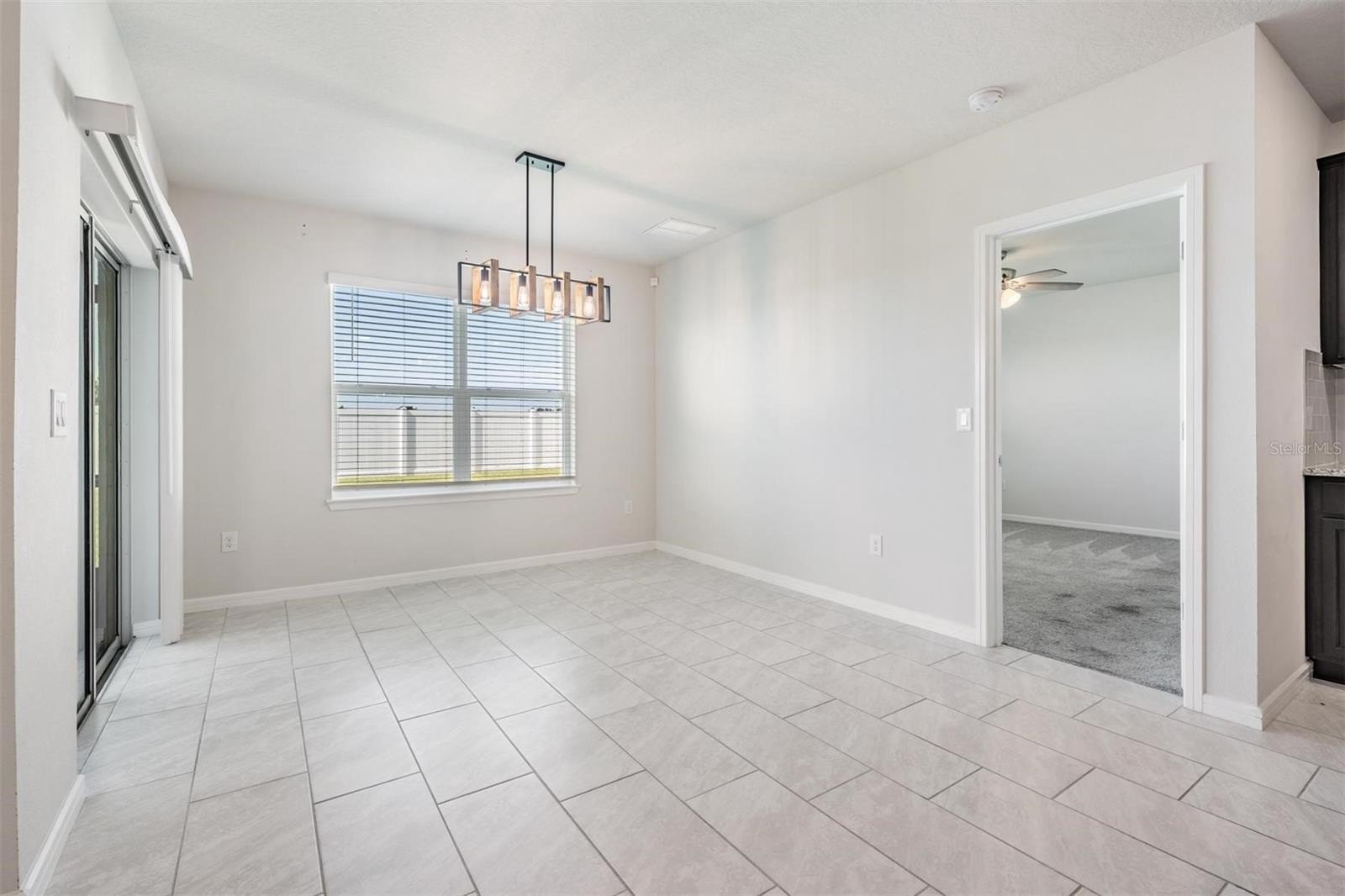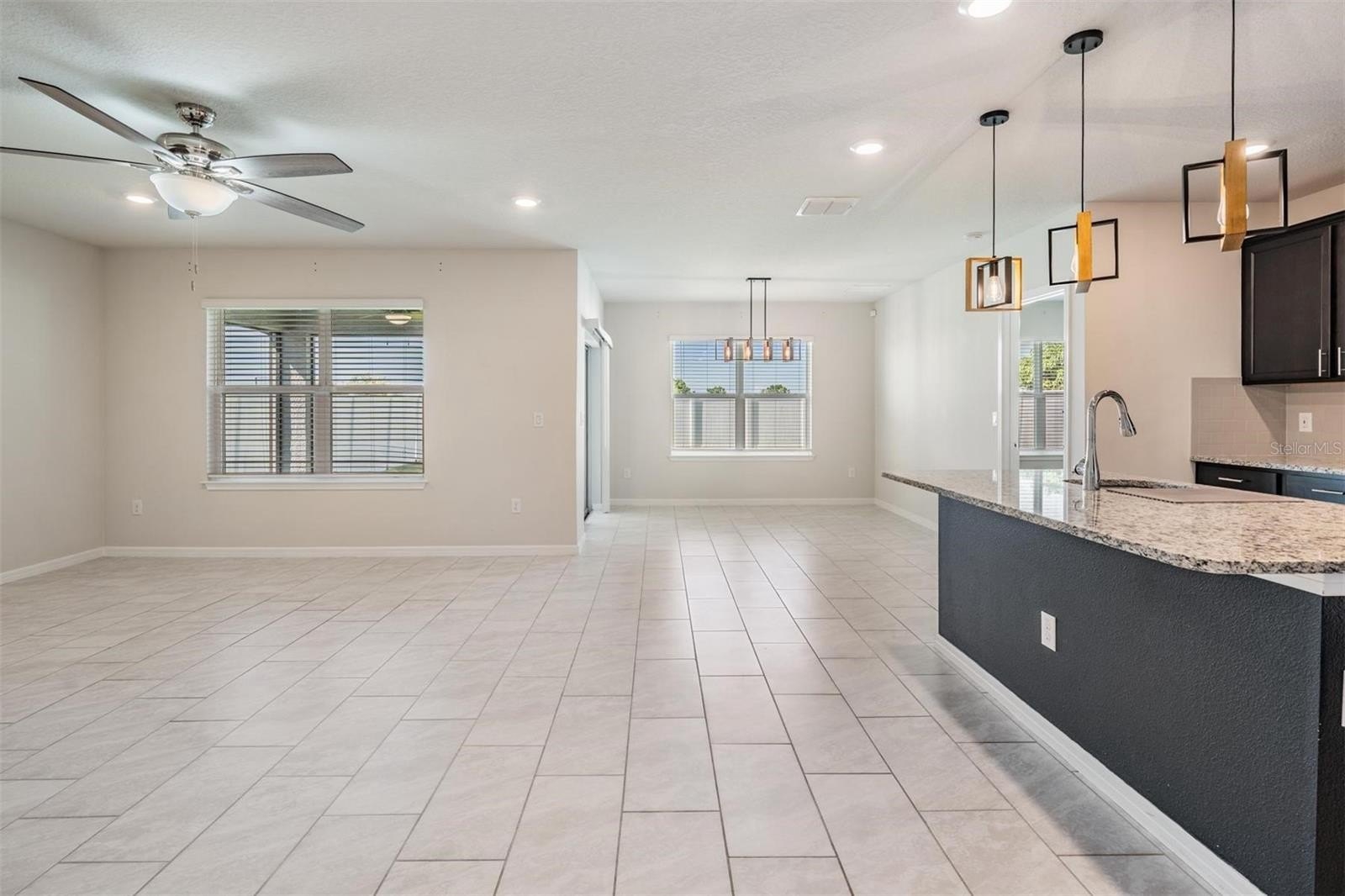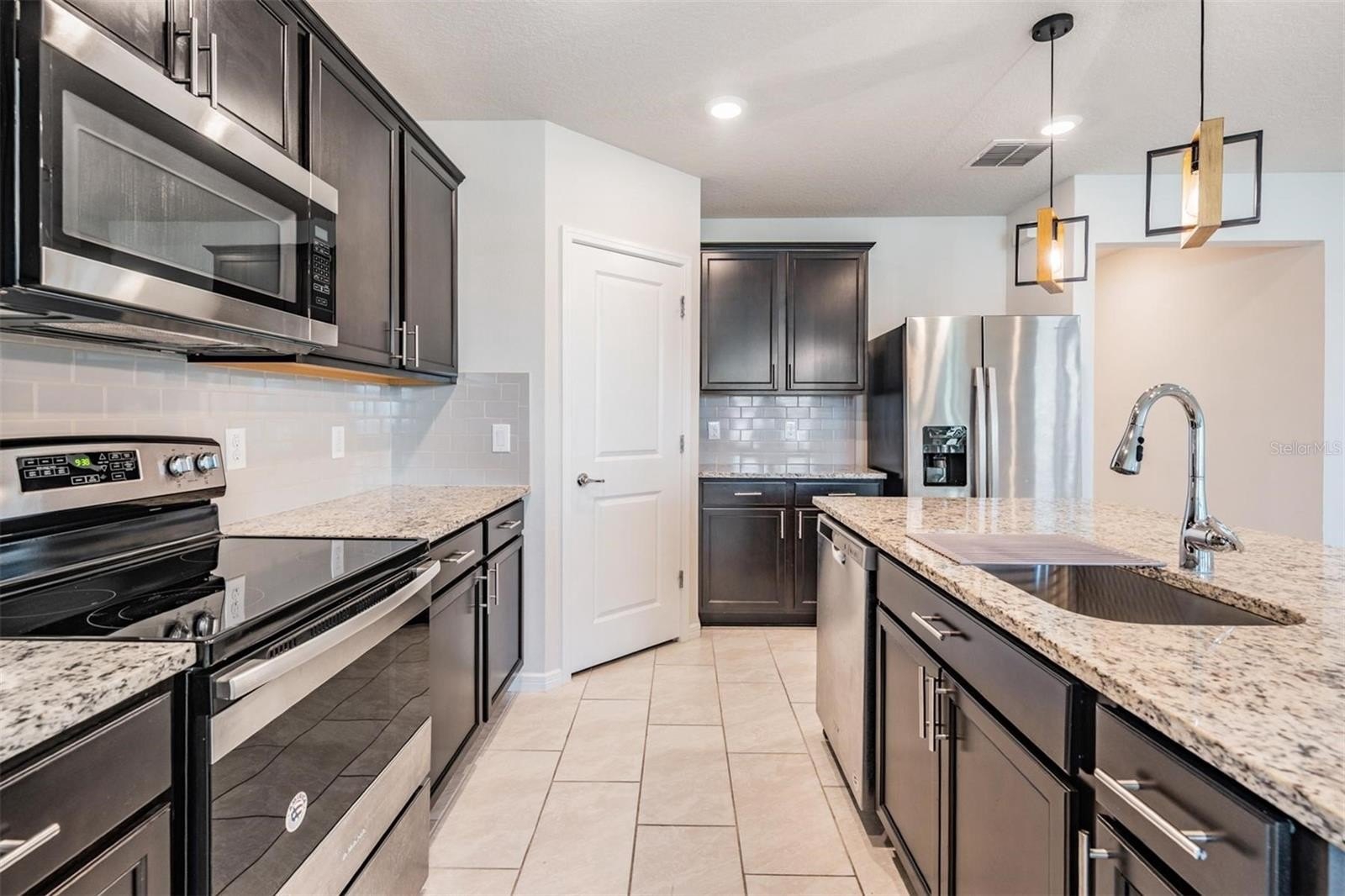 Continuing down the hallway, the home opens into a bright and welcoming kitchen overlooking the spacious living area. The kitchen features granite countertops, a sizeable island with modern pendant lighting, and all appliances included—built-in dishwasher, electric range, and microwave—making everyday meals and entertaining effortless. Just off to the side, the dining room is perfectly positioned with backyard views, creating a cozy spot for family dinners or morning coffee. From here, sliding doors lead to a covered lanai and large fenced backyard, the perfect place to relax in privacy and enjoy Florida’s beautiful sunsets.