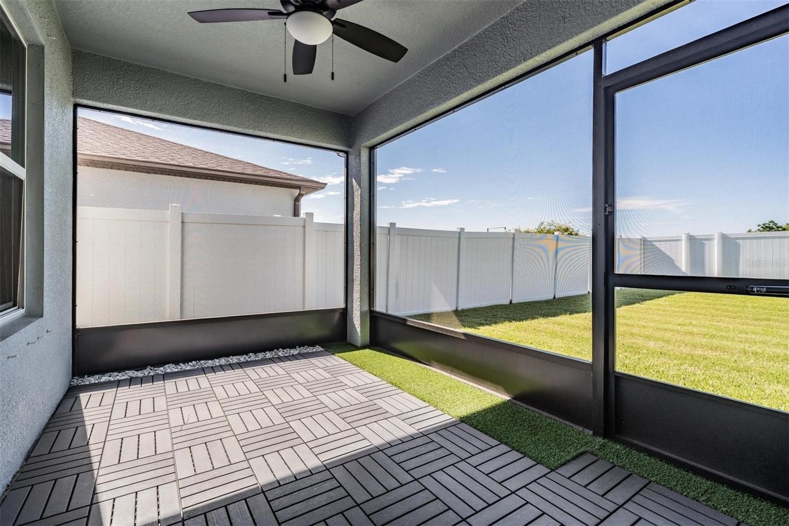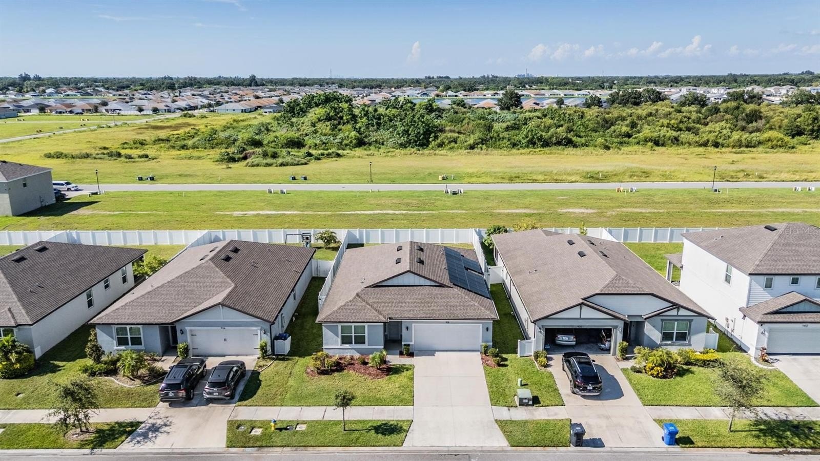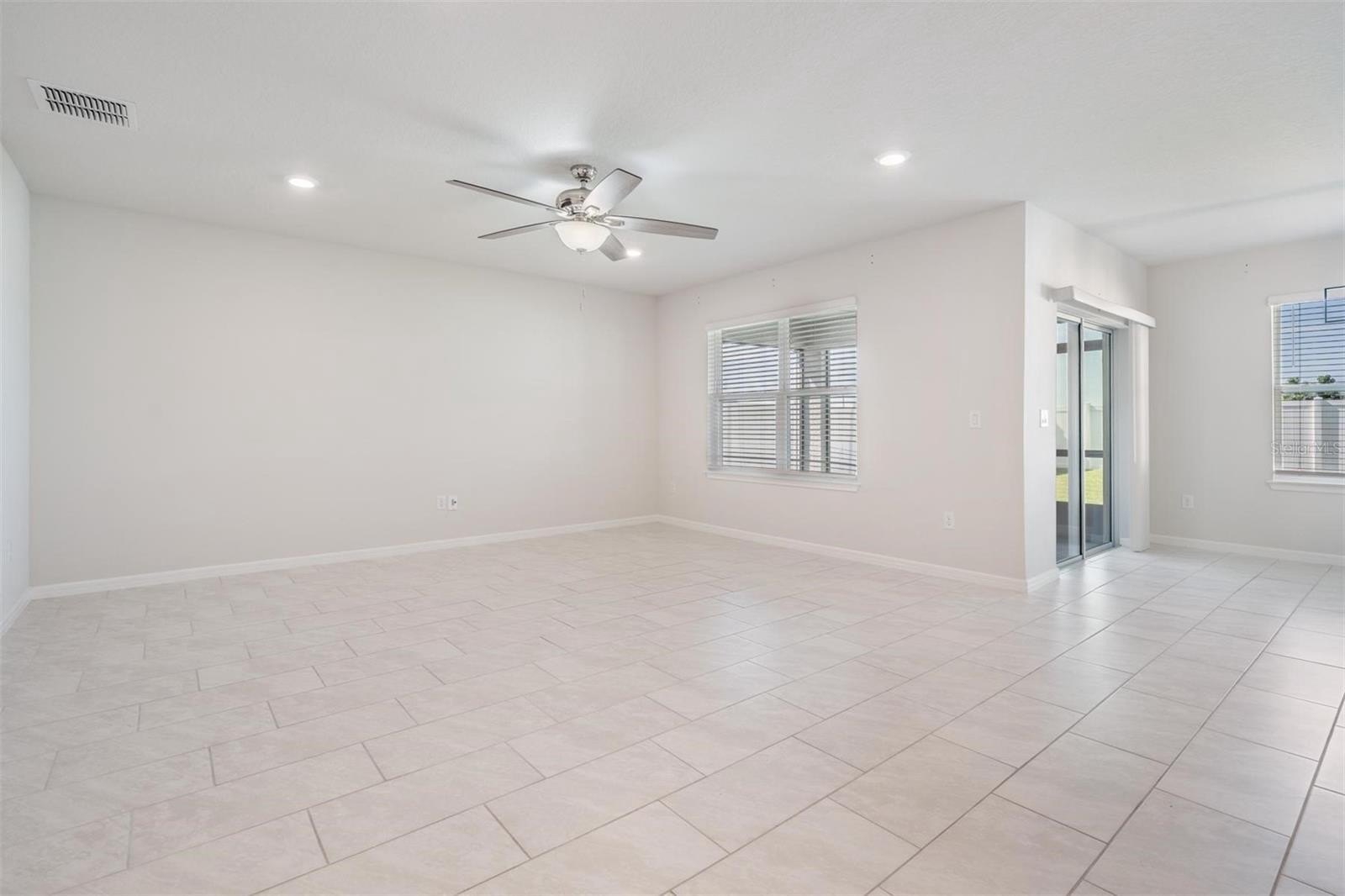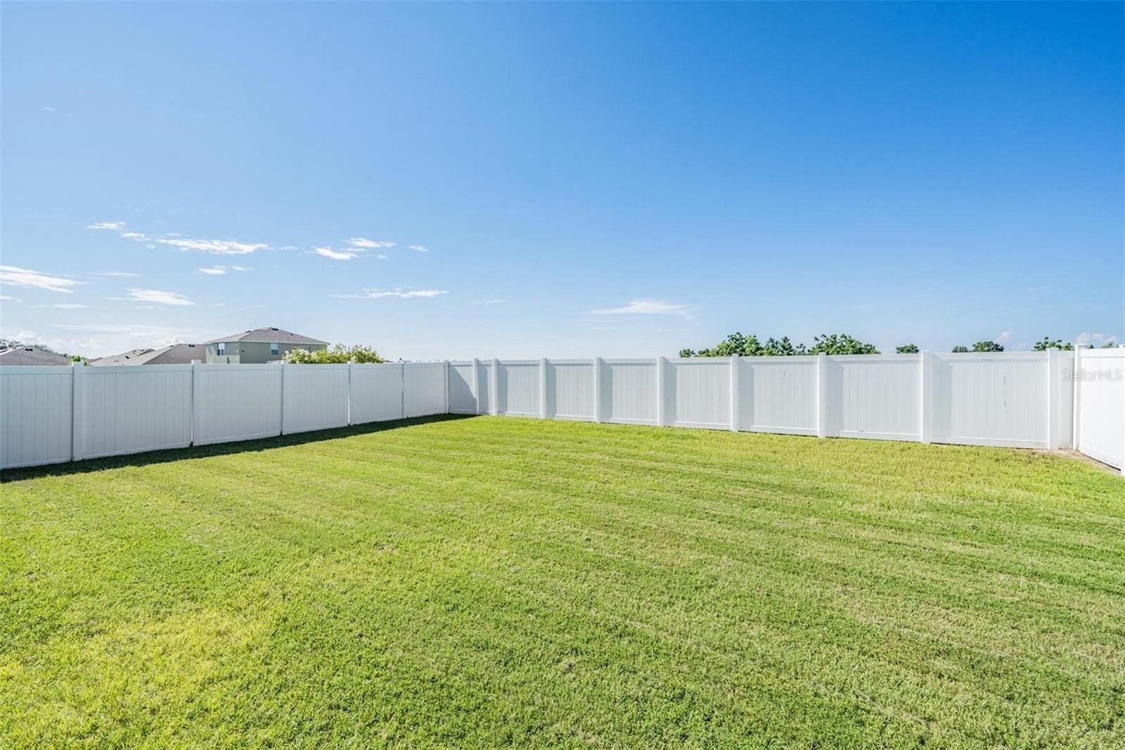 Continuing down the hallway, the home opens into a bright and welcoming kitchen overlooking the spacious living area. The kitchen features granite countertops, a sizeable island with modern pendant lighting, and all appliances included—built-in dishwasher, electric range, and microwave—making everyday meals and entertaining effortless. Just off to the side, the dining room is perfectly positioned with backyard views, creating a cozy spot for family dinners or morning coffee. From here, sliding doors lead to a covered lanai and large fenced backyard, the perfect place to relax in privacy and enjoy Florida’s beautiful sunsets.