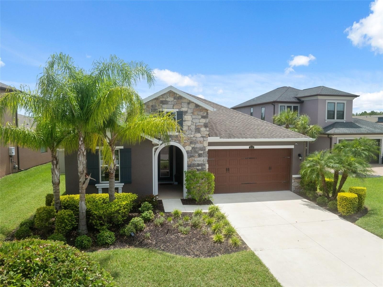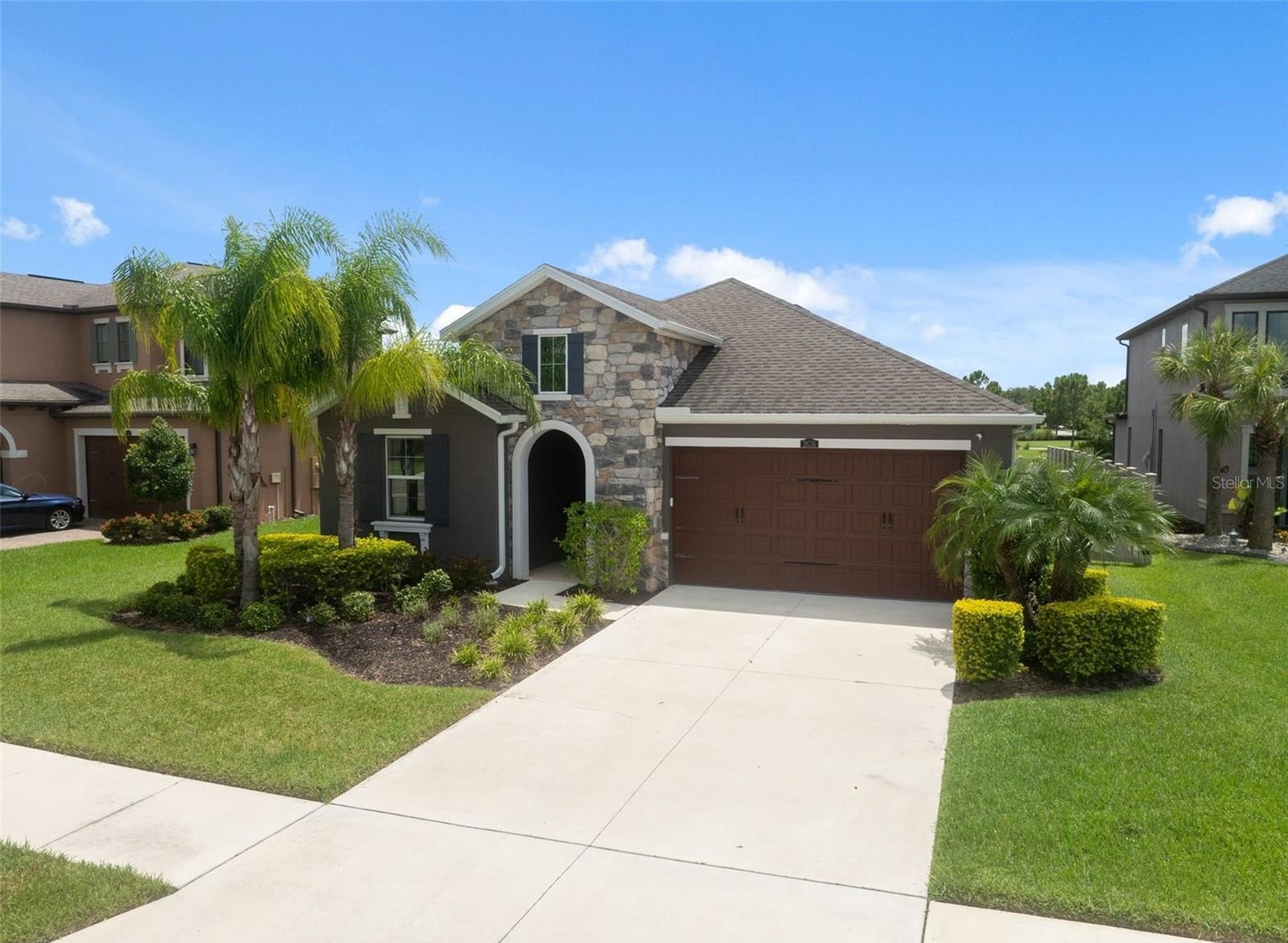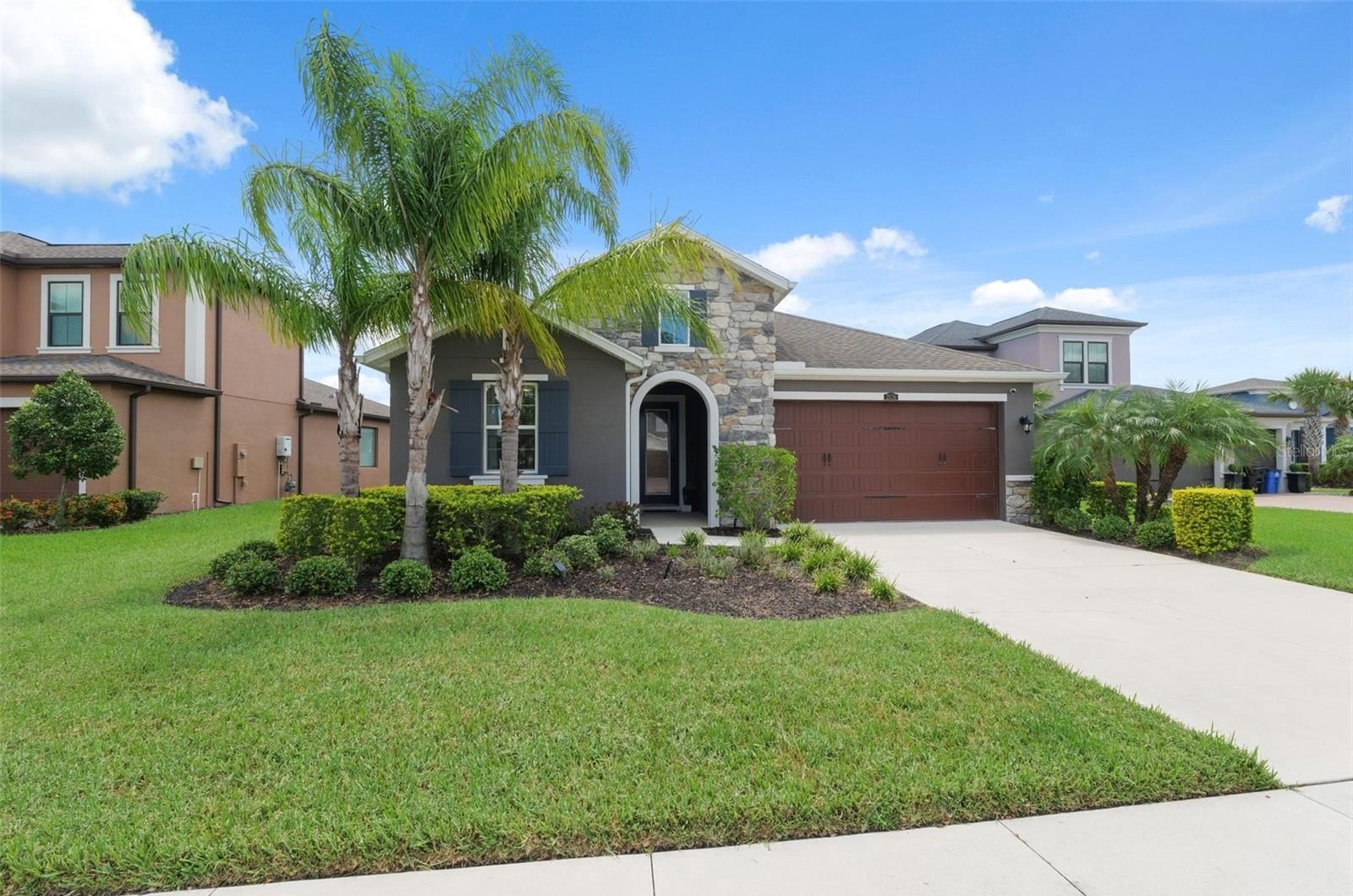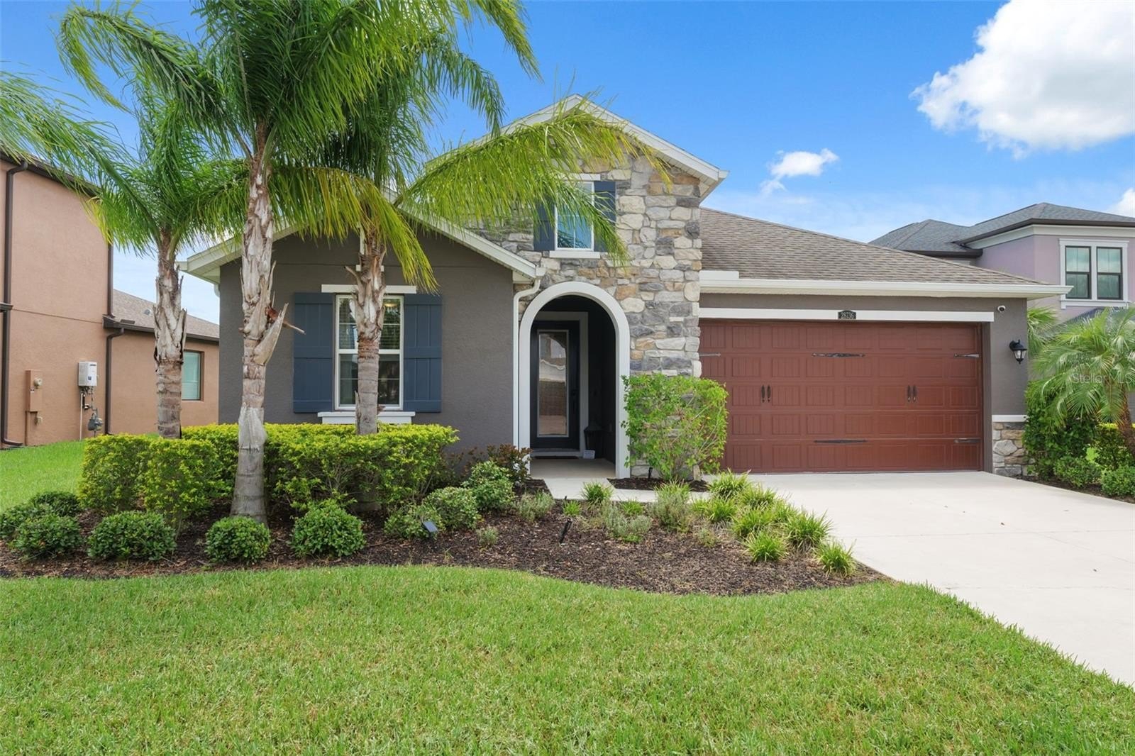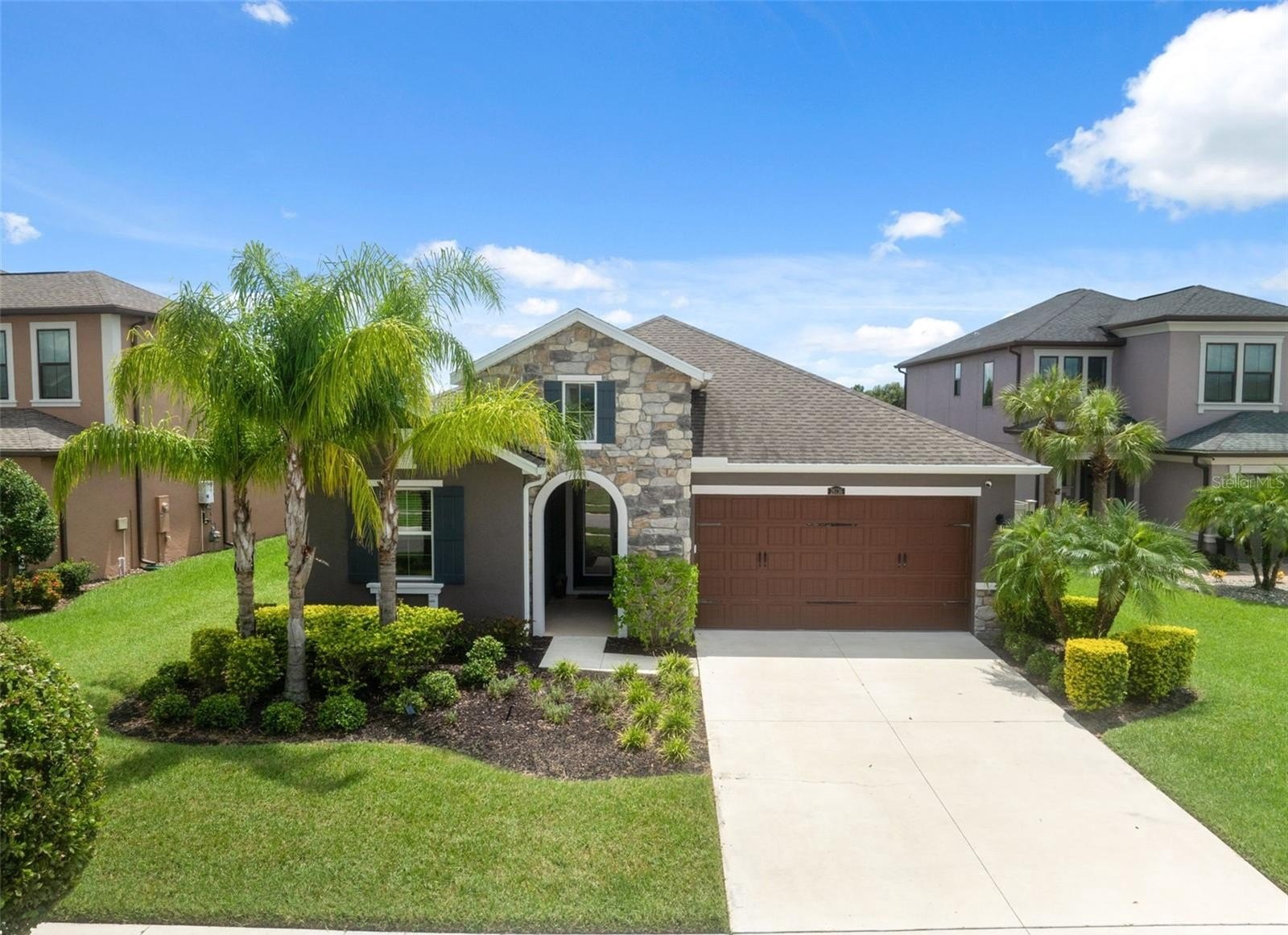 Welcome to this stunning single-story WATERFRONT home featuring 3 bedrooms + office + 3 full bathrooms in the highly sought-after Estancia at Wiregrass Ranch. Built by CalAtlantic, this home offers extensive builder and owner upgrades that elevate both style and functionality. Designed with both comfort and sophistication in mind, the open layout offers airy spaces filled with natural light and crown moulding . Situated on a cul-de-sac road, enjoy serene pond views from the expansive covered lanai, perfect for outdoor relaxation and entertaining. The upgraded chef’s kitchen overlooks the family room and dining area, showcasing max-tier cabinetry, quartz countertops, a farm sink, soft-close drawers and doors, Whirlpool smart oven/microwave, NEW stainless steel dishwasher, a mini refrigerator with quartz cabinetry surround, plus a water filtration system—all powered by gas. Additional highlights include wood-look tile flooring, upgraded front entry door with keypad lock, Ring camera, upgraded glass pantry and office doors, alarm system, finished laundry room with washer and dryer included, and a pull-down ladder in the garage for attic access. The home is also equipped with plumbing for an outdoor kitchen and a car charger for hybrid vehicles. Bedrooms feature StainMaster upgraded carpets, and the owner’s suite offers spa-inspired finishes. Fully fenced yard perfect for pets and privacy. With thoughtful details like designer lighting, smart features, and timeless finishes throughout, this home is truly move-in ready. Located in the gated Cortona section, residents enjoy world-class amenities including a grand clubhouse, resort-style pool with water slide, tennis and pickleball courts, dog parks, walking trails, and more—all just minutes from top-rated schools, shopping, dining, and major highways. Schedule your private showing today!