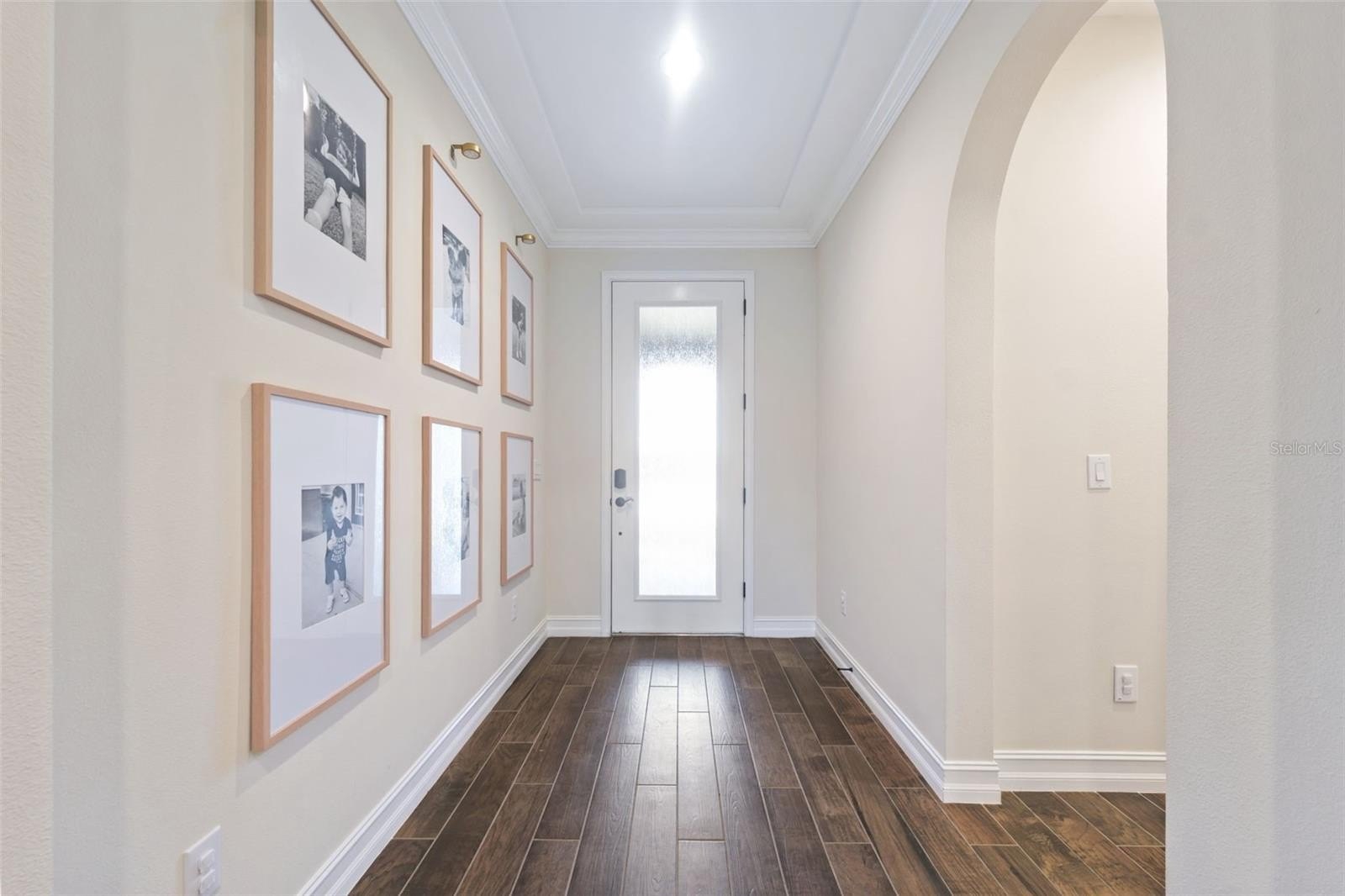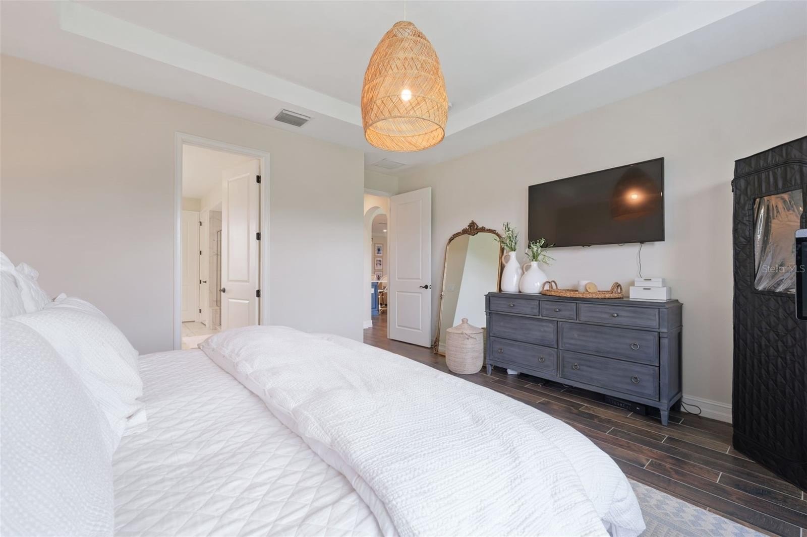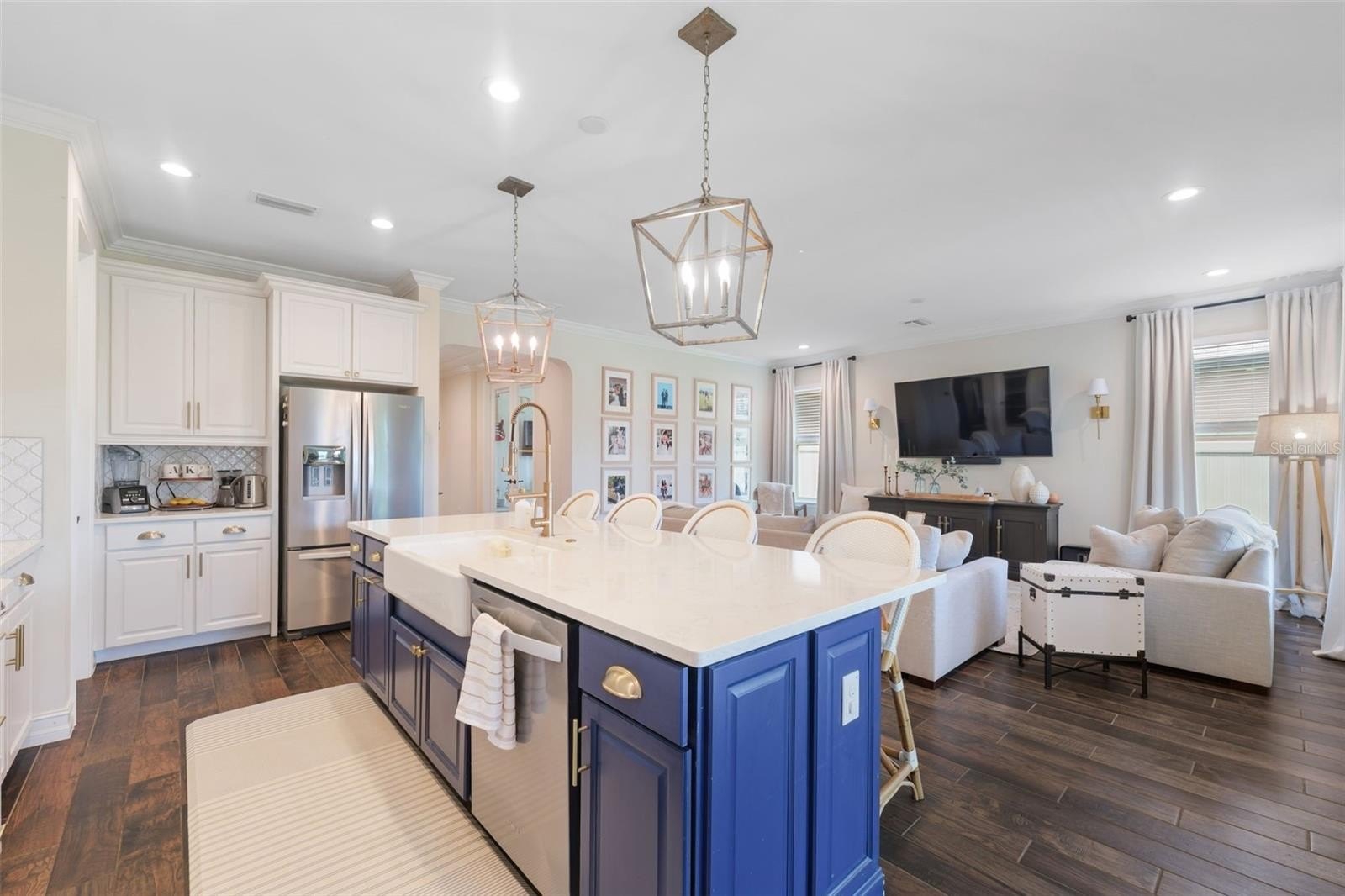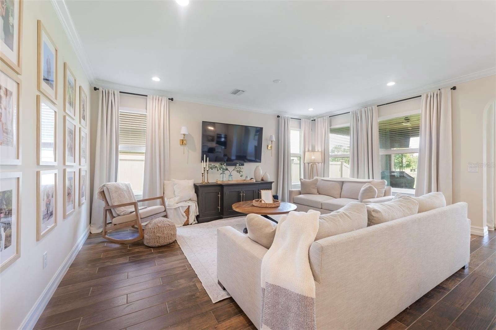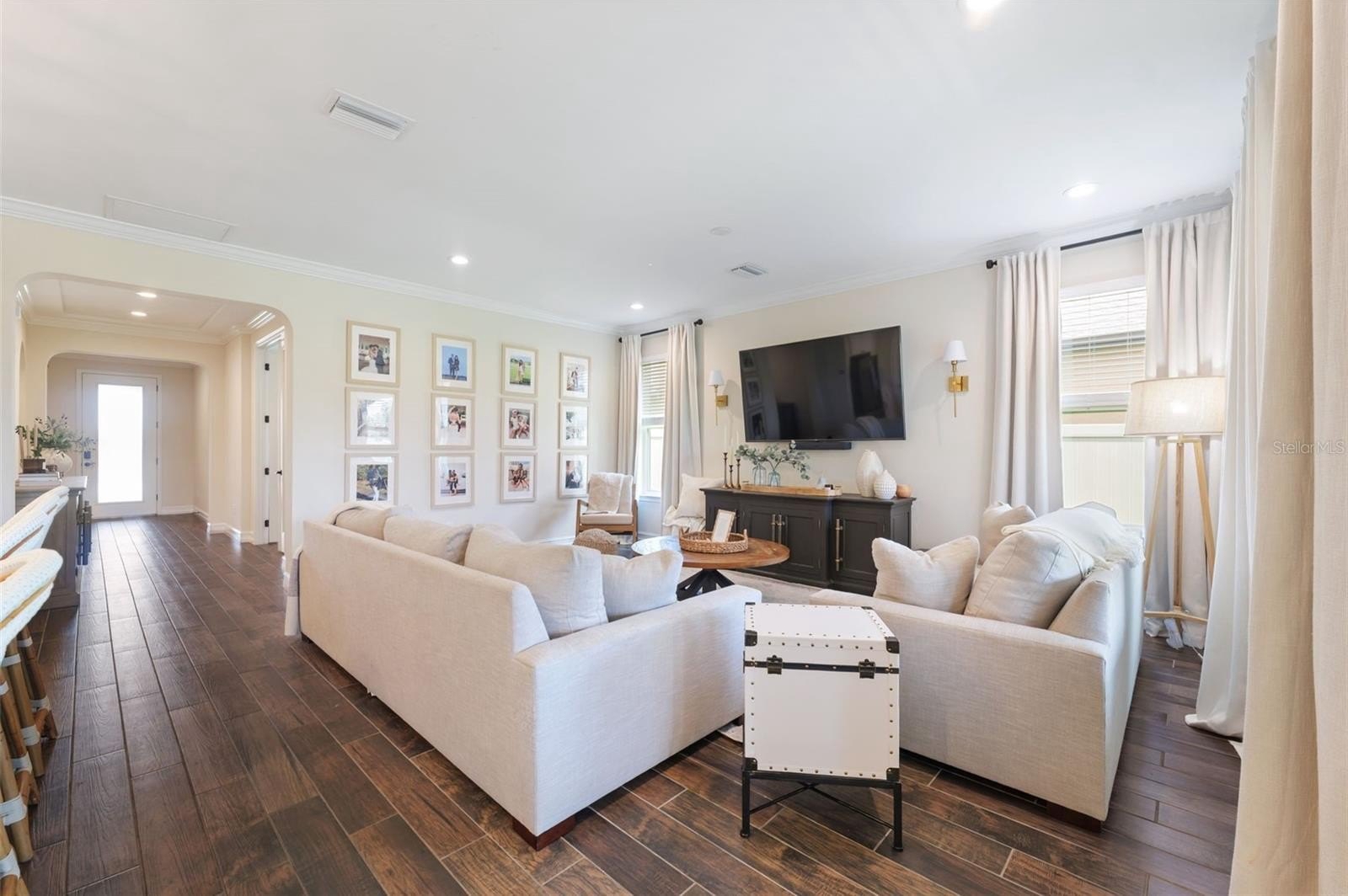 Welcome to this stunning single-story WATERFRONT home featuring 3 bedrooms + office + 3 full bathrooms in the highly sought-after Estancia at Wiregrass Ranch. Built by CalAtlantic, this home offers extensive builder and owner upgrades that elevate both style and functionality. Designed with both comfort and sophistication in mind, the open layout offers airy spaces filled with natural light and crown moulding . Situated on a cul-de-sac road, enjoy serene pond views from the expansive covered lanai, perfect for outdoor relaxation and entertaining. The upgraded chef’s kitchen overlooks the family room and dining area, showcasing max-tier cabinetry, quartz countertops, a farm sink, soft-close drawers and doors, Whirlpool smart oven/microwave, NEW stainless steel dishwasher, a mini refrigerator with quartz cabinetry surround, plus a water filtration system—all powered by gas. Additional highlights include wood-look tile flooring, upgraded front entry door with keypad lock, Ring camera, upgraded glass pantry and office doors, alarm system, finished laundry room with washer and dryer included, and a pull-down ladder in the garage for attic access. The home is also equipped with plumbing for an outdoor kitchen and a car charger for hybrid vehicles. Bedrooms feature StainMaster upgraded carpets, and the owner’s suite offers spa-inspired finishes. Fully fenced yard perfect for pets and privacy. With thoughtful details like designer lighting, smart features, and timeless finishes throughout, this home is truly move-in ready. Located in the gated Cortona section, residents enjoy world-class amenities including a grand clubhouse, resort-style pool with water slide, tennis and pickleball courts, dog parks, walking trails, and more—all just minutes from top-rated schools, shopping, dining, and major highways. Schedule your private showing today!