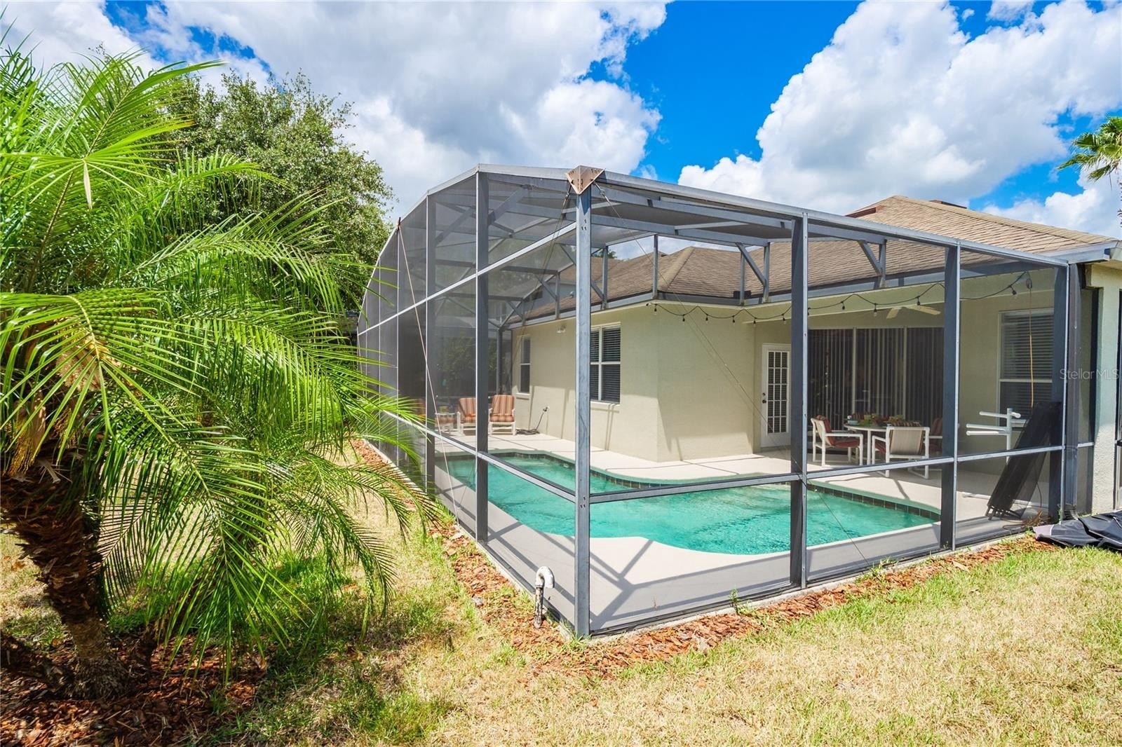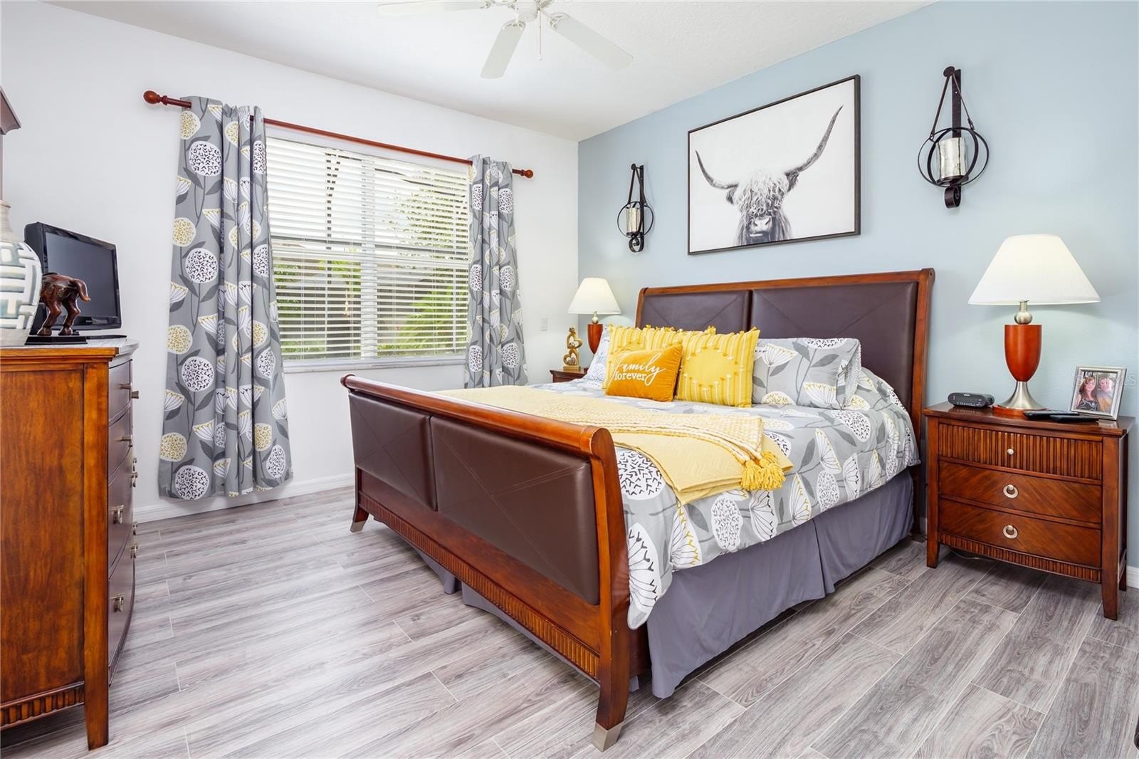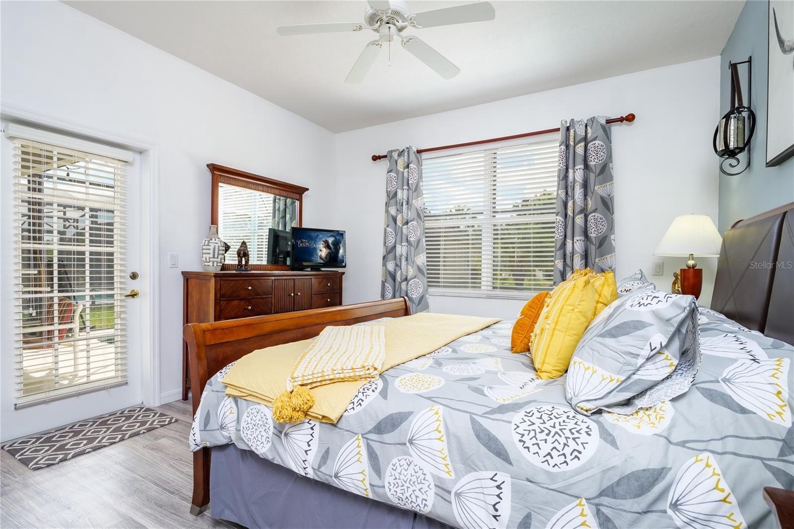 This home offers the convenience of two primary suites. The main retreat includes a walk-in closet and a spa-inspired bathroom with dual vanities, a garden tub, and a walk-in shower. The second suite also boasts direct pool access, creating a private oasis for guests. The outdoor space is a highlight, with a screened-in, heated pool with lighting, all new pool netting (May 2025), and a covered patio—perfect for enjoying Florida living.