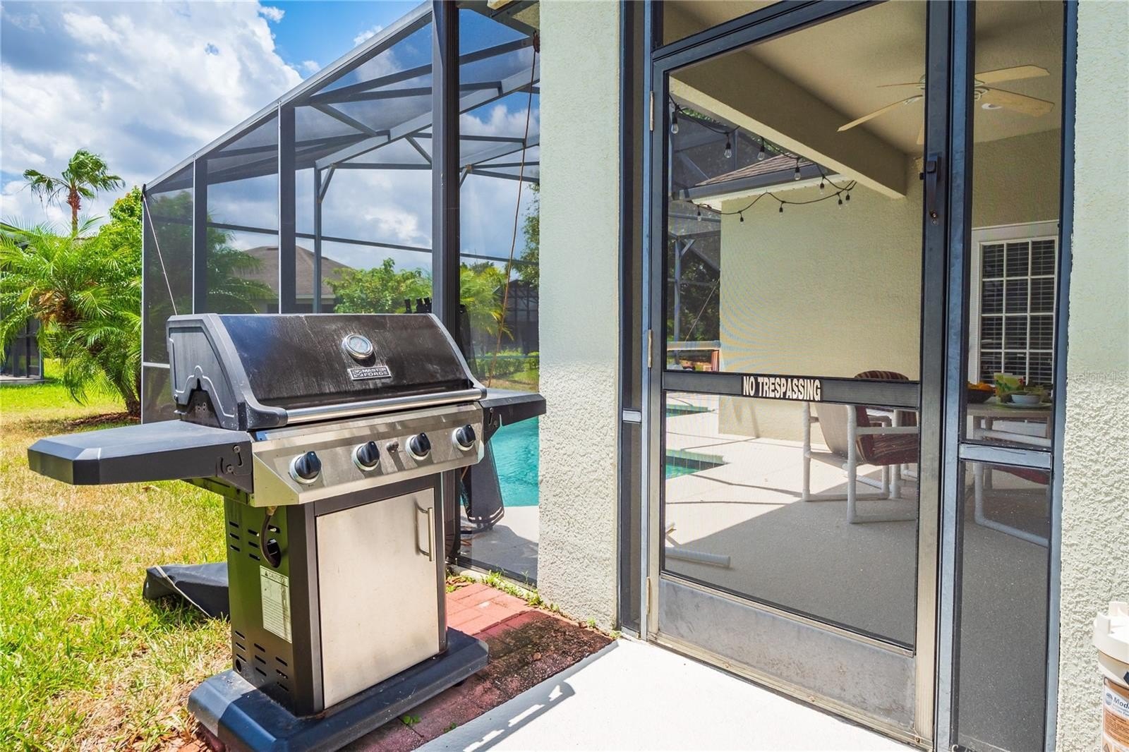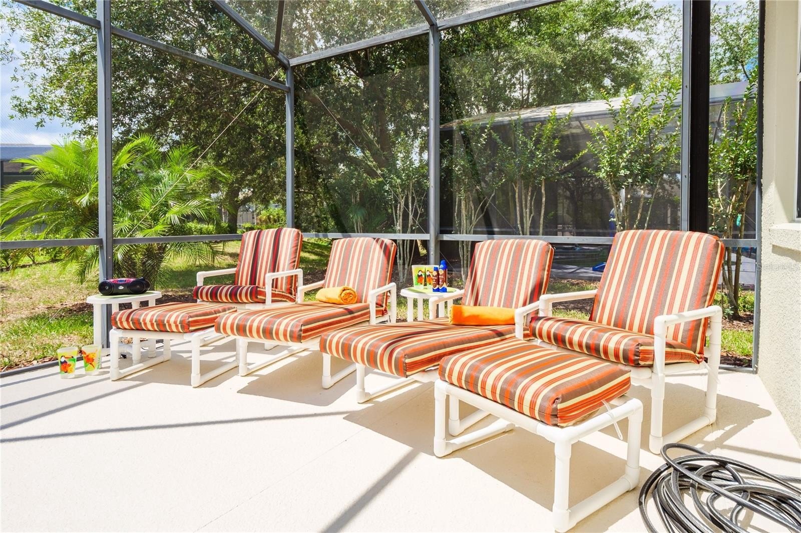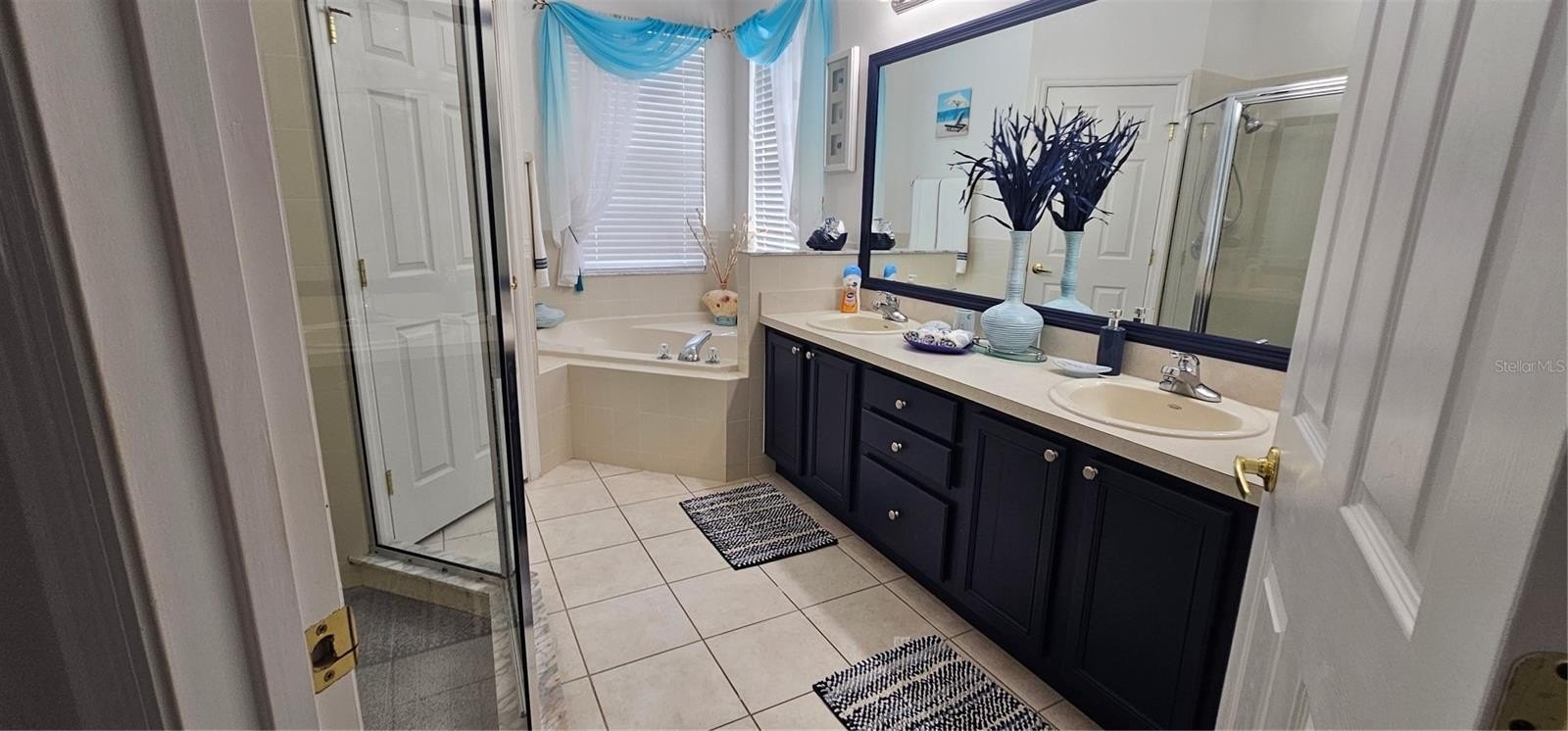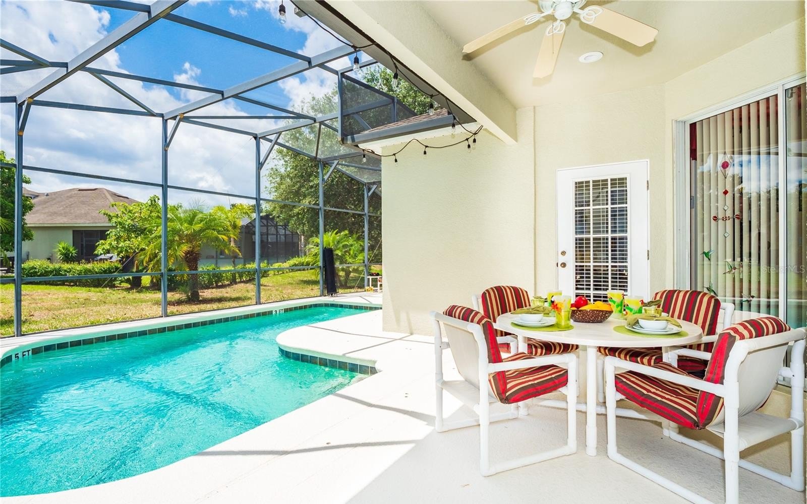 This home offers the convenience of two primary suites. The main retreat includes a walk-in closet and a spa-inspired bathroom with dual vanities, a garden tub, and a walk-in shower. The second suite also boasts direct pool access, creating a private oasis for guests. The outdoor space is a highlight, with a screened-in, heated pool with lighting, all new pool netting (May 2025), and a covered patio—perfect for enjoying Florida living.