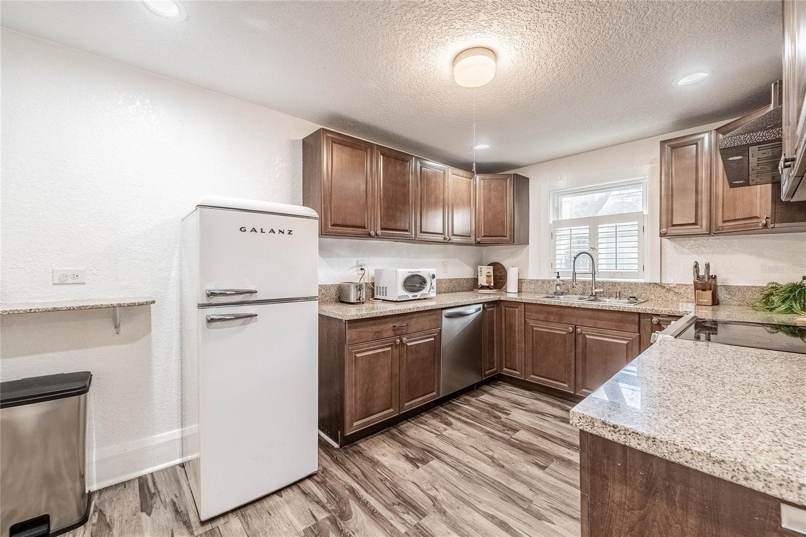 Inside, a welcoming living room with a cozy fireplace invites you to unwind, while the formal dining room sets the stage for memorable gatherings. The updated kitchen shines with rich wood cabinetry, granite countertops, and generous prep space for the home chef.