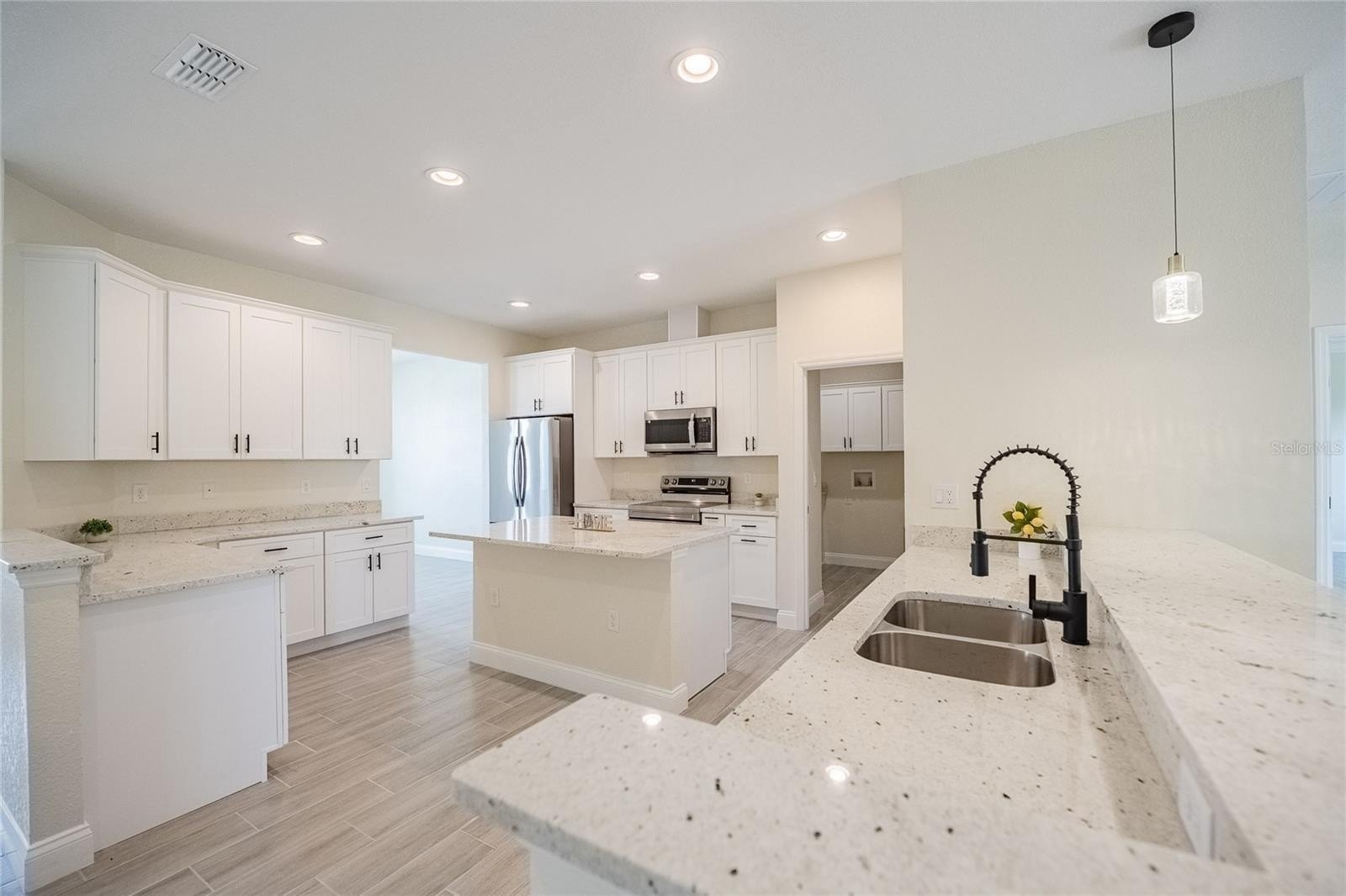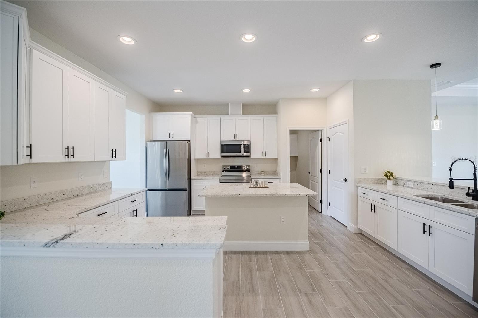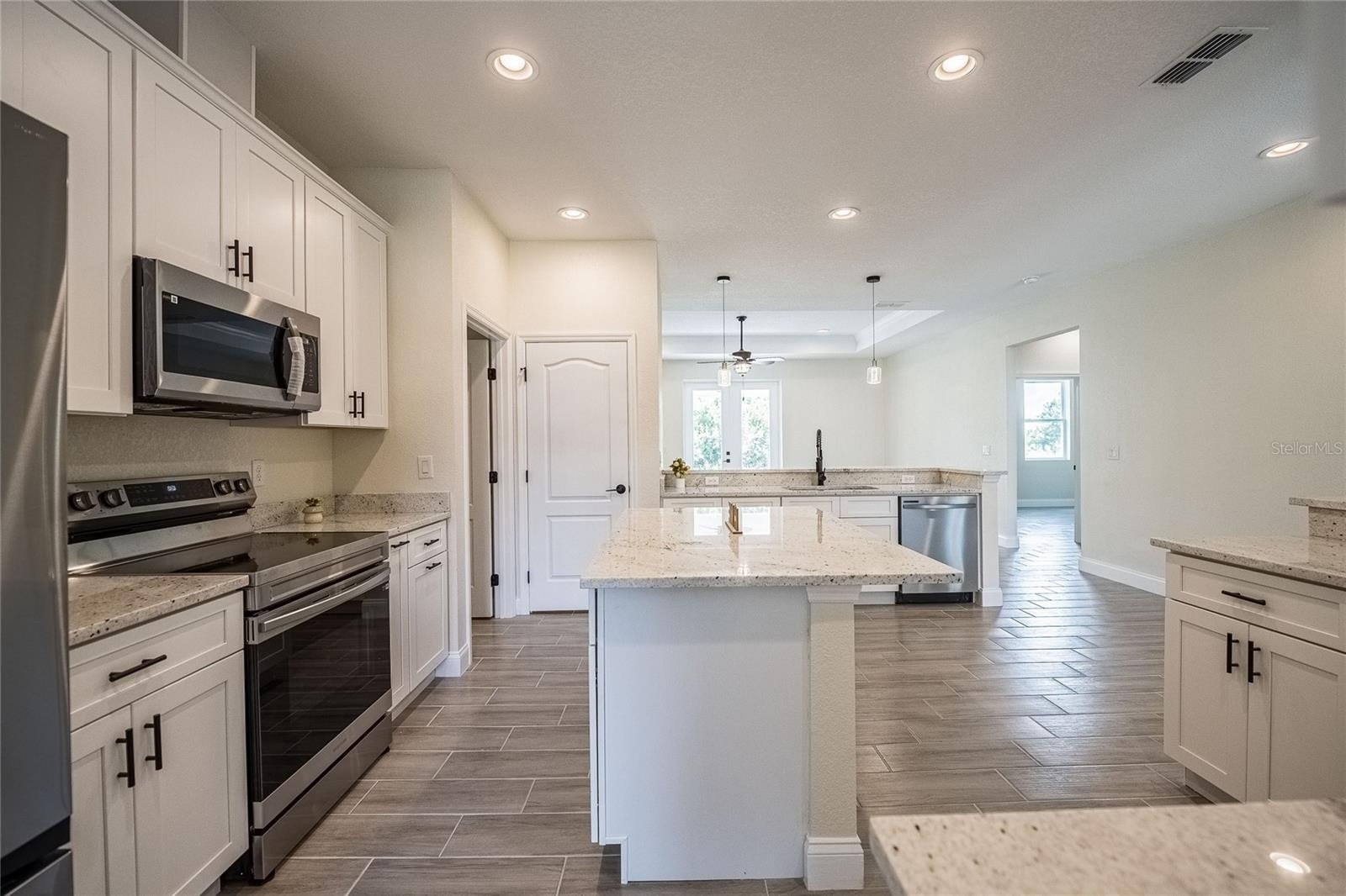 At the heart of the home is the spacious chef’s kitchen, boasting stone countertops, solid wood cabinets, stainless steel appliances, a large center island, pendant-lit breakfast bar, and a generous walk-in pantry. The split-bedroom layout ensures privacy, with the primary suite tucked away and featuring tray ceilings, a massive walk-in closet, and a luxurious en-suite bathroom with dual vanities, a soaking tub, separate shower, and private water closet.