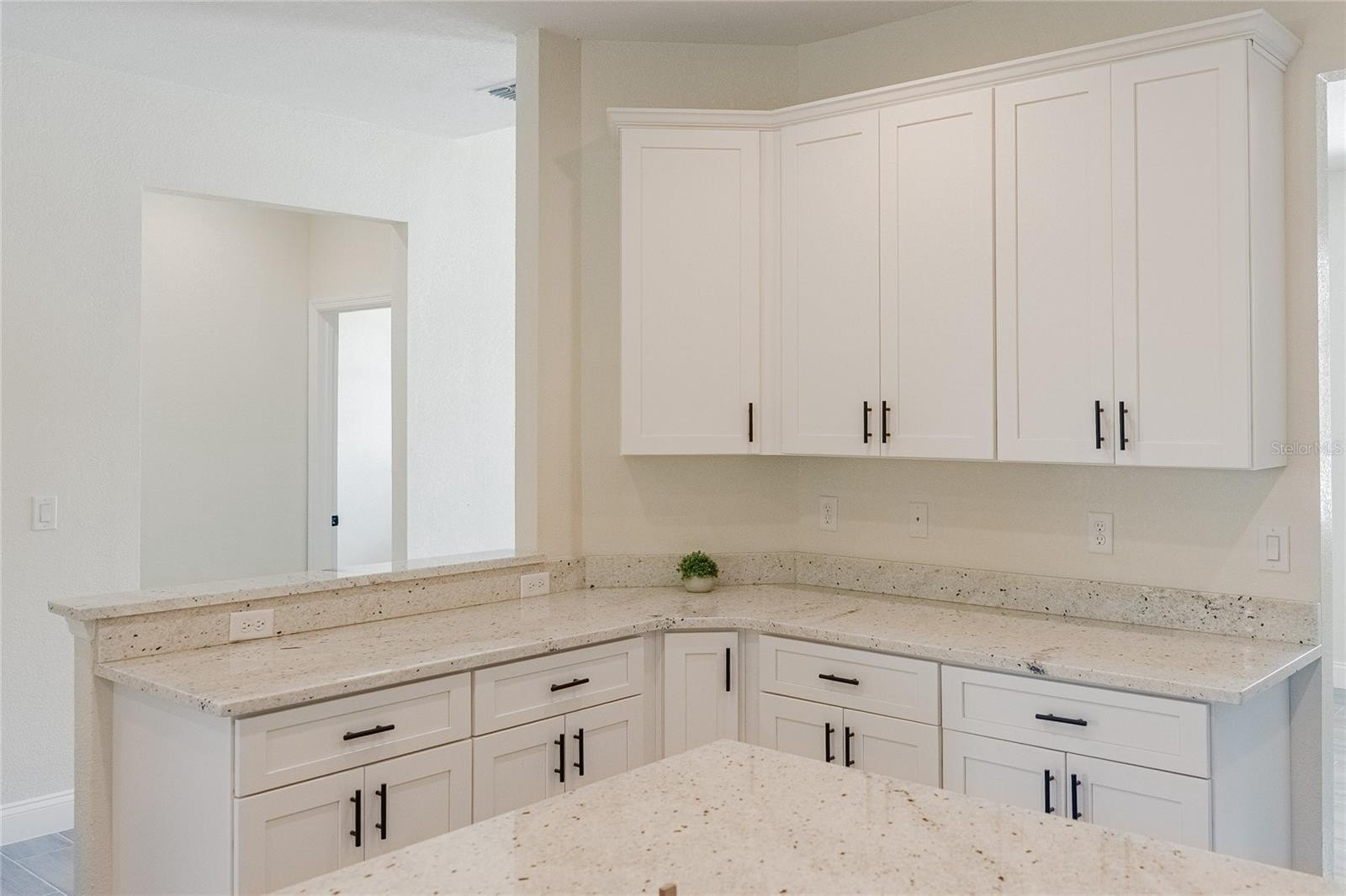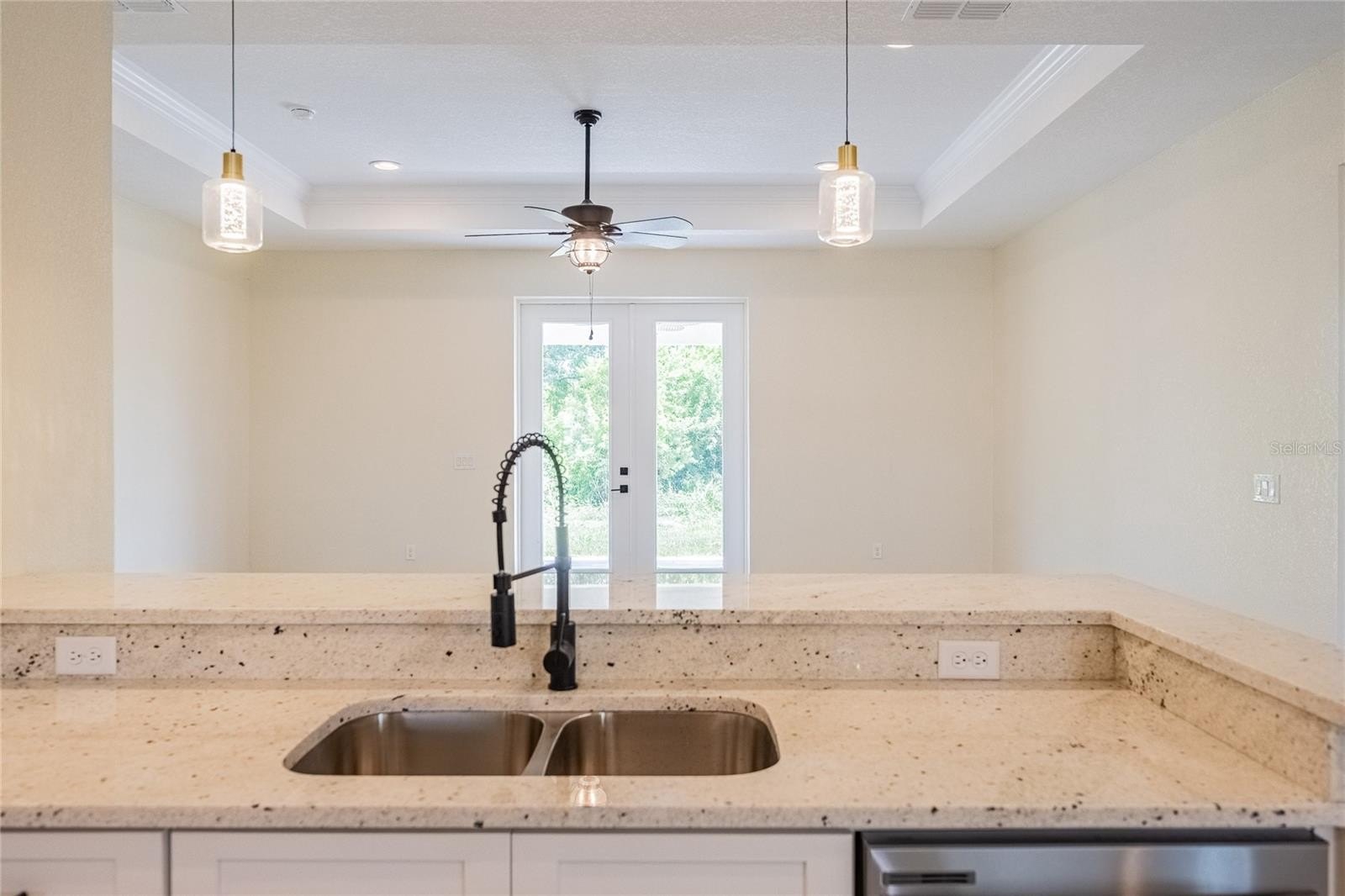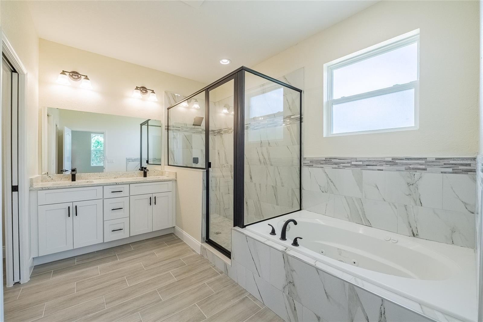 At the heart of the home is the spacious chef’s kitchen, boasting stone countertops, solid wood cabinets, stainless steel appliances, a large center island, pendant-lit breakfast bar, and a generous walk-in pantry. The split-bedroom layout ensures privacy, with the primary suite tucked away and featuring tray ceilings, a massive walk-in closet, and a luxurious en-suite bathroom with dual vanities, a soaking tub, separate shower, and private water closet.