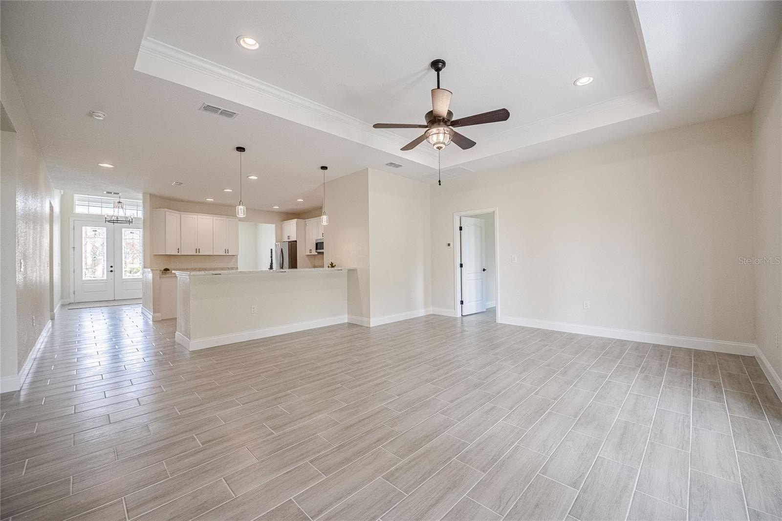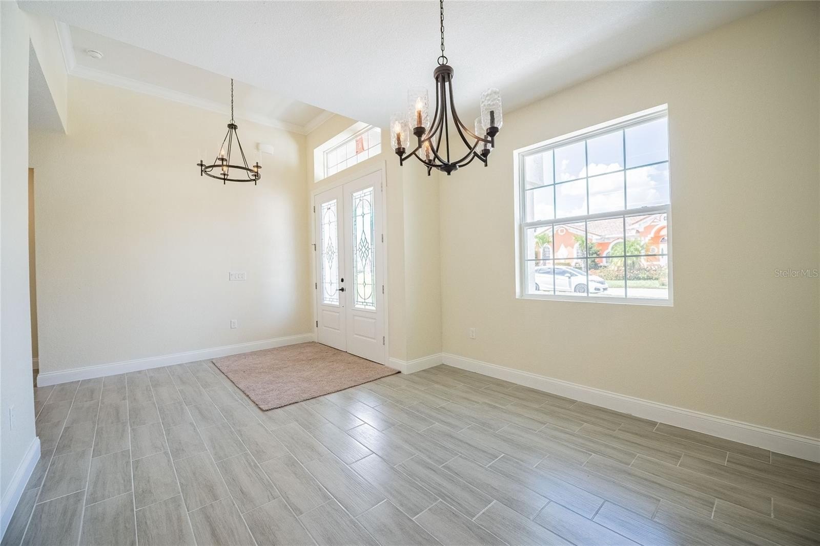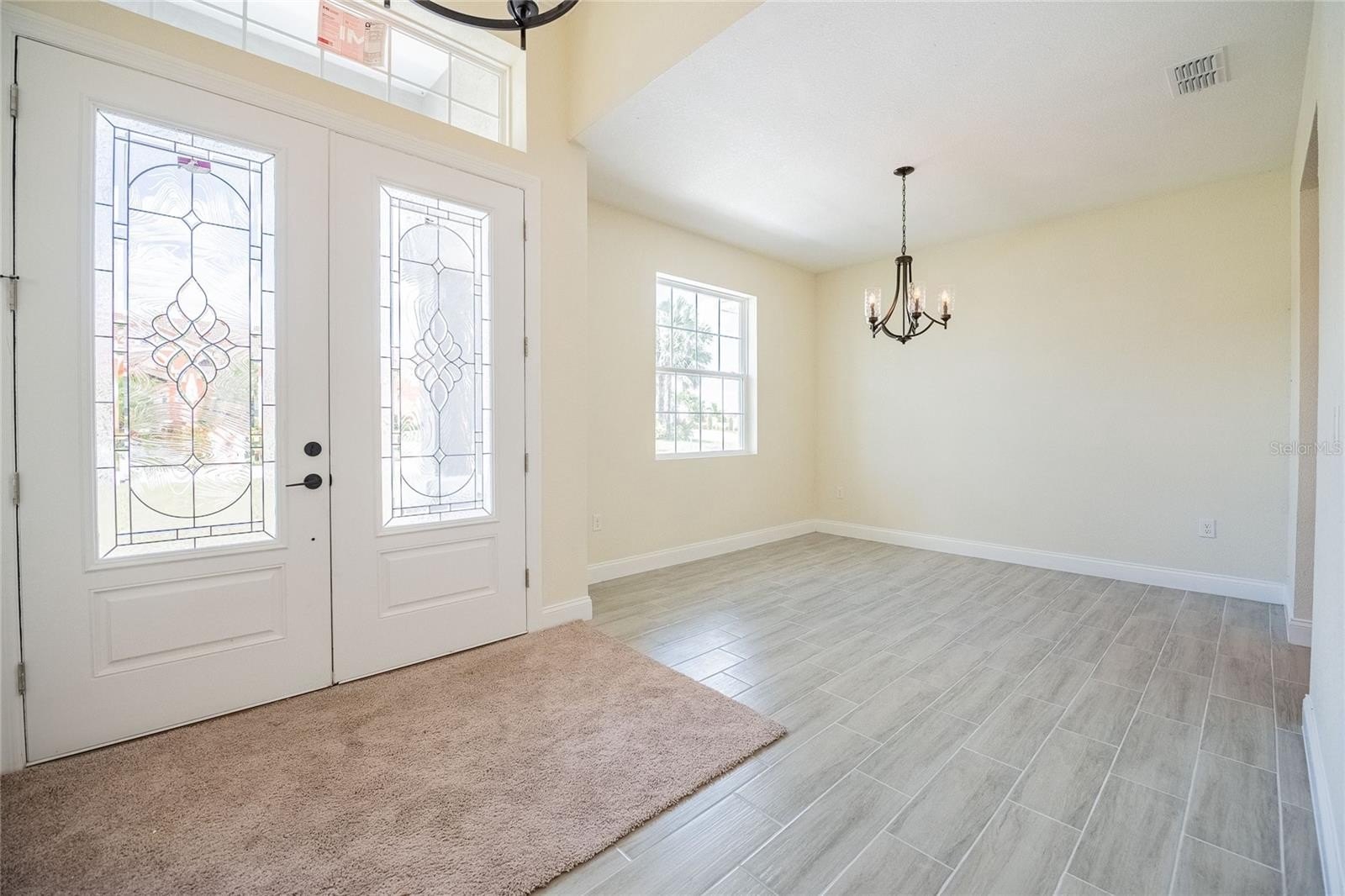 Step inside to find wood-like porcelain tile flooring throughout, high ceilings, and an open floor plan that effortlessly connects the main living areas. The formal living and dining rooms provide defined spaces for entertaining, with the dining room featuring an elegant chandelier.