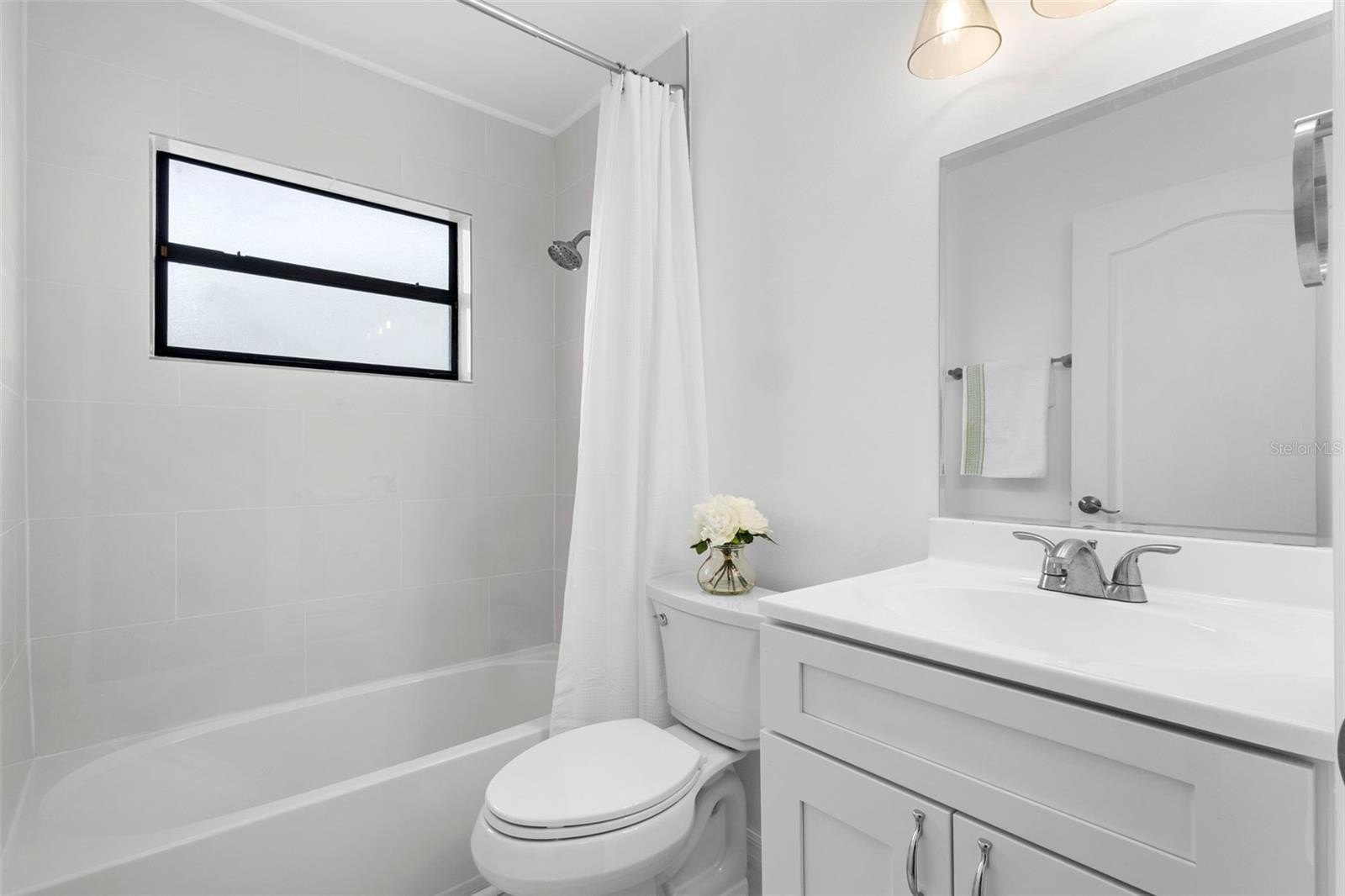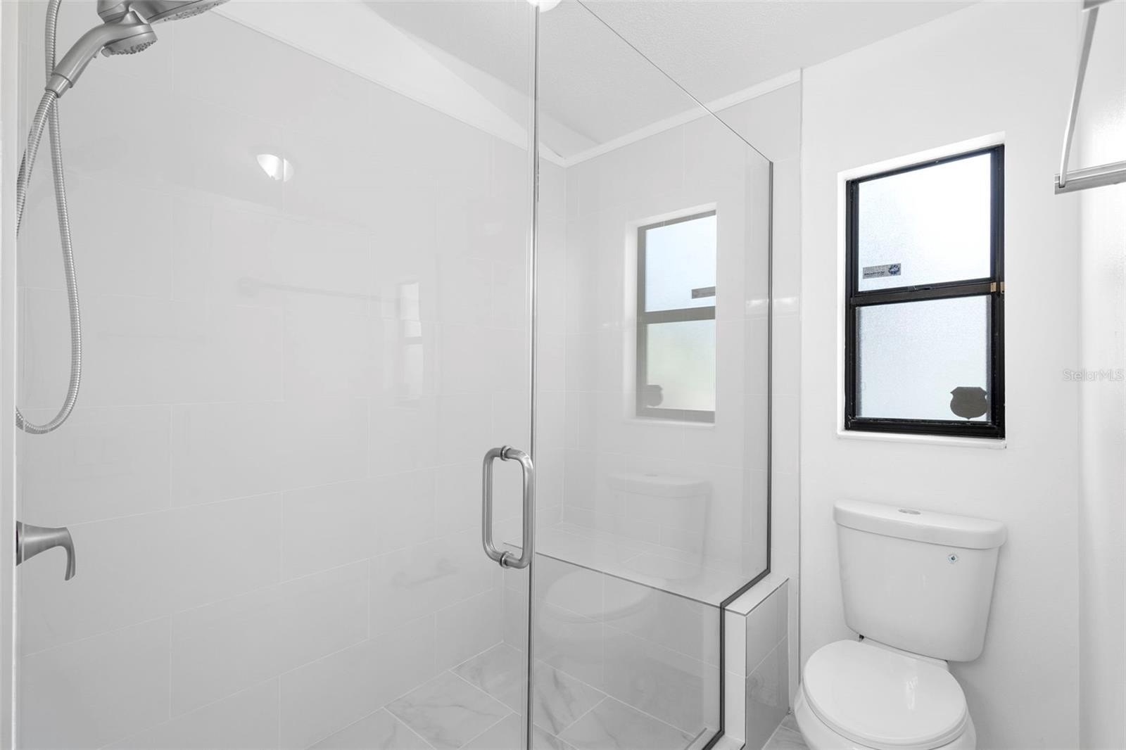 Your primary suite is a retreat in itself, with a vaulted ceiling, large walk-in closet, and an oversized spa-style shower with a built-in bench. The second bathroom is fully refreshed with a new vanity, tub, and fixtures—perfect for guests or family.