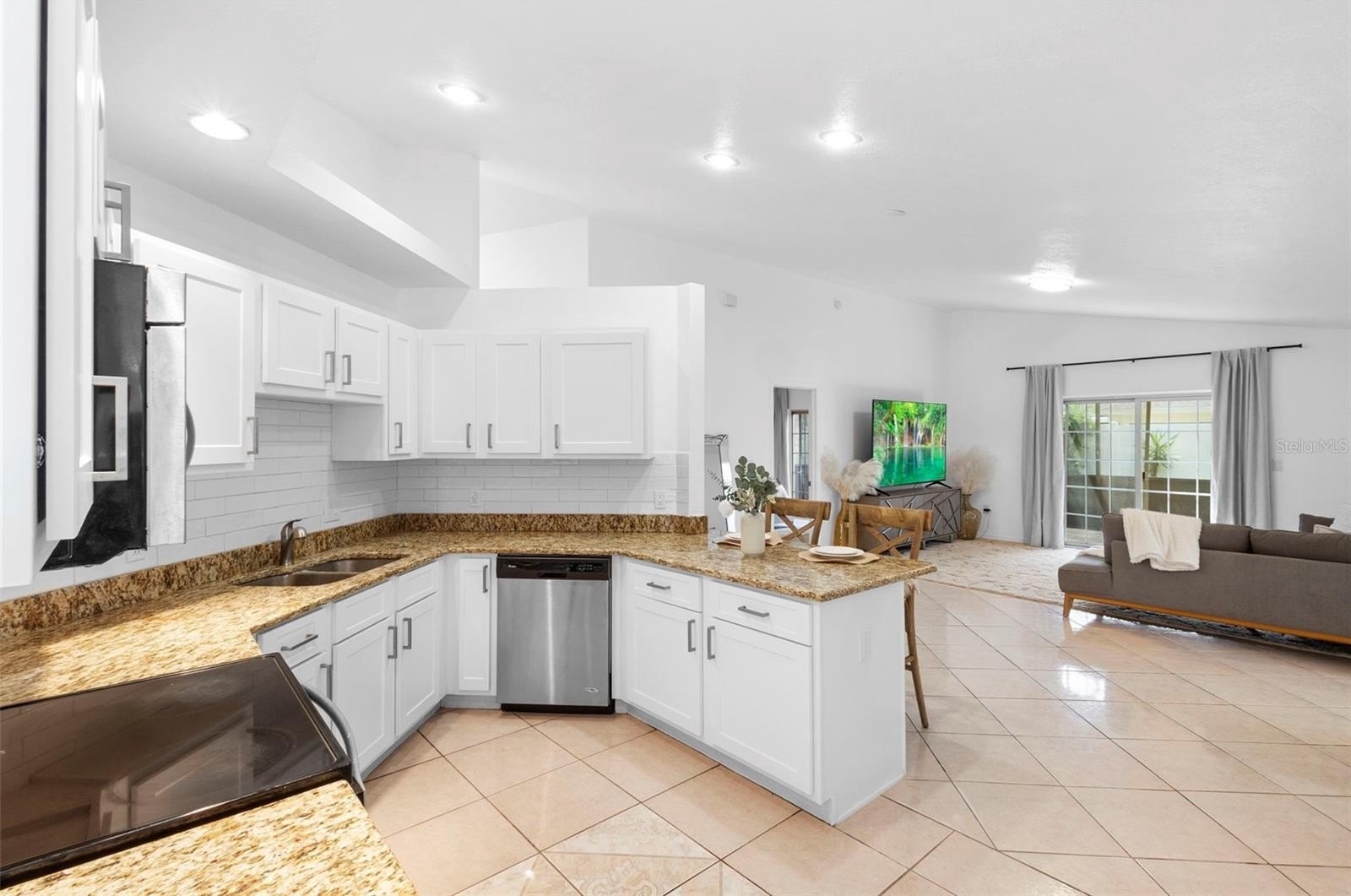 Bask in the light-filled open-concept layout, where the kitchen, living, and dining areas flow seamlessly. The kitchen features granite countertops and upgraded cabinets with modern hardware. Gather in the separate dining room for special meals or unwind in the flexible Florida room, perfect for a family lounge, home office, or play space.