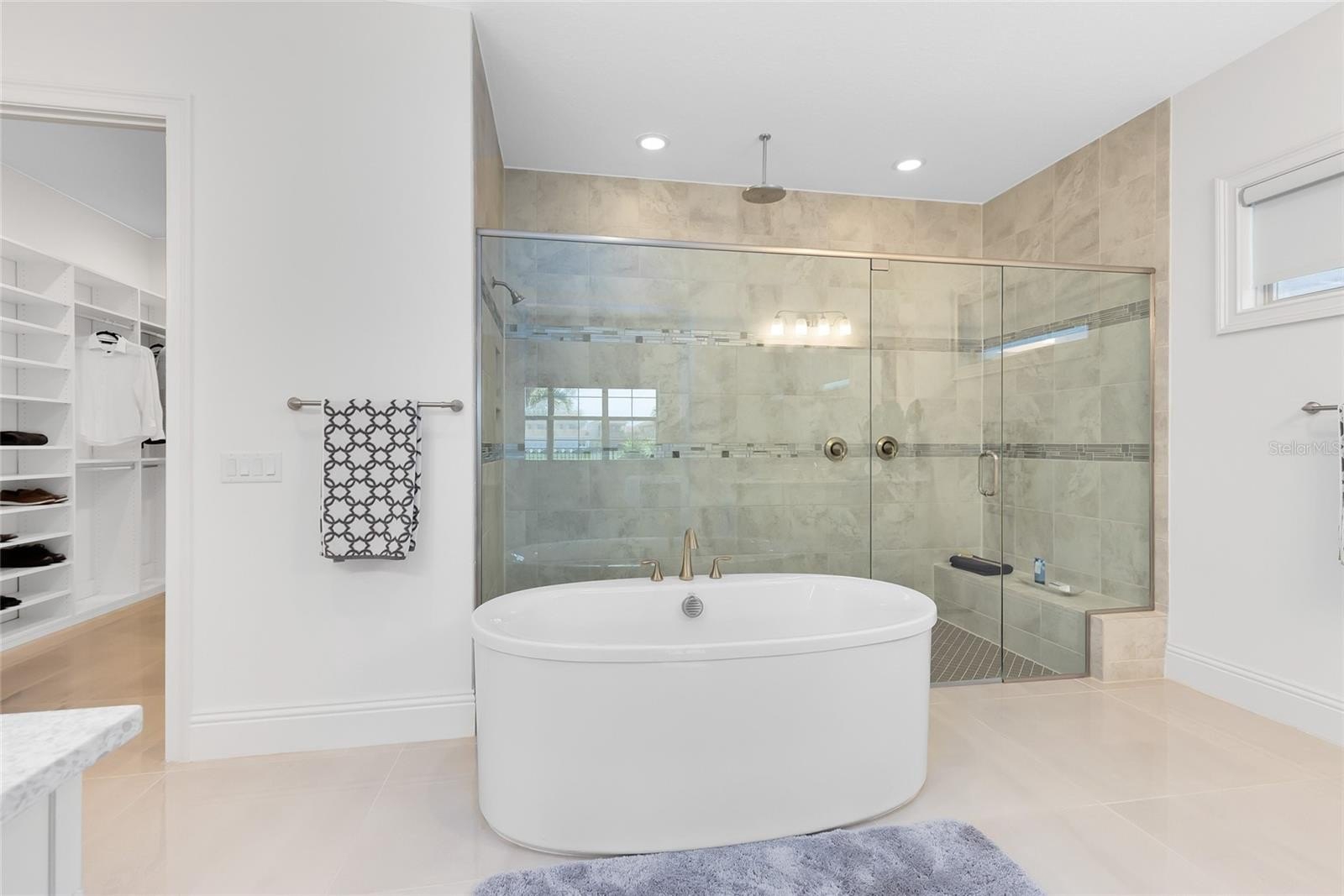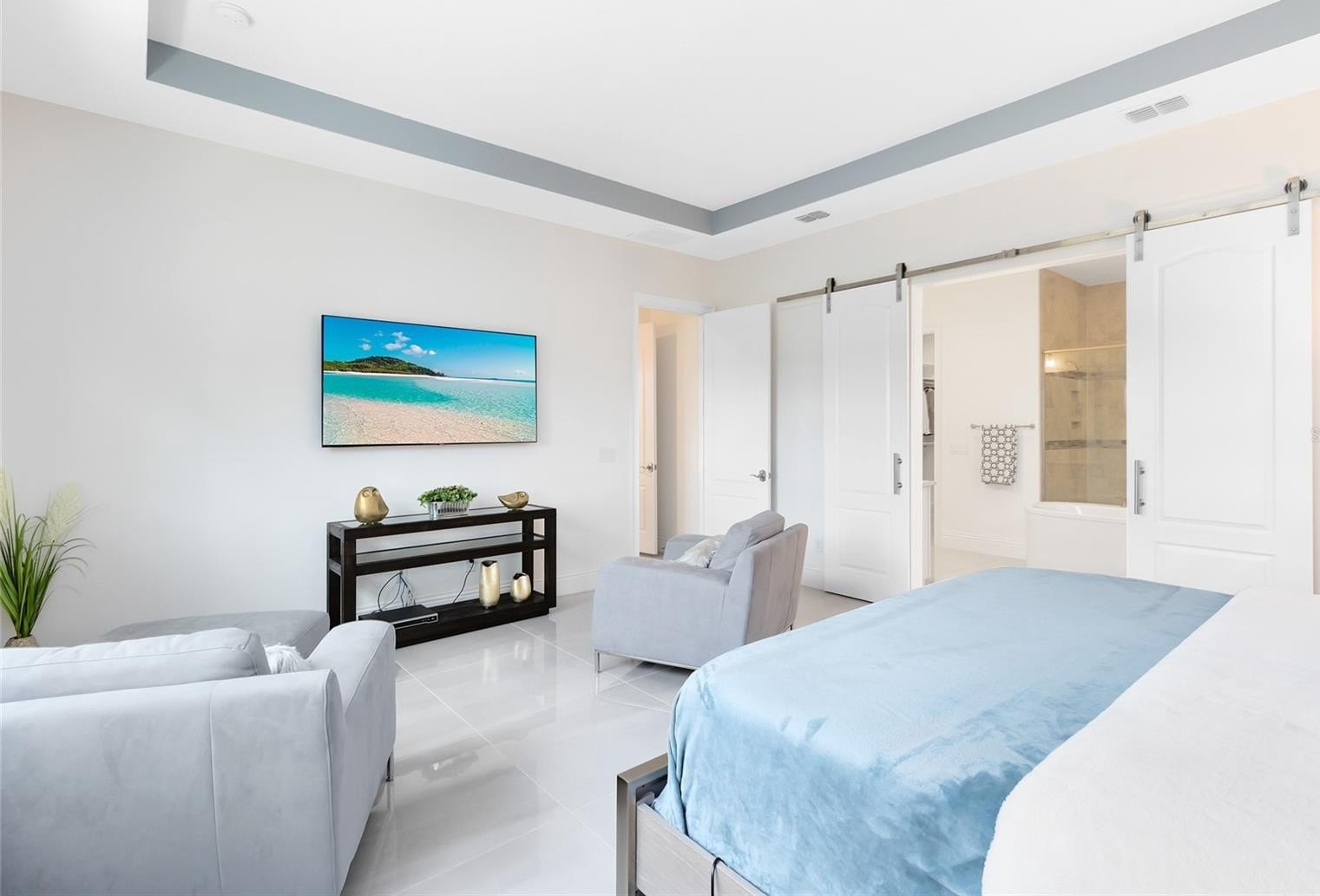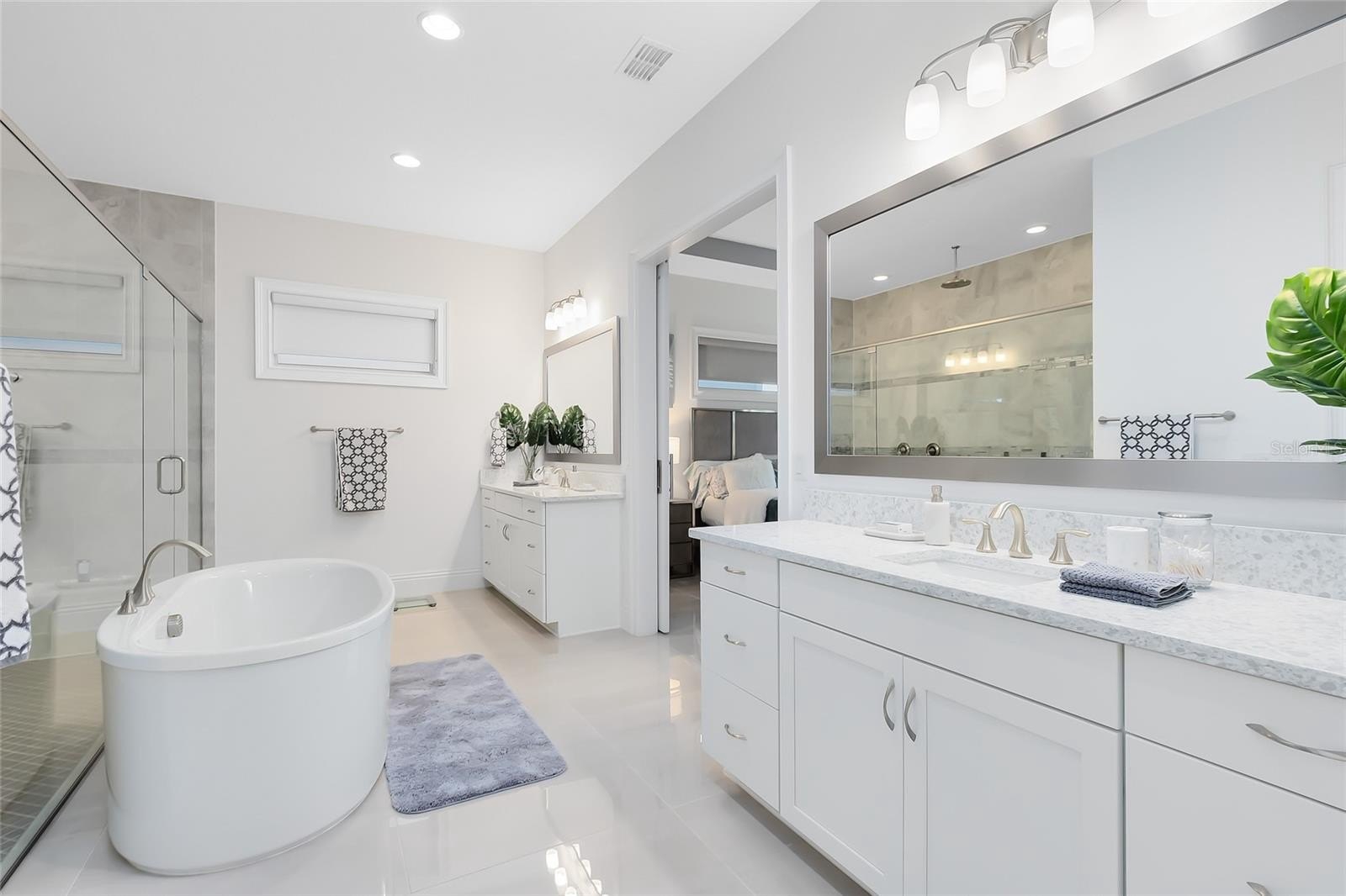 The home offers four spacious bedrooms and four elegant baths. The master suite is a private retreat, featuring double doors to a spa-like ensuite with a standalone Kohler tub, dual shower heads, and a custom walk-in closet with extra-tall storage.