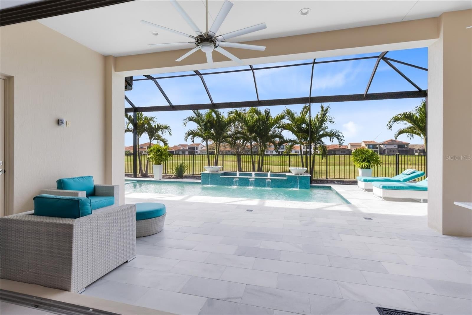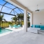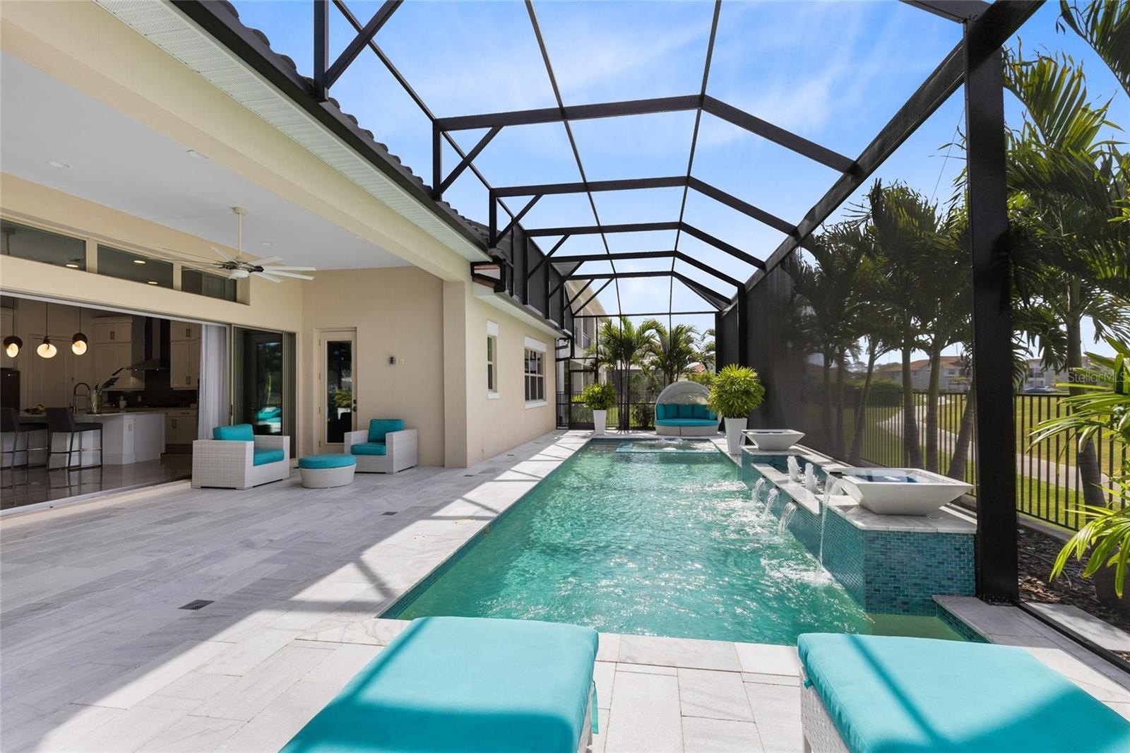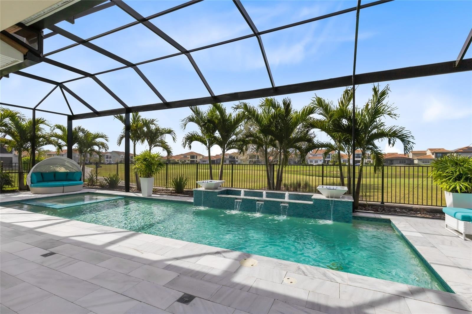 Outdoor living shines with a travertine lanai, screen enclosure, and pre-plumbed BBQ setup. The smart pool system offers heating, jacuzzi jets, and programmable lighting, all controlled from your phone.