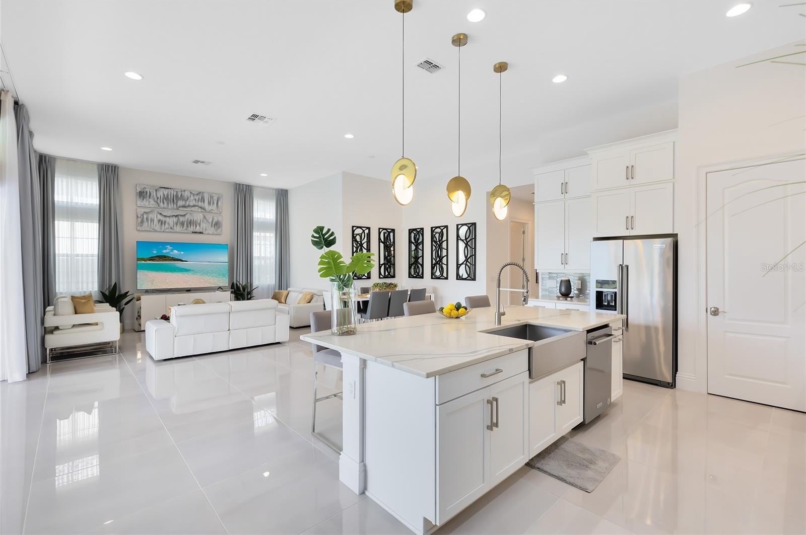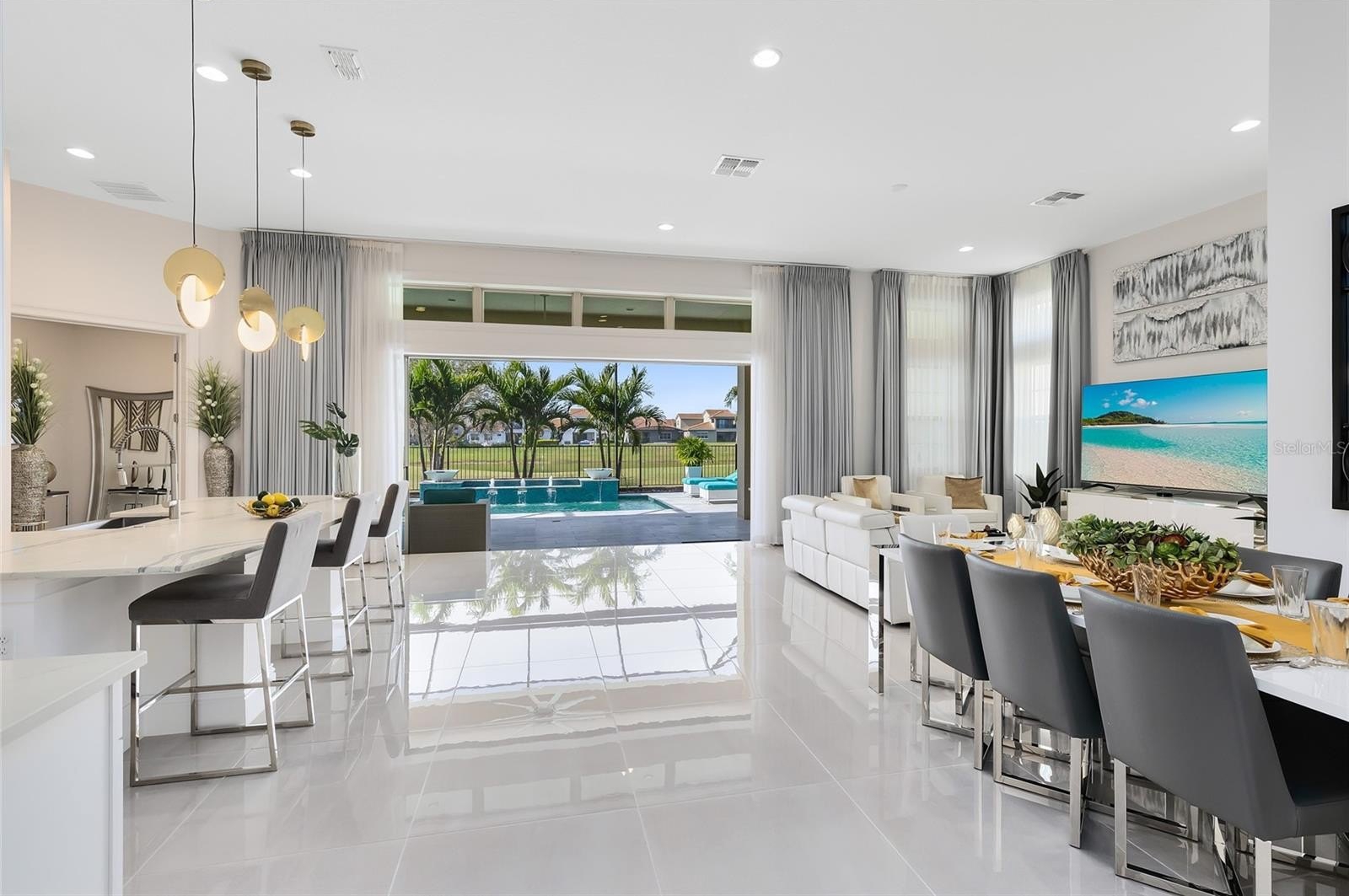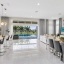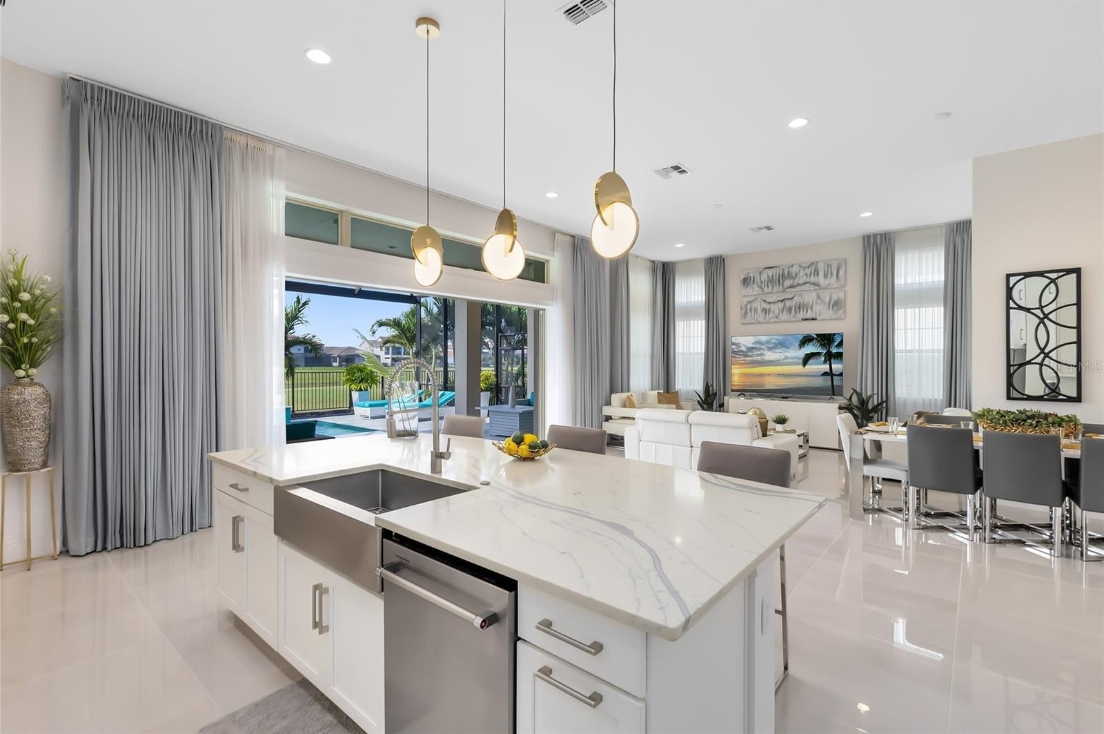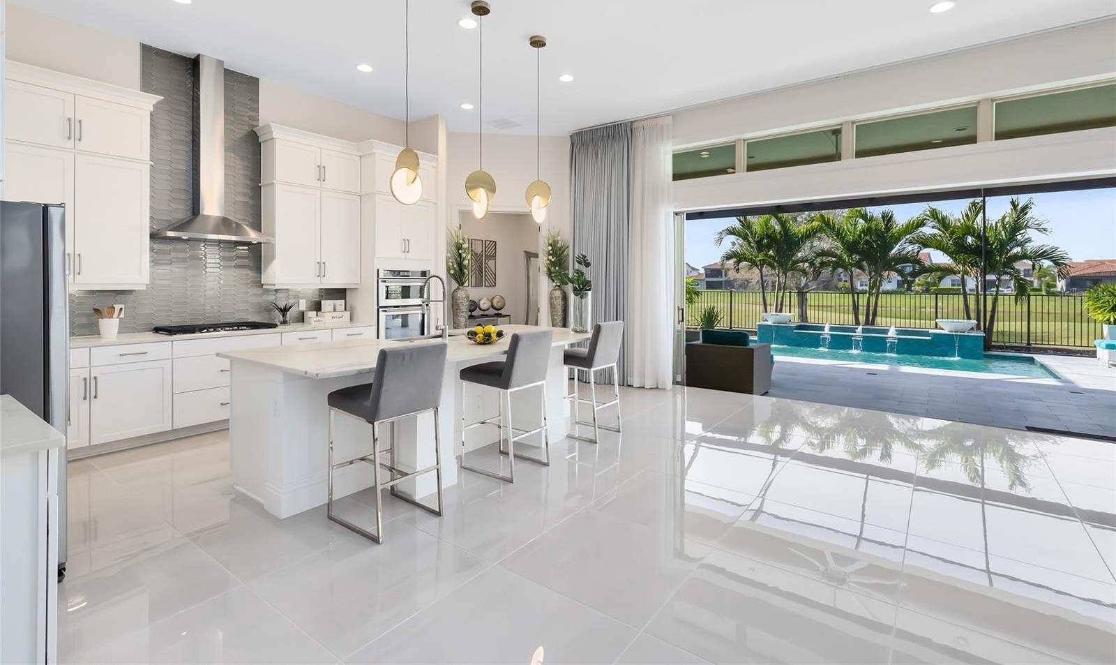 The chef’s kitchen impresses with ceiling-height white cabinetry, a large granite island with seating, built-in oven, gas cooktop, and stainless steel appliances. It flows effortlessly into the dining and living areas, bathed in natural light from expansive windows overlooking the pool.