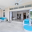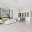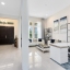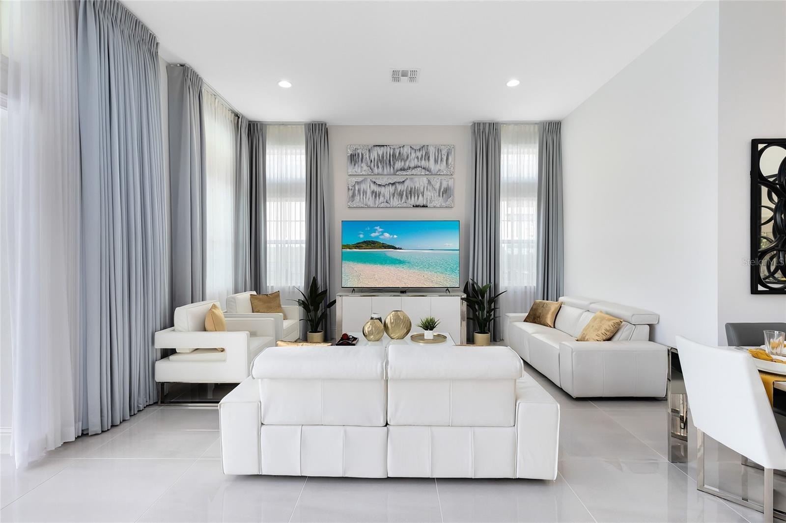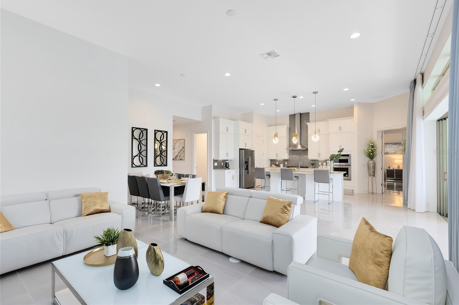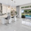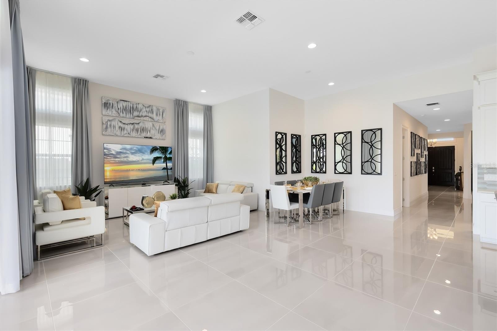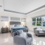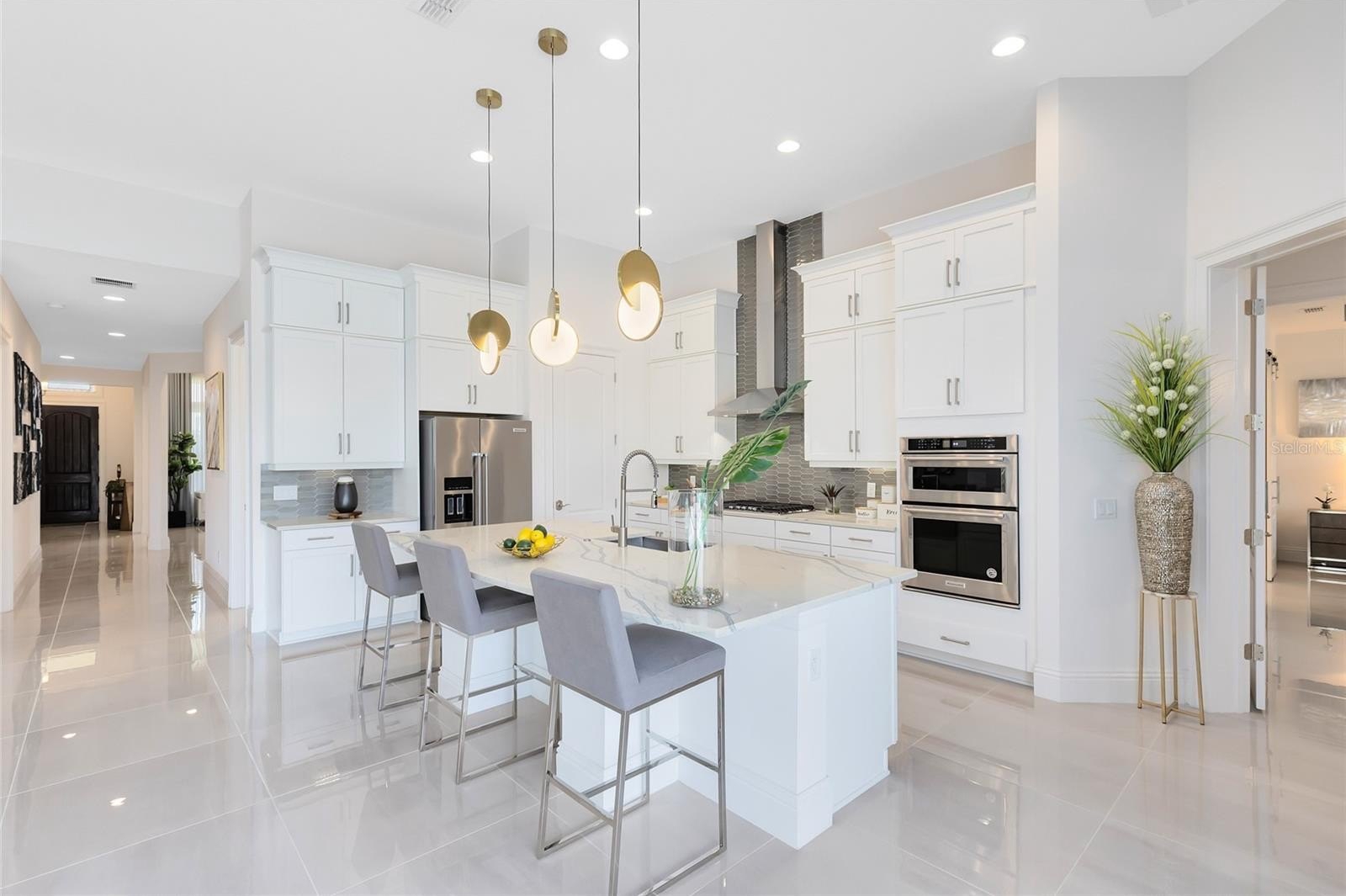 The chef’s kitchen impresses with ceiling-height white cabinetry, a large granite island with seating, built-in oven, gas cooktop, and stainless steel appliances. It flows effortlessly into the dining and living areas, bathed in natural light from expansive windows overlooking the pool.