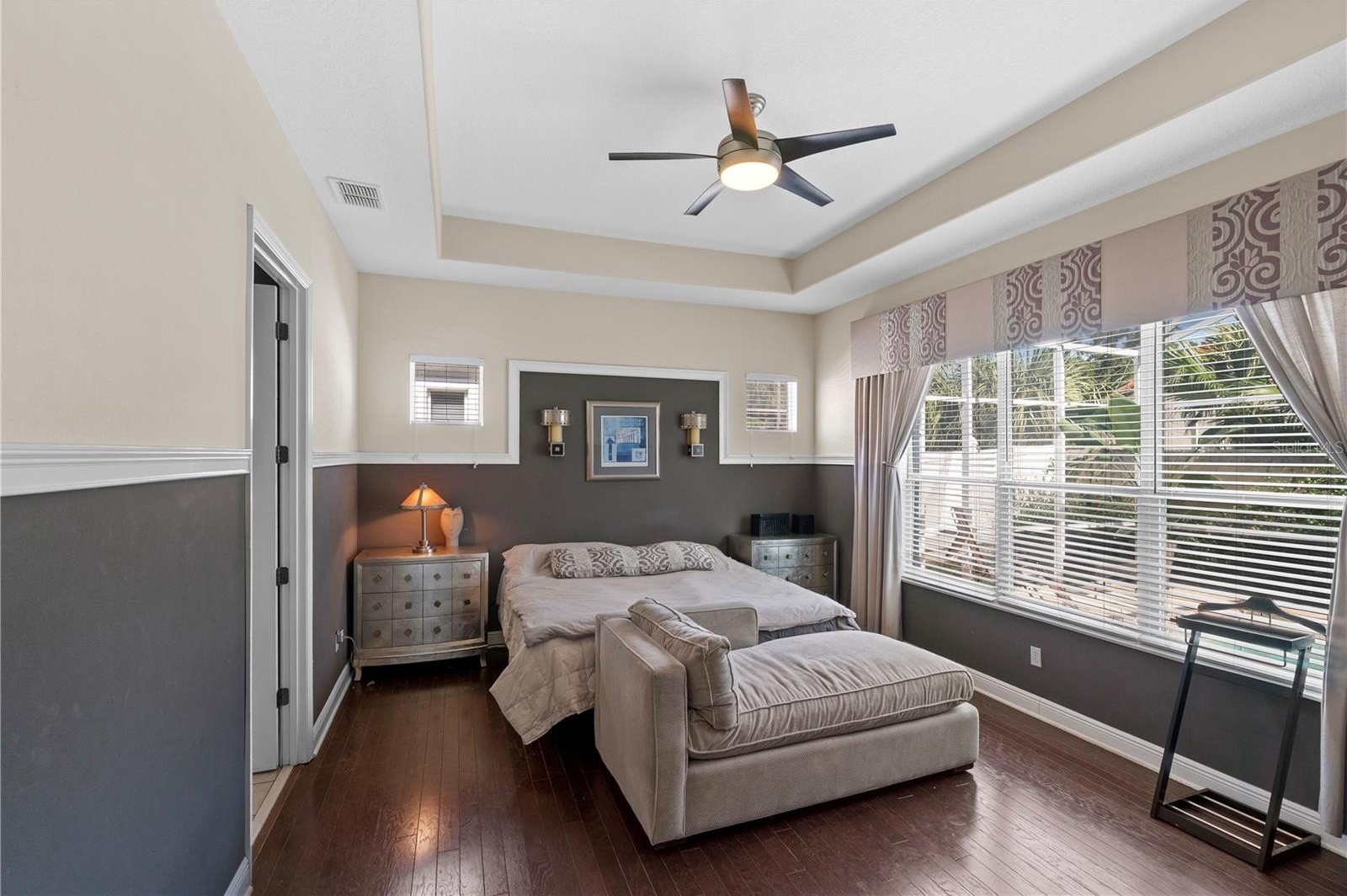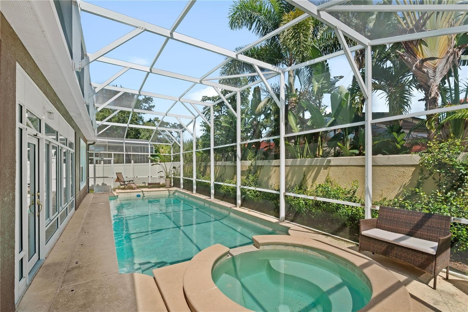 All rooms are generously sized and the primary suite provides direct access to the enclosed Lana and pool. The master bathroom includes a soaking tub, separate shower, dual vanities, and a walk-in closet.