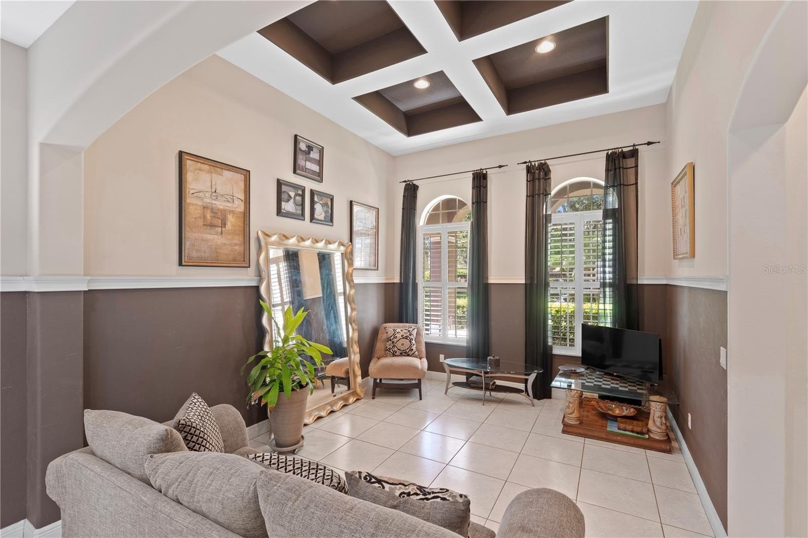 The entrance showcases soaring ceilings, beautiful crown molding throughout, with abundant natural light, and a flowing open floor plan designed for both comfort and entertaining. The kitchen offers ample space with stainless steel appliances, 42" cabinetry, and a breakfast bar.