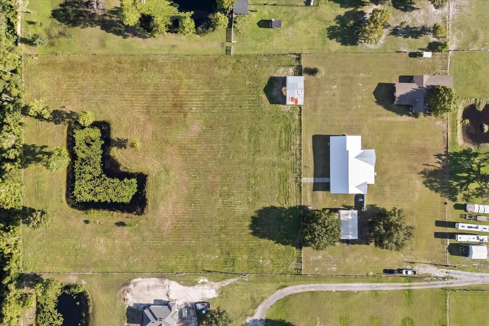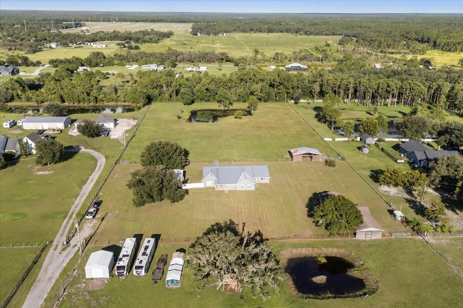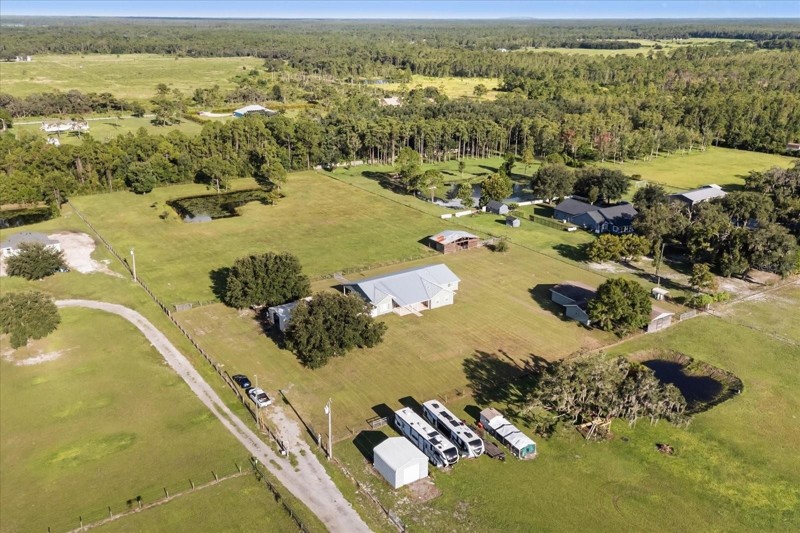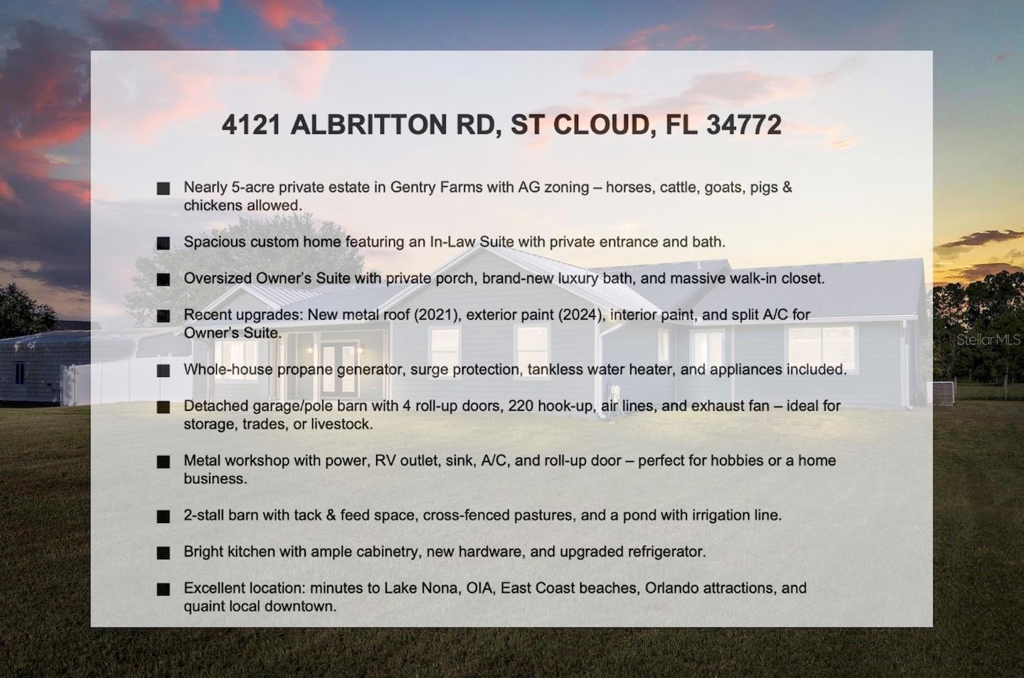 COUNTRY LIVING minutes from all Central Florida has to offer : This custom home sits on nearly 5 acres with AG zoning, an in-law suite, and multiple outbuildings. Recent upgrades include a new metal roof (2021), exterior and interior paint, a split A/C for the owner’s suite, a whole-house surge protector, and a propane generator with an owned tank. The oversized owner’s suite features a private porch, brand-new luxury bath, and a massive walk-in closet, while the in-law suite offers its own entrance and bath. A bright kitchen with updated cabinetry and appliances complements the living space. Outside, you’ll find a fully equipped metal shop, detached garage/pole barn, 4-stall barn, cross-fencing, and a pond with irrigation—perfect for livestock and hobbies. Nestled in Gentry Farms with no HOA, this property offers privacy and a rural feel yet remains close to Lake Nona, Orlando attractions, beaches, and a charming downtown.