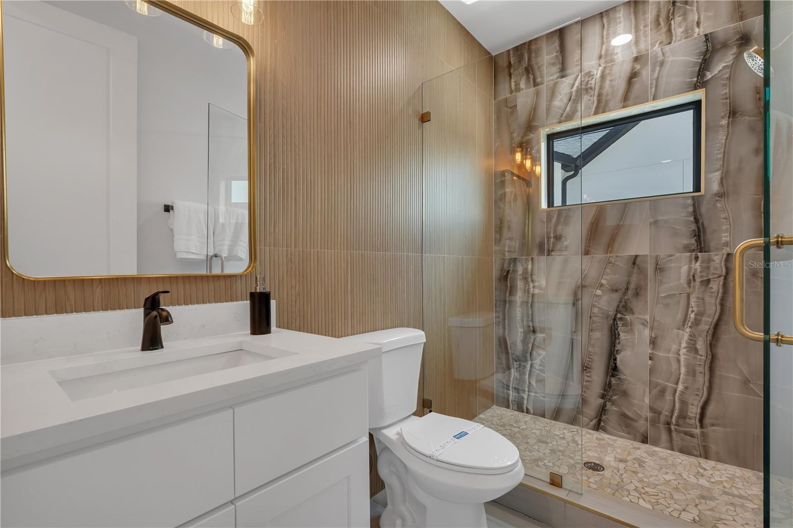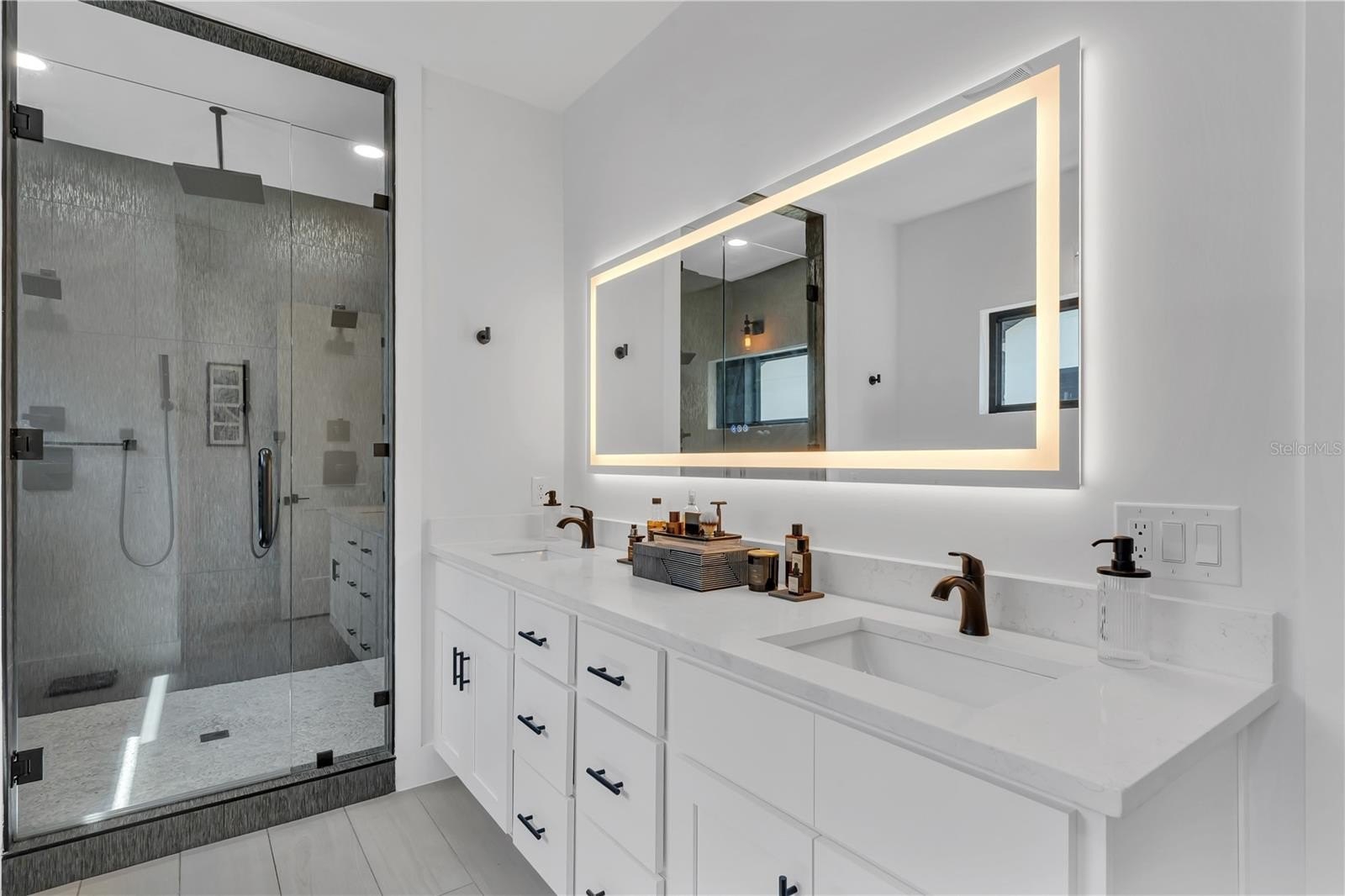 Upstairs, a Loft flexes as your creative space, leading to an extraordinary Owner’s Suite with Private Office, Chandelier-Lit Dressing Room, and Spa-Inspired Bath featuring a floor-to-ceiling tiled shower with five heads, backlit mirrors, and pendant lighting. Two oversized Bedrooms share a full Bath with elegant stone finishes, while an expansive upstairs Laundry Room adds convenience.