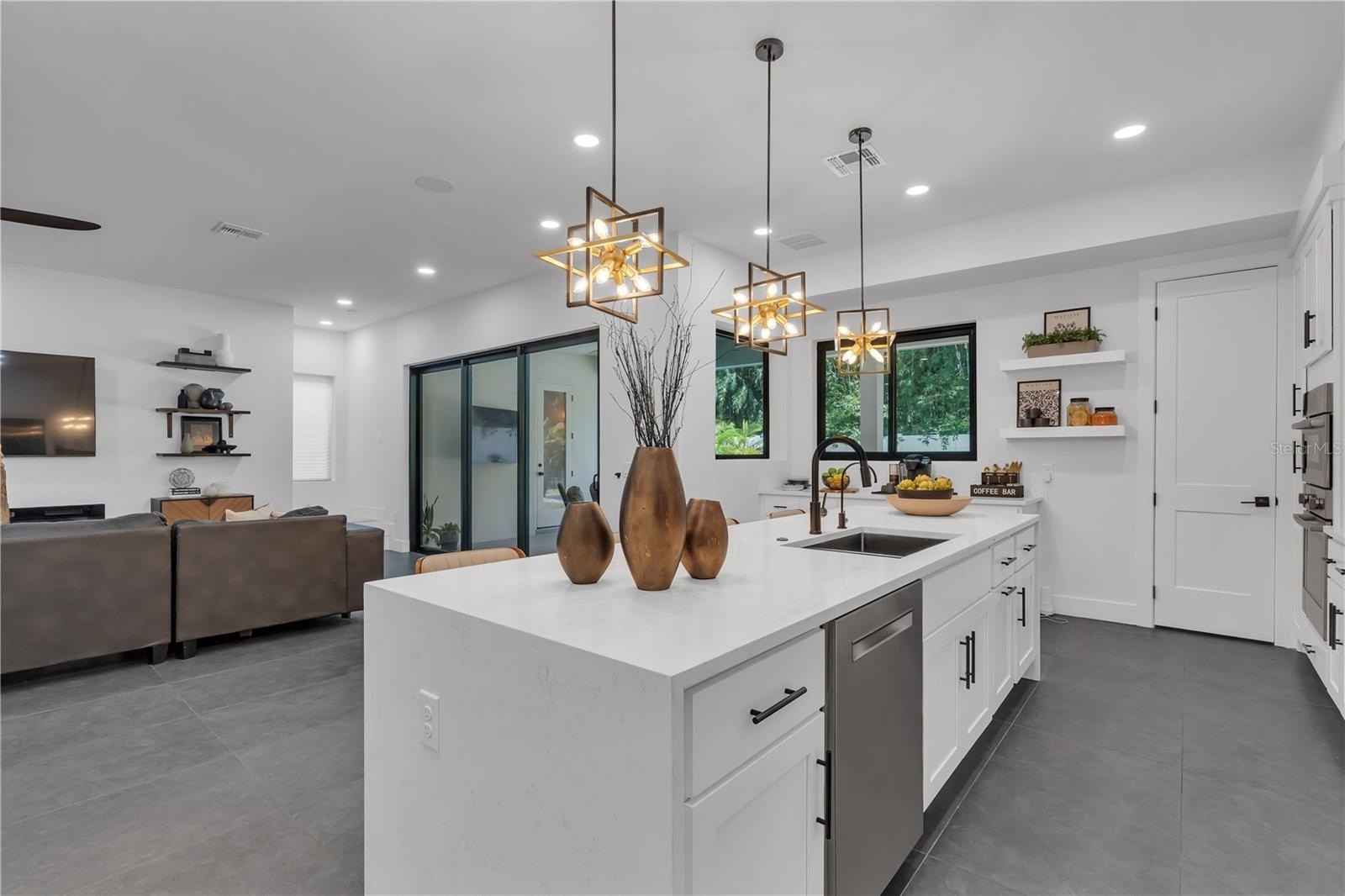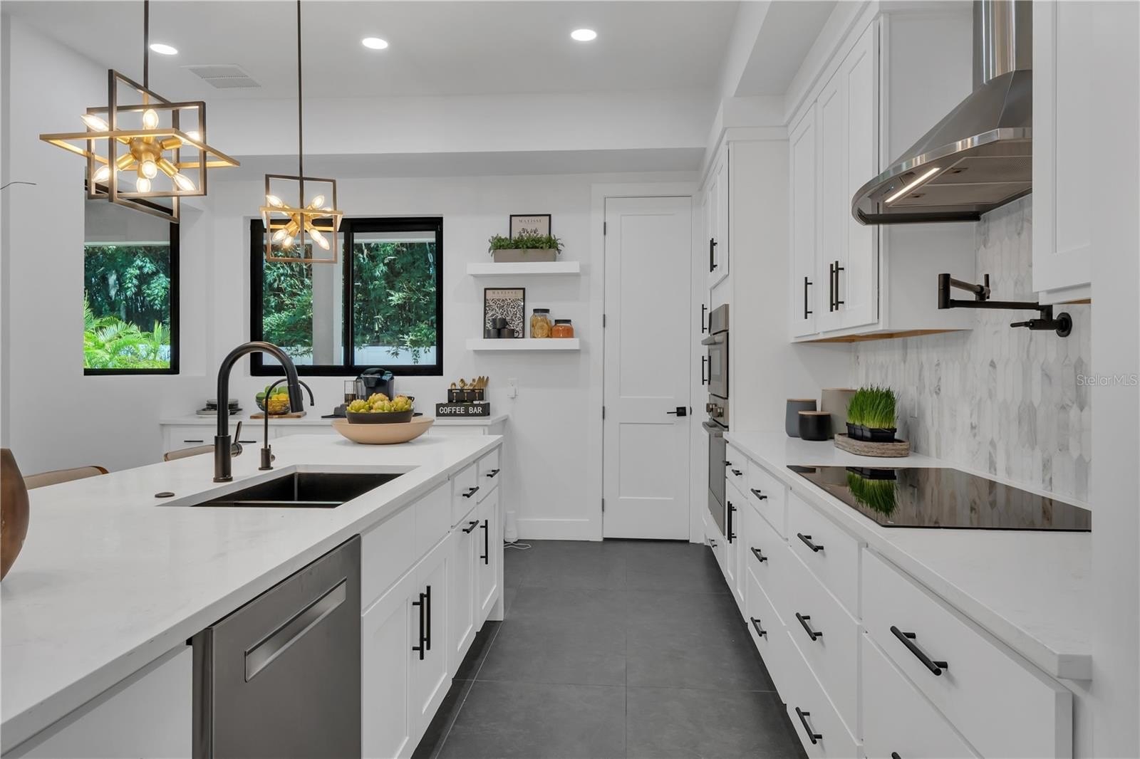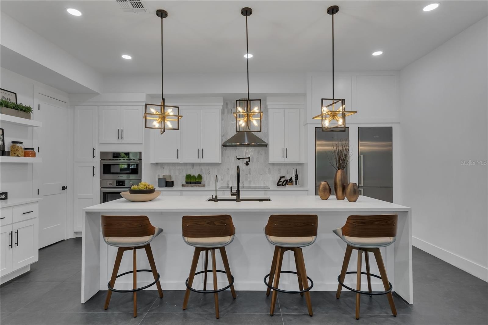 At the home’s center, the Gourmet Kitchen is the heart of the home — where culinary creativity, living, and gathering converge. A 10-foot Waterfall Quartz Island with seating for five blends artistry and function, complete with a Bosch Dishwasher, integrated recycling and storage, and a bronzed designer sink. Dual Bosch Refrigerator–Freezers and a Built-In Bosch Convection Oven and Microwave combination are paired with designer soft-close cabinetry, while the Induction Cooktop with Pot Filler is crowned by a sculptural vent hood — a focal point of both performance and design. A generous Walk-In Pantry keeps you organized, while a dedicated Coffee Bar overlooks the Pool, turning daily ritual into an experience framed by resort-style views.