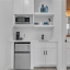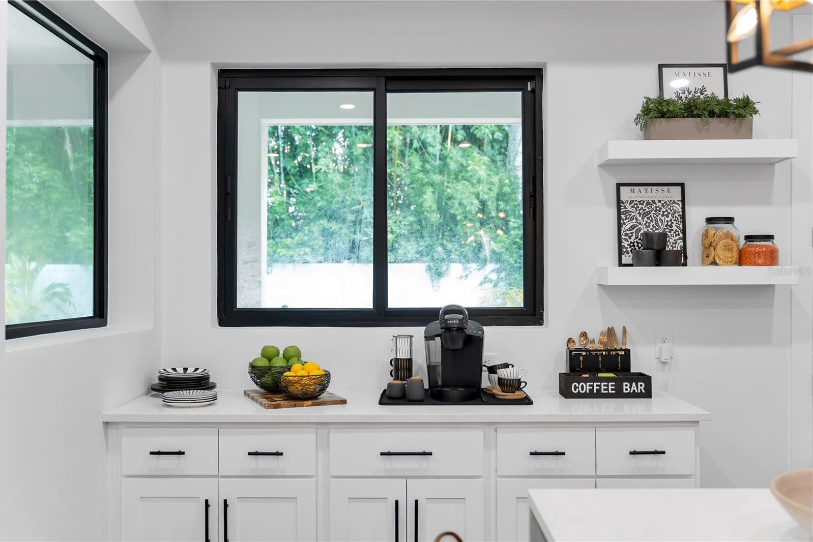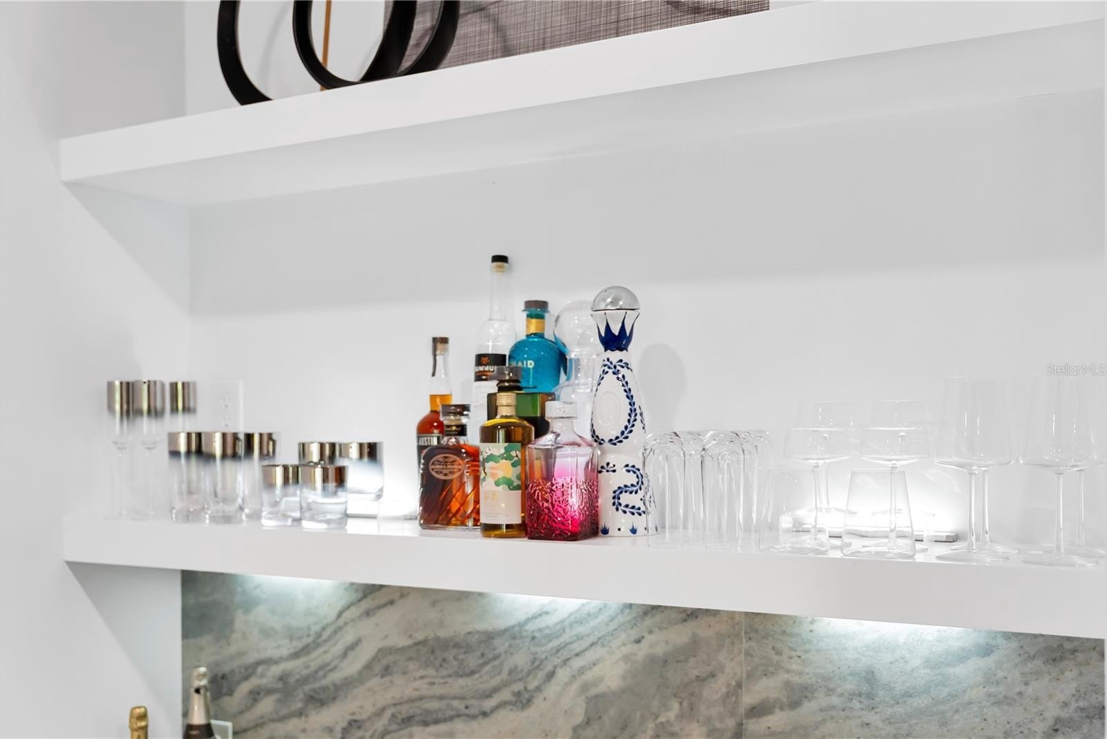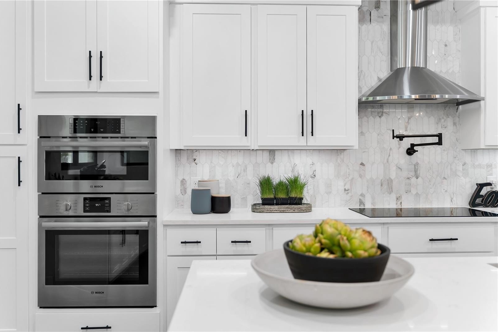 At the home’s center, the Gourmet Kitchen is the heart of the home — where culinary creativity, living, and gathering converge. A 10-foot Waterfall Quartz Island with seating for five blends artistry and function, complete with a Bosch Dishwasher, integrated recycling and storage, and a bronzed designer sink. Dual Bosch Refrigerator–Freezers and a Built-In Bosch Convection Oven and Microwave combination are paired with designer soft-close cabinetry, while the Induction Cooktop with Pot Filler is crowned by a sculptural vent hood — a focal point of both performance and design. A generous Walk-In Pantry keeps you organized, while a dedicated Coffee Bar overlooks the Pool, turning daily ritual into an experience framed by resort-style views.