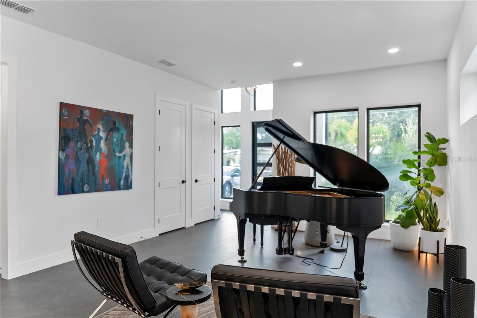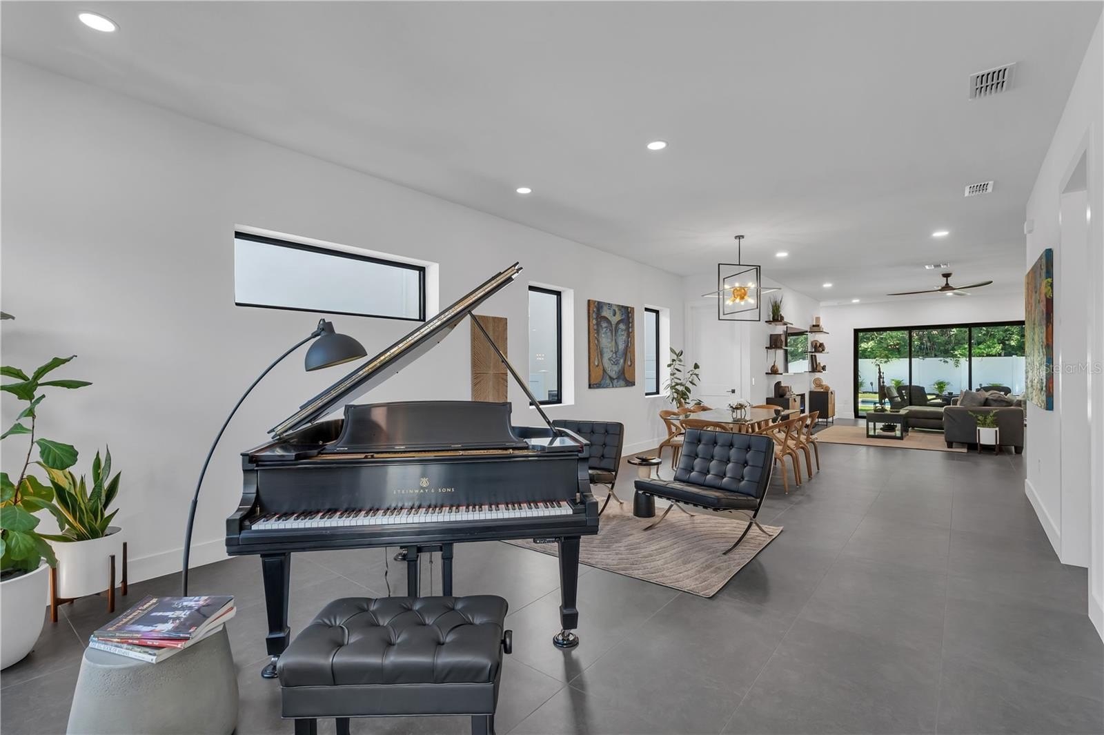The Foyer establishes the design language for the home, with its soaring 24-foot ceiling, statement lighting, and artfully placed windows that infuse the interiors with light and volume. The flow continues effortlessly into a Lounge and Music Studio, Formal Dining, and a Living Room anchored by a modern all-seasons fireplace, custom shelving, granite Wet Bar, and integrated sound system — designed to be experienced, yet adaptable to your lifestyle and desires.