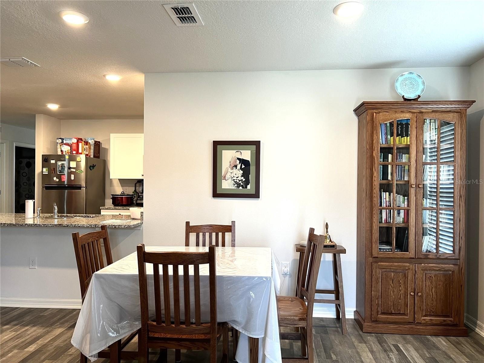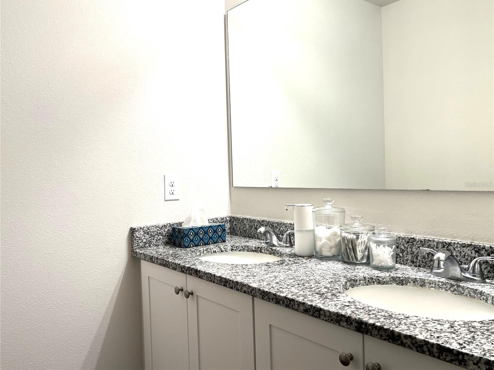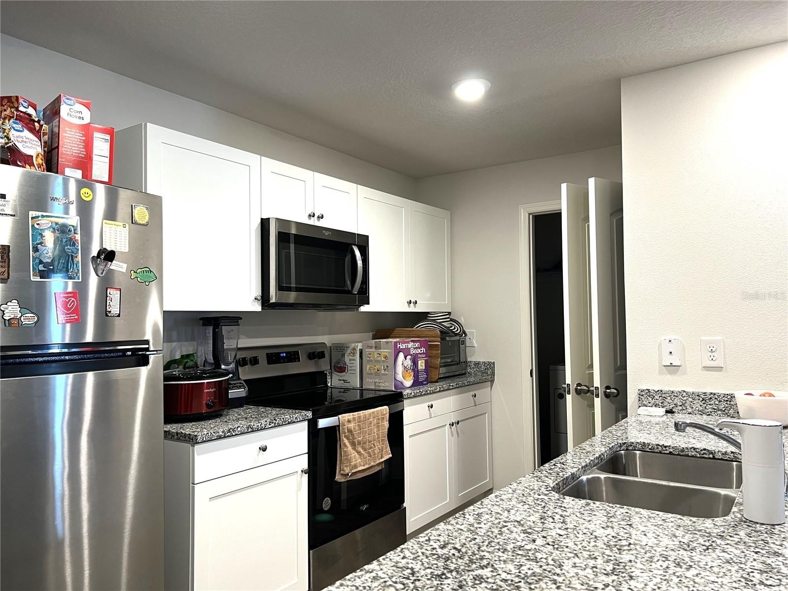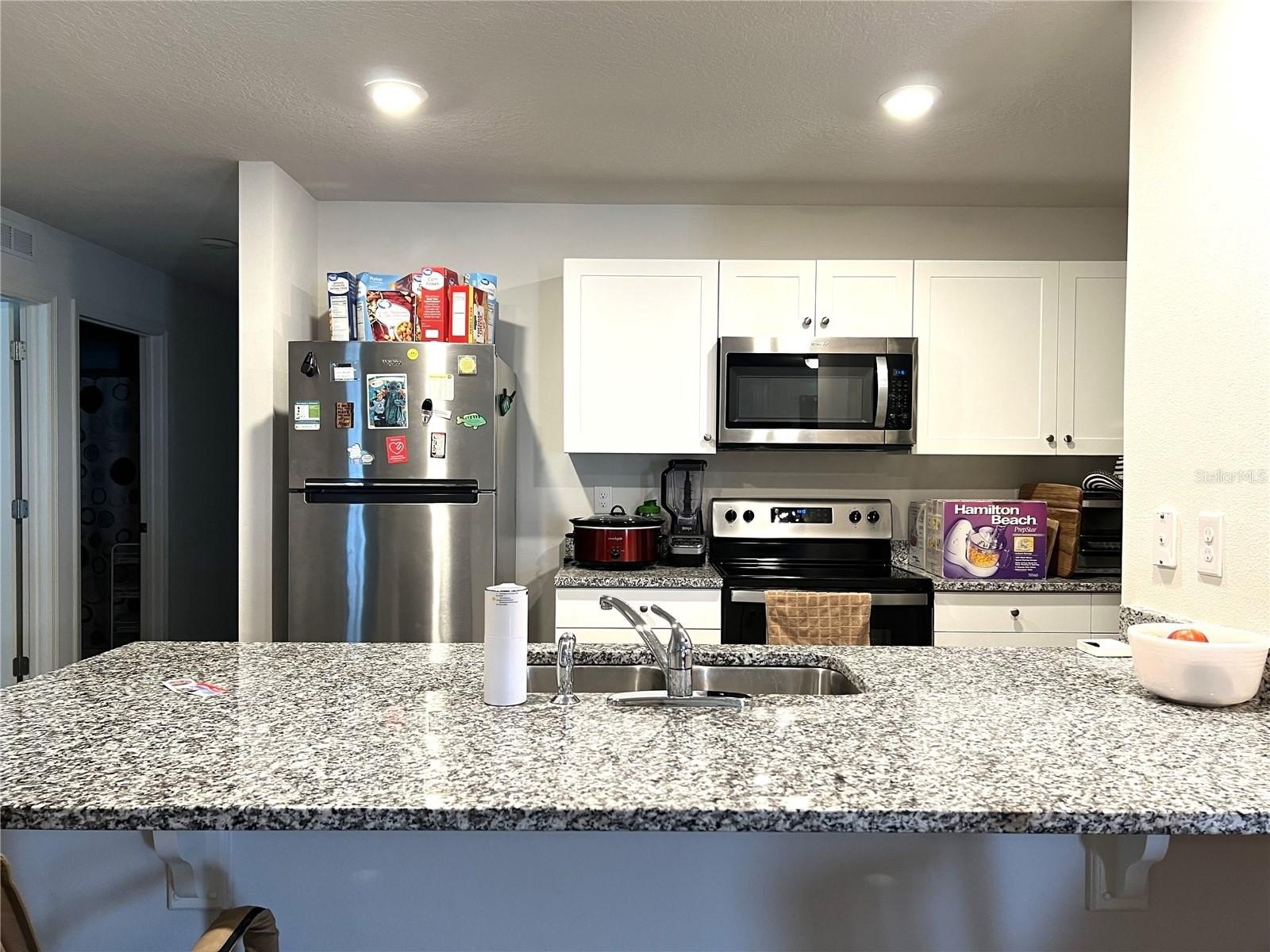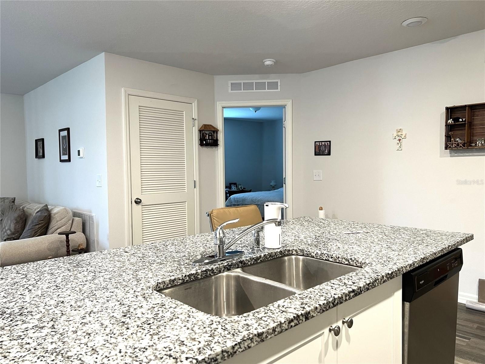 Check out this lightly-lived-in home with a lot to offer! Three bedrooms and two full baths. The kitchen has granite counters and backsplash plus a granite topped counter with sink and breakfast bar, and lots of white cabinets with soft-close doors and drawers. The large living room has sliding glass doors out to the back yard, with 8x8 concrete slab, perfect for the BBQ. The primary bedroom has a walk-in closet plus private bath with dual sinks, and step-in tiled shower. The two secondary bedrooms share the second full bath. For continuity, both baths have the same gray granite countertops and backsplash as the kitchen counters. The flooring is luxury vinyl plank throughout, except for the bedrooms, which are carpeted. The inside laundry room leads out to the 2-car garage. The monthly HOA is very reasonable, and includes Spectrum cable and internet, a significant financial benefit! This is a well-priced home in excellent condition. Come see it today!