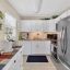 The modern kitchen is a true centerpiece with granite countertops, a designer tile backsplash, newer stainless-steel appliances, abundant cabinetry with under-cabinet lighting, and a sleek, contemporary feel. Glossy ceramic tile floors flow throughout, creating an elegant, low-maintenance living space.