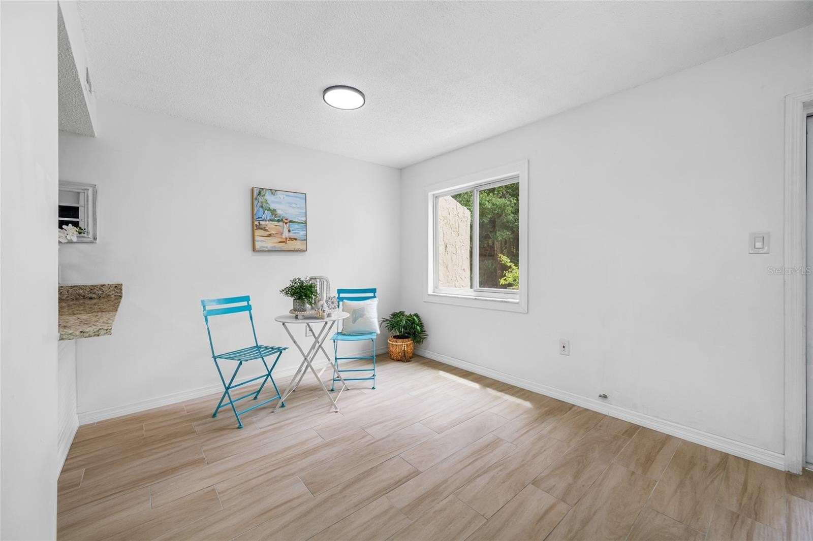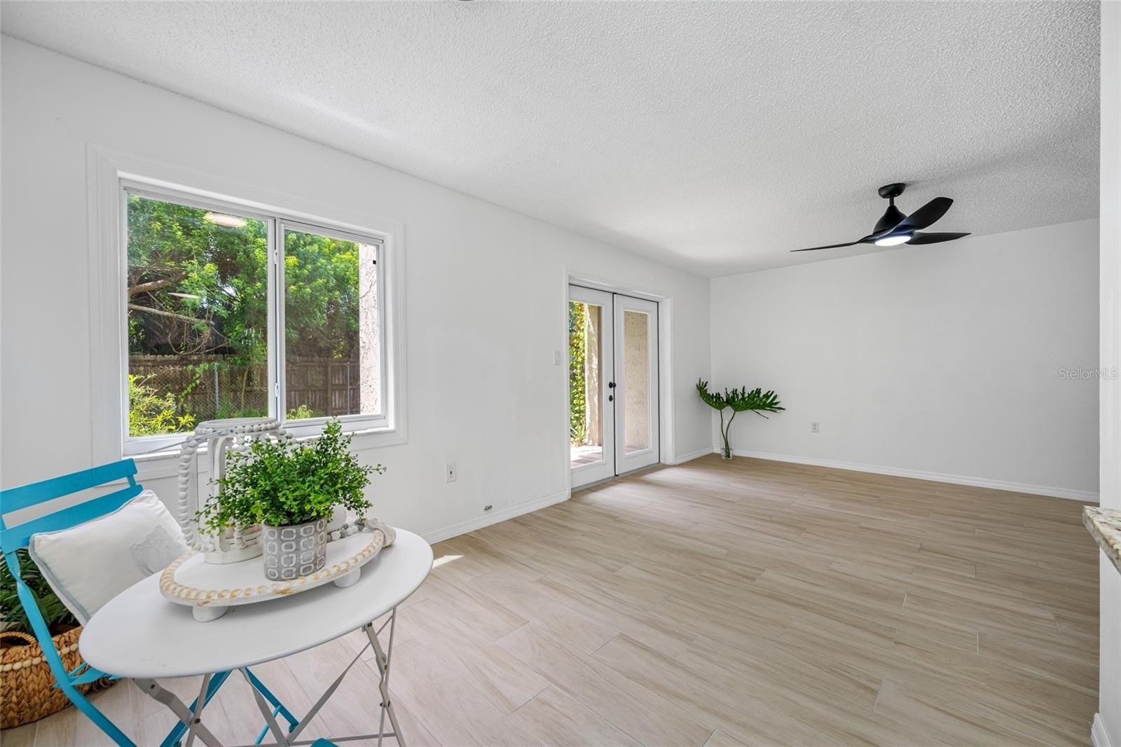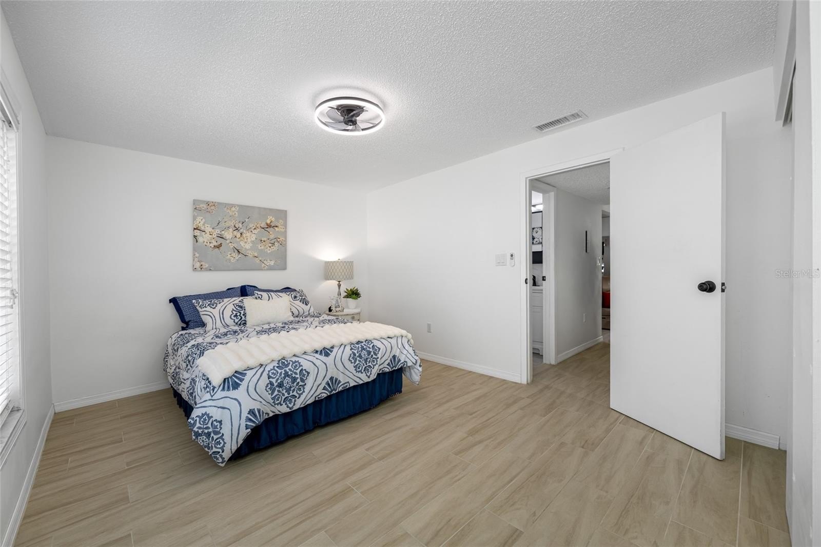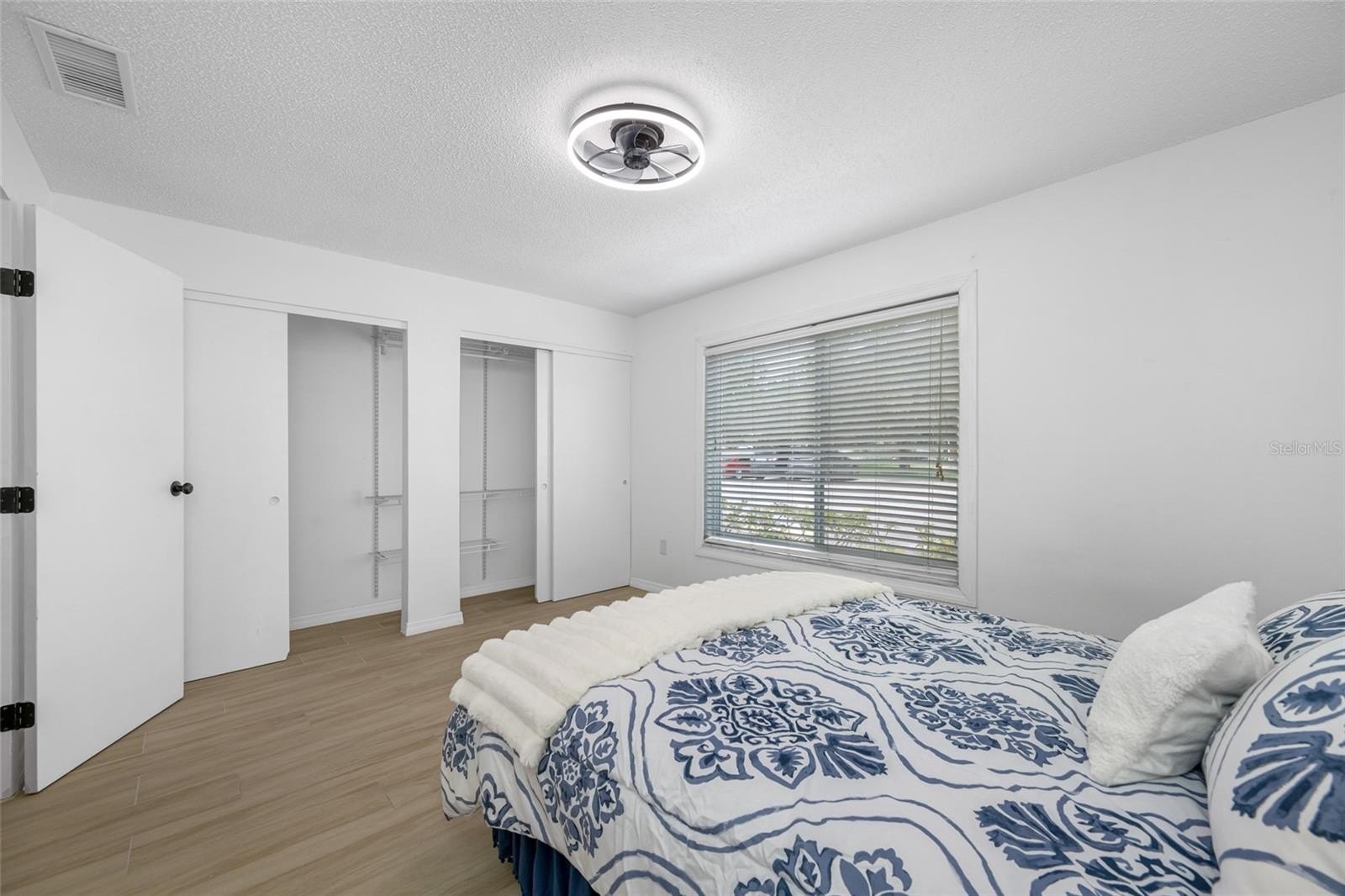 Large walk-in storage closet located across from the bathroom. Stylish plank tile flooring runs throughout, complemented by new windows (2023) and a back porch ideal for soaking up the Florida sunshine.