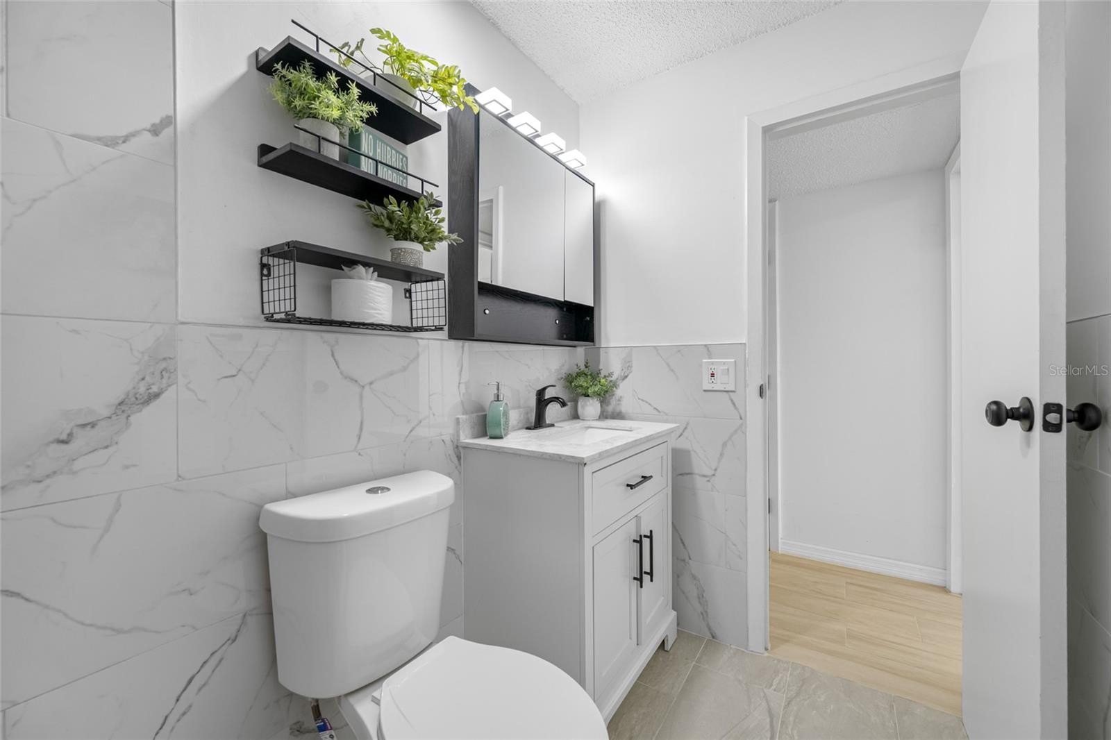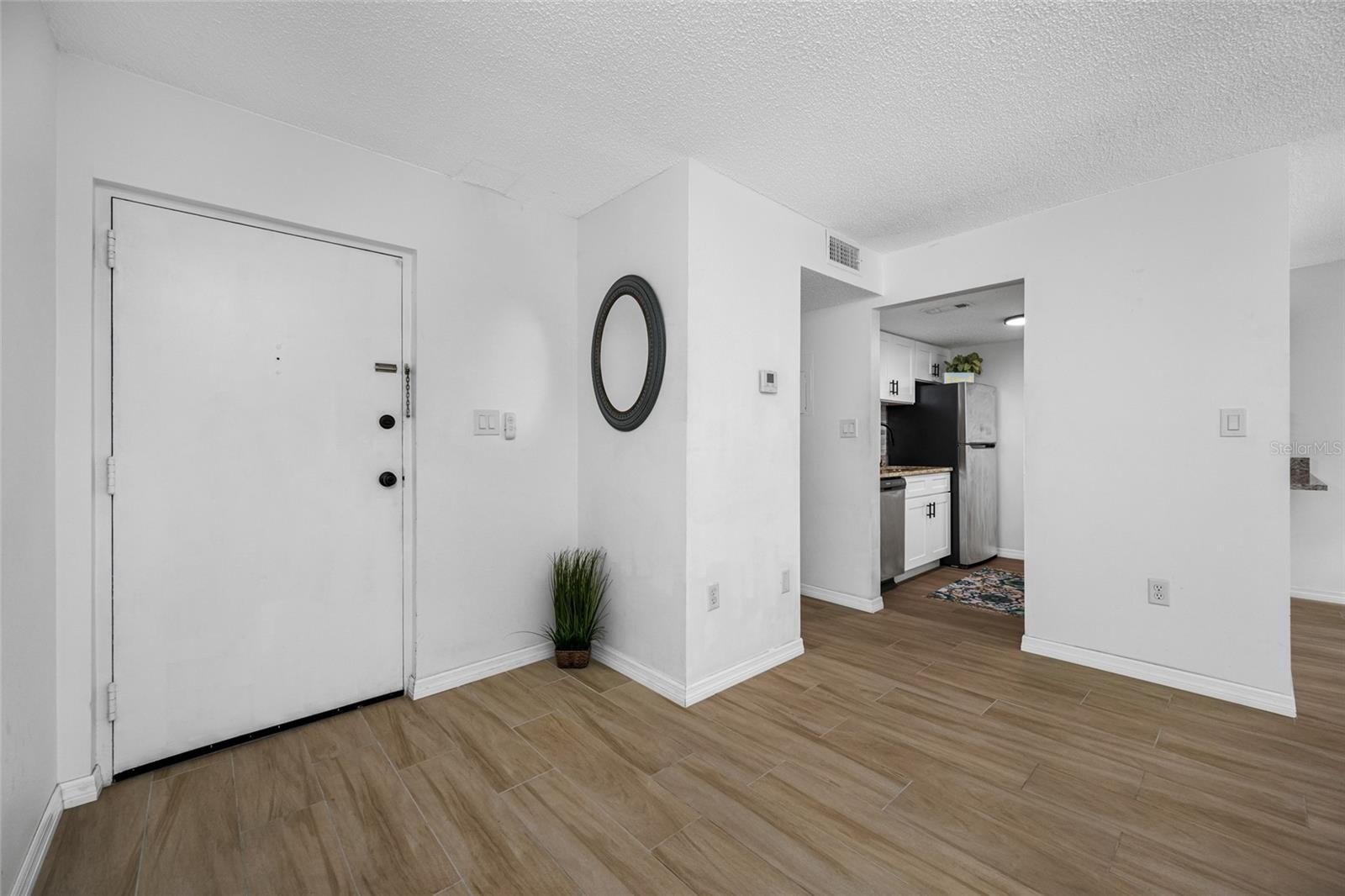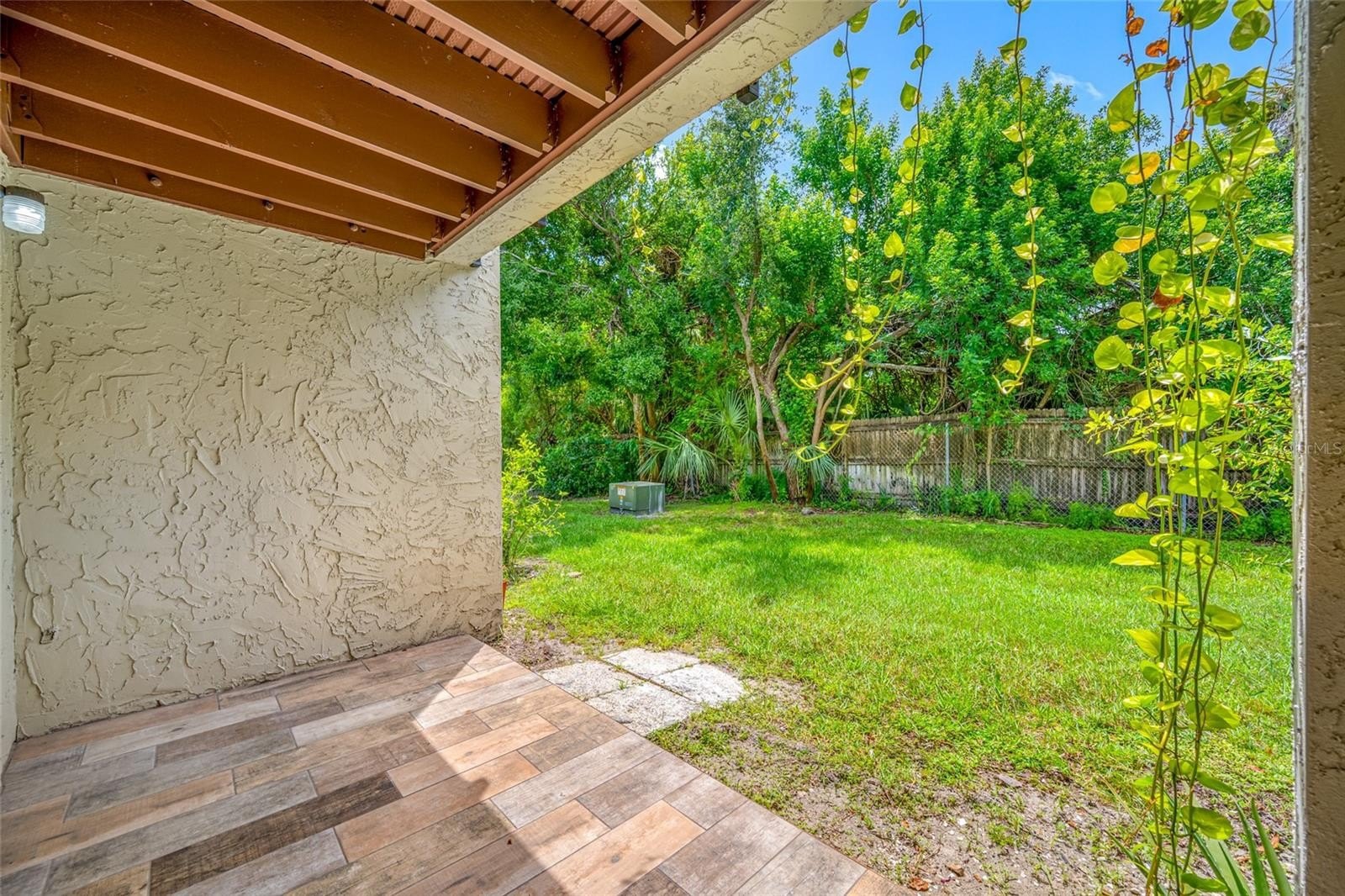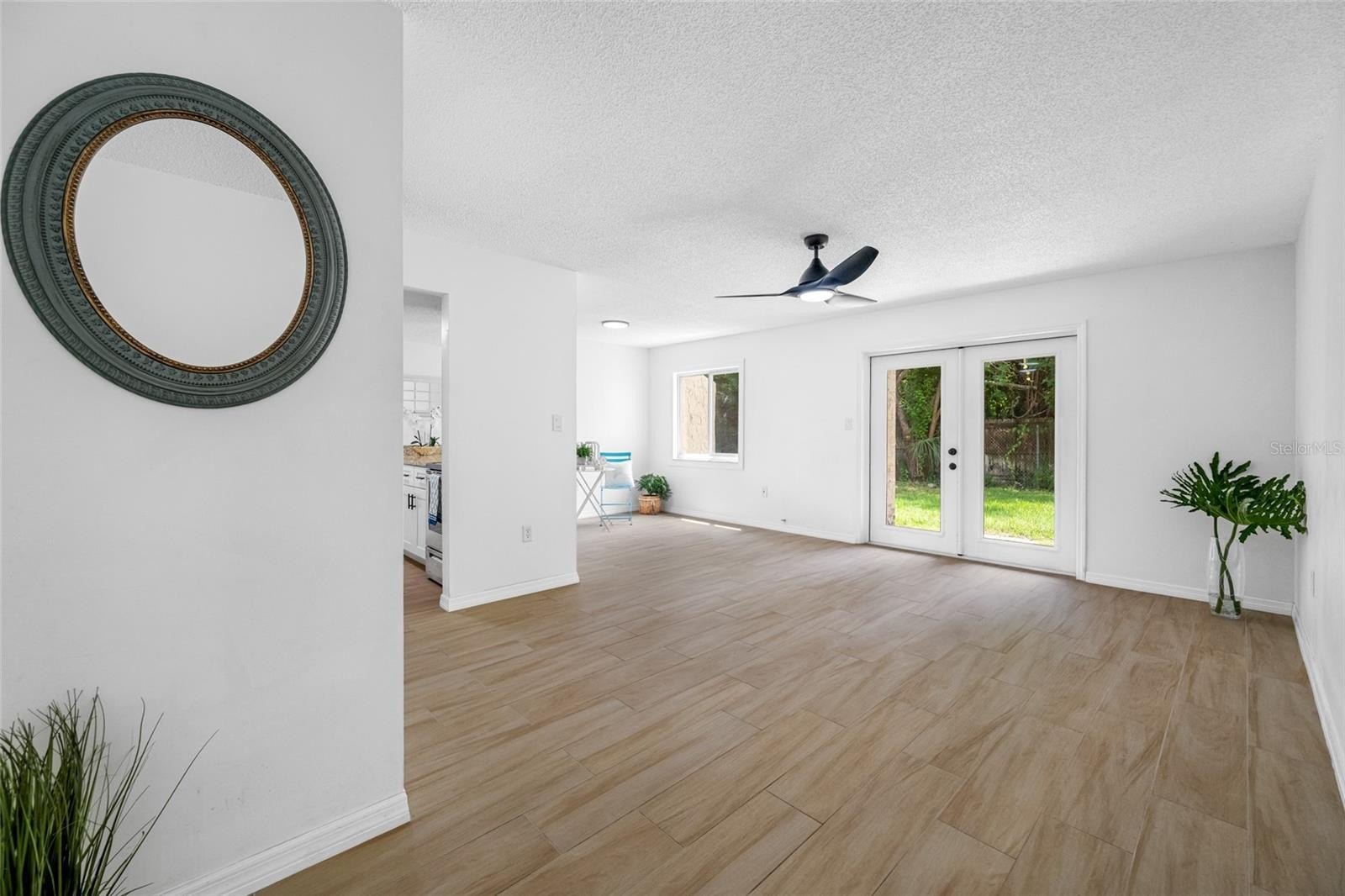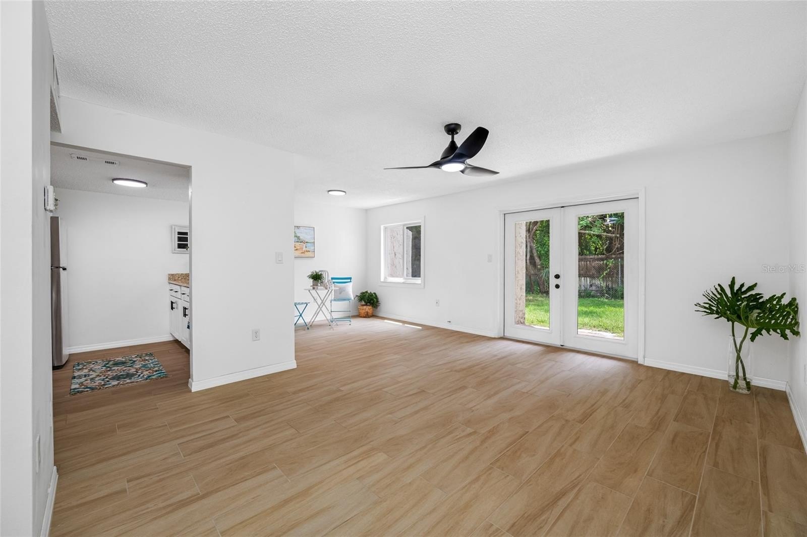 Large walk-in storage closet located across from the bathroom. Stylish plank tile flooring runs throughout, complemented by new windows (2023) and a back porch ideal for soaking up the Florida sunshine.