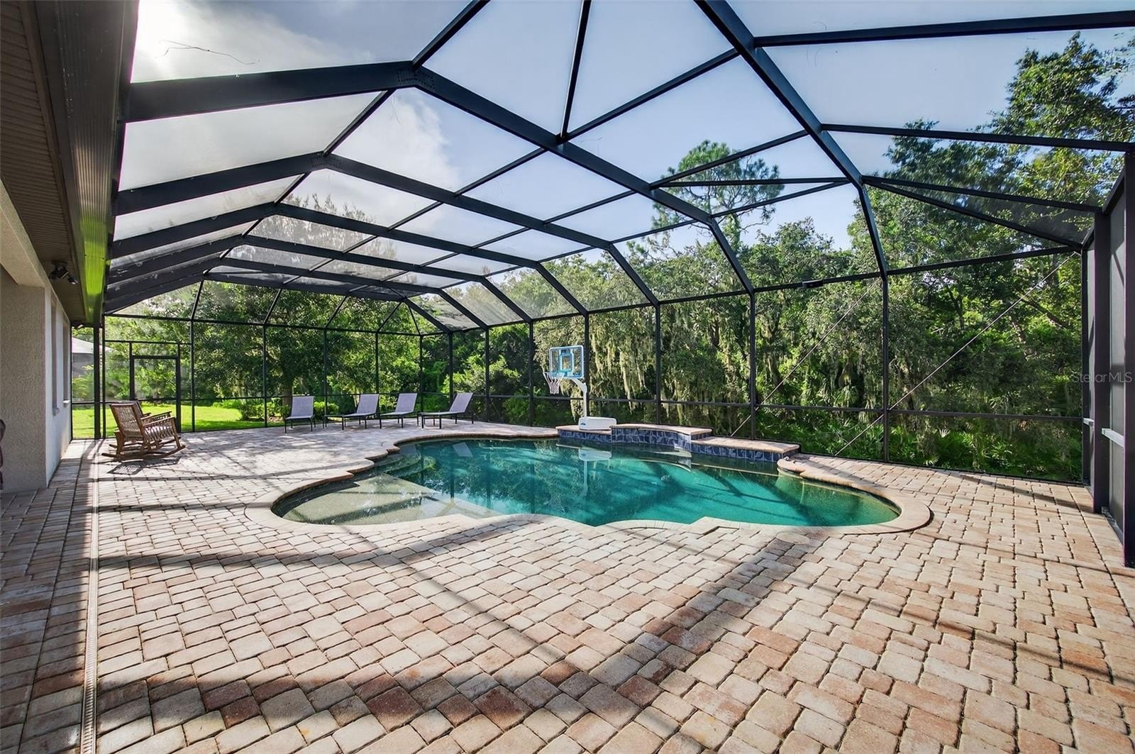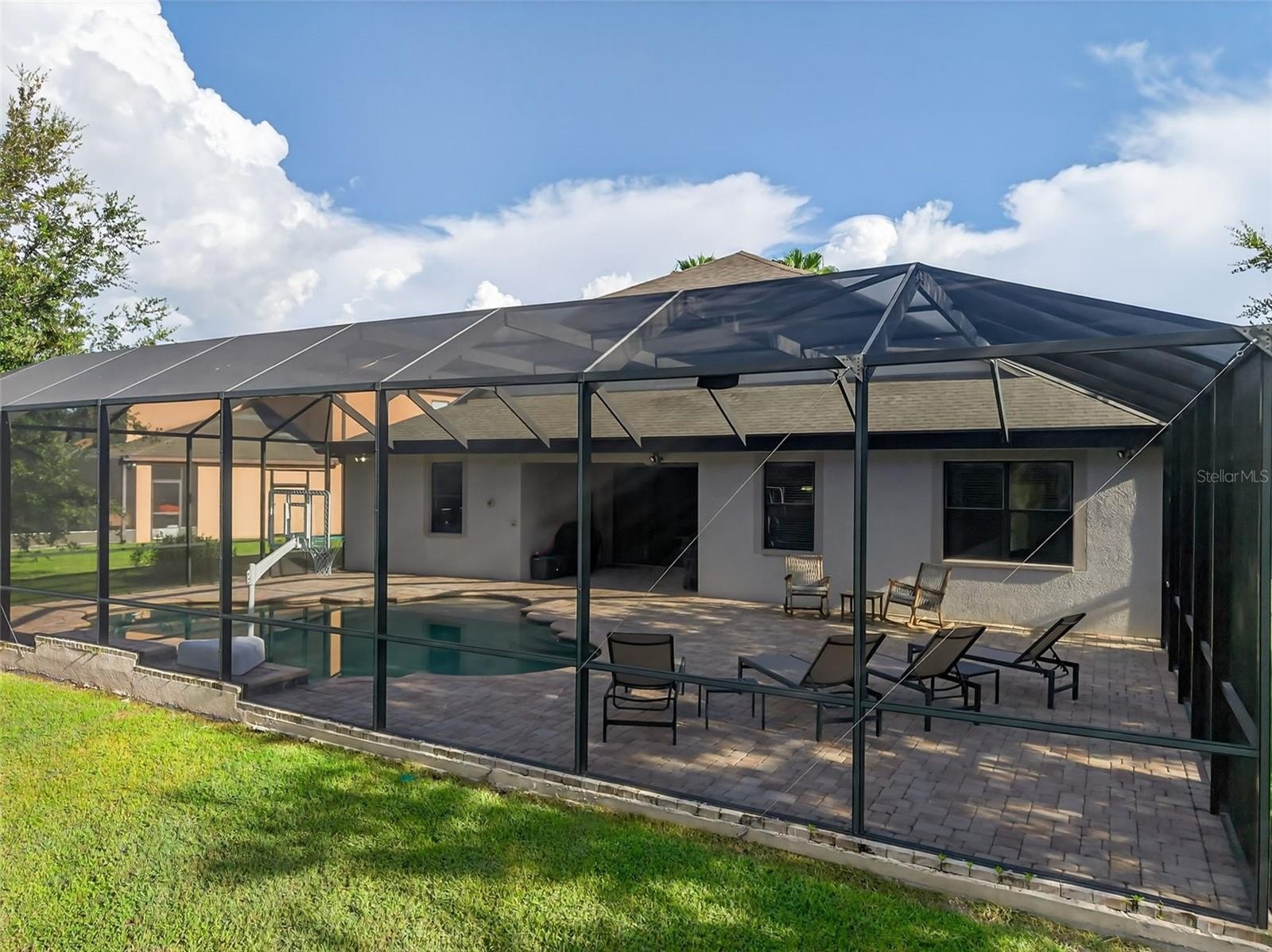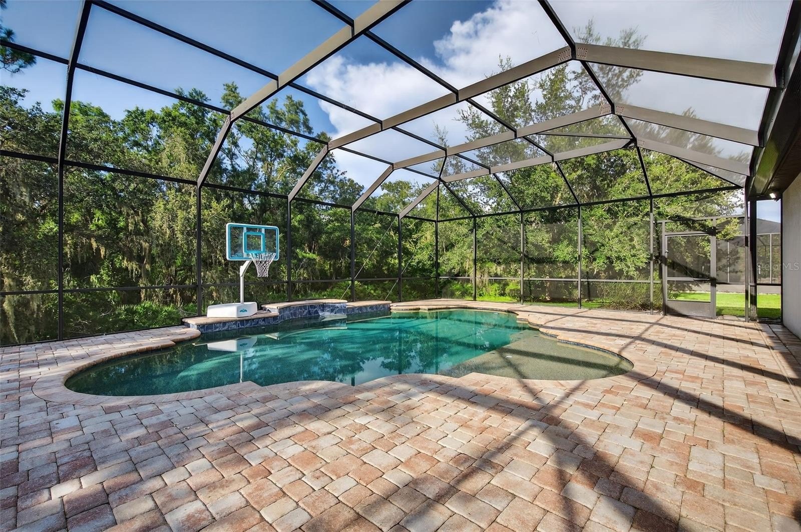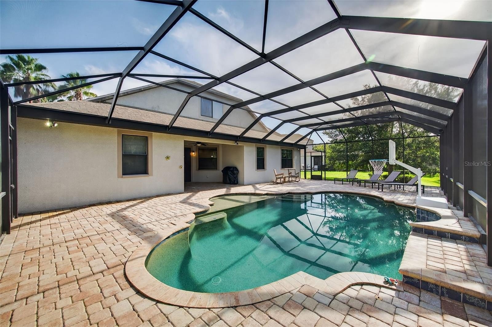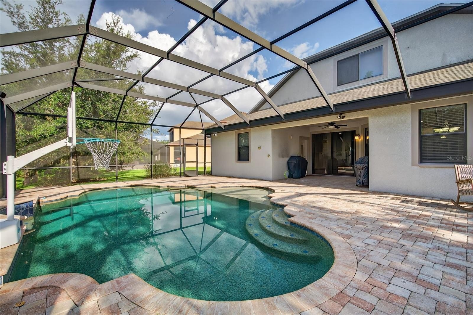 Step outside to your private backyard oasis—an oversized screened-in paver patio showcases a resort-style pool with Pebble Tec finish and shallow lounge area, perfect for cooling off on hot Florida days.