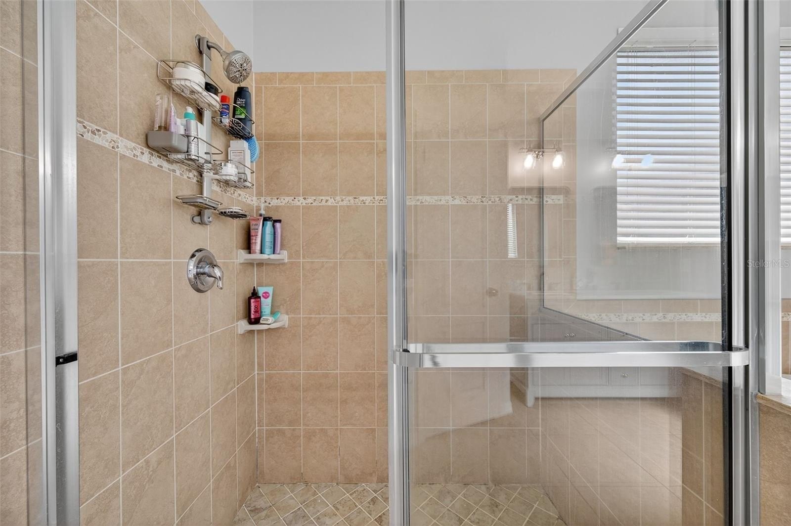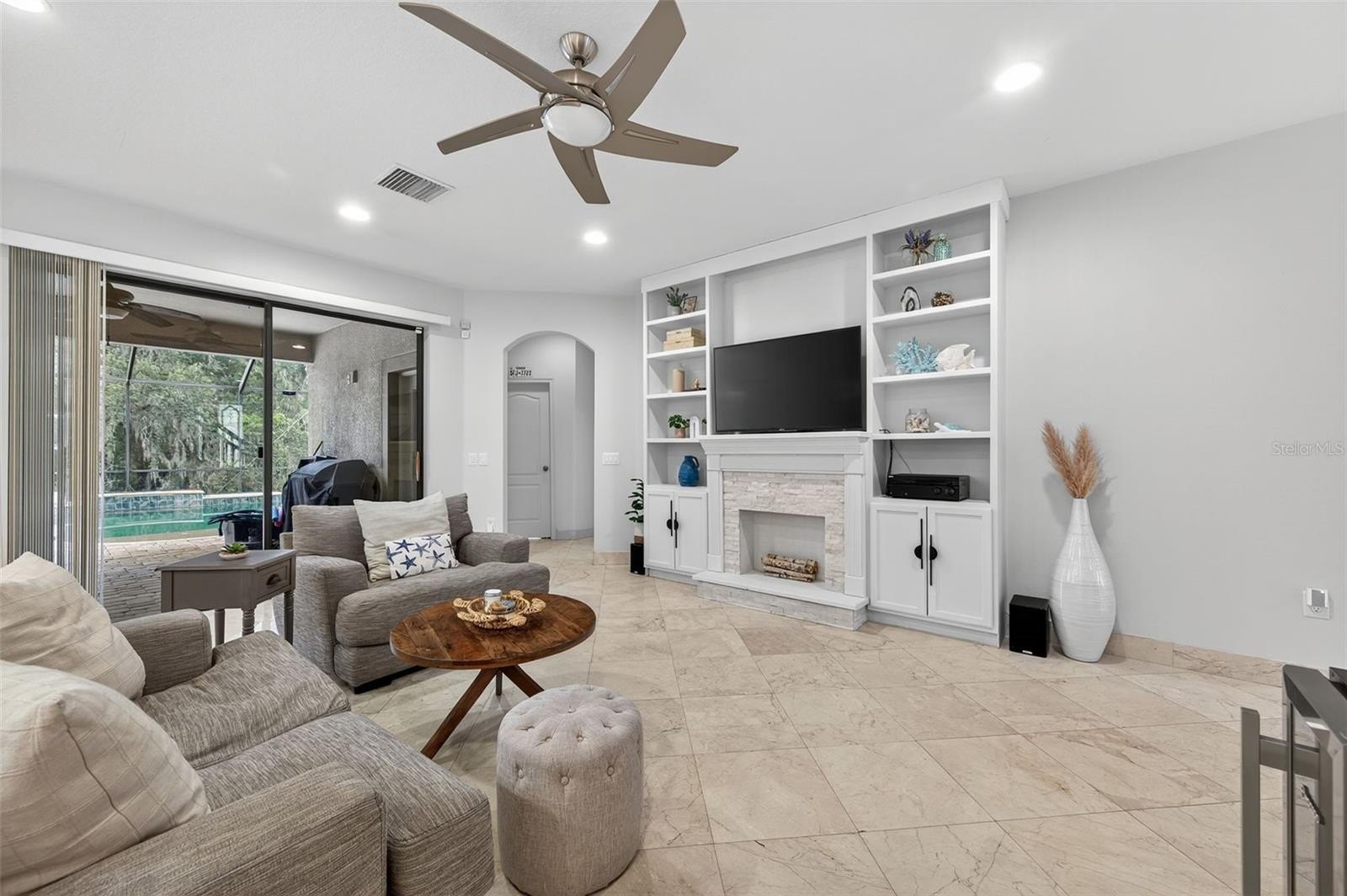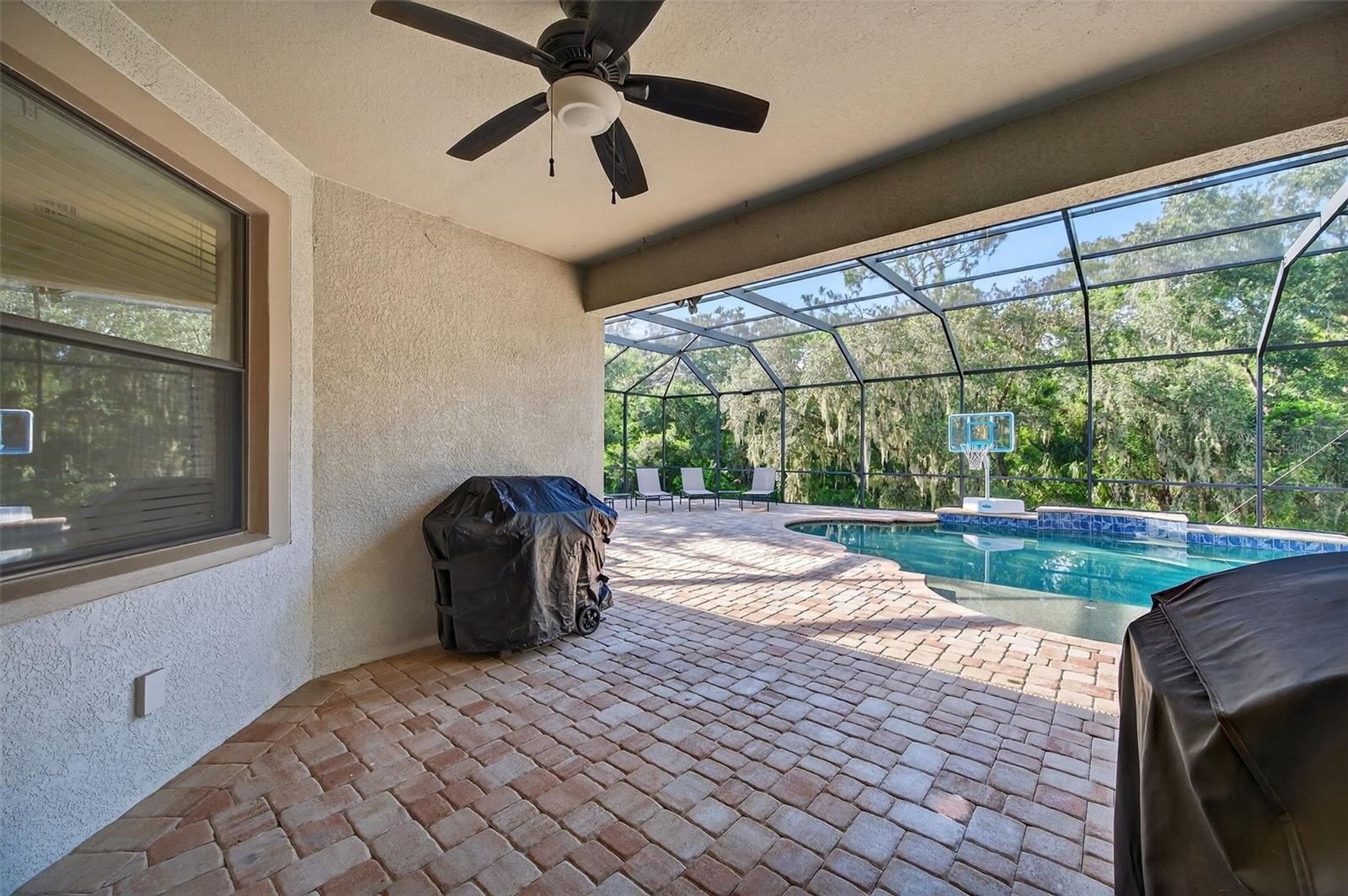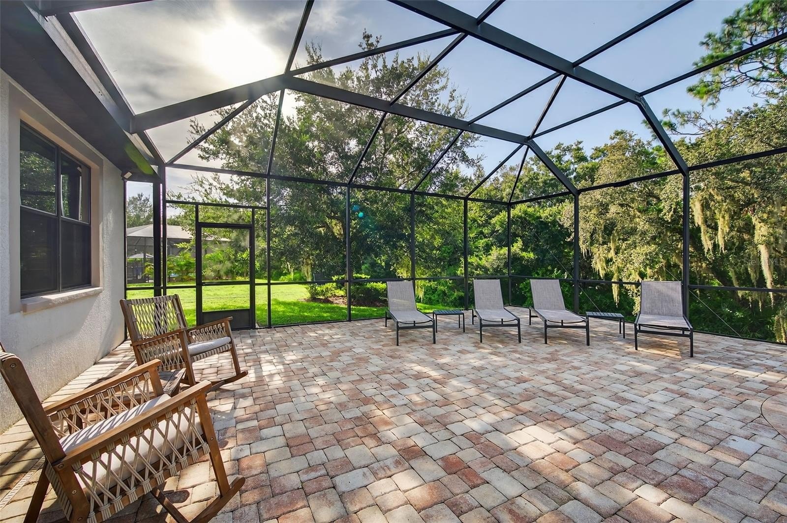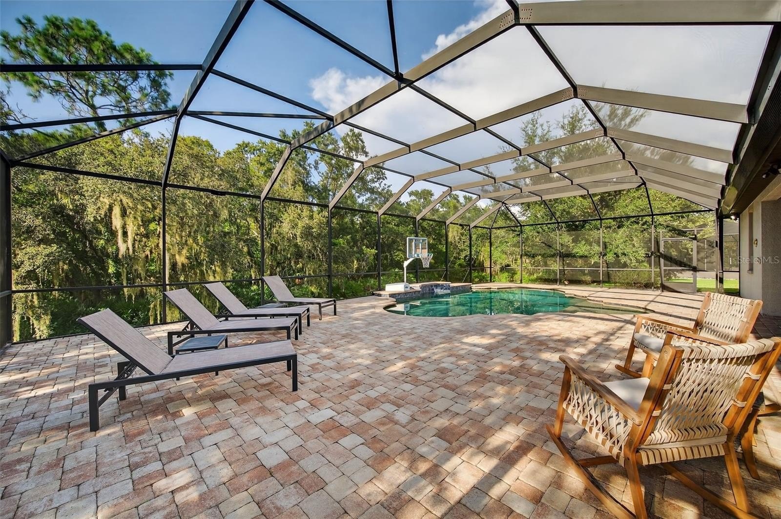 Step outside to your private backyard oasis—an oversized screened-in paver patio showcases a resort-style pool with Pebble Tec finish and shallow lounge area, perfect for cooling off on hot Florida days.