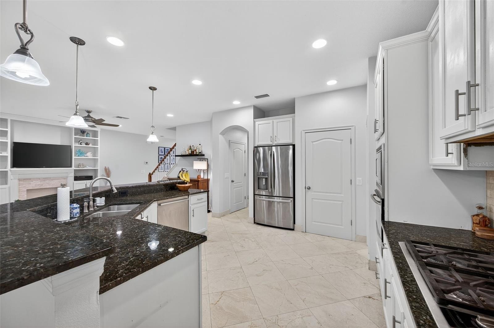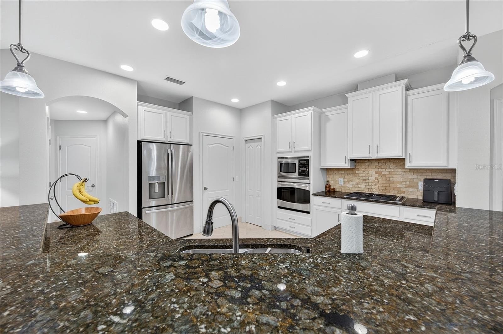 The chef’s kitchen is a showstopper—featuring upgraded 42” cabinets with modern hardware, stunning granite countertops, a premium Wolf gas cooktop, custom pantry shelving. The split floor plan ensures maximum privacy, with the oversized primary suite tucked away for quiet retreat.