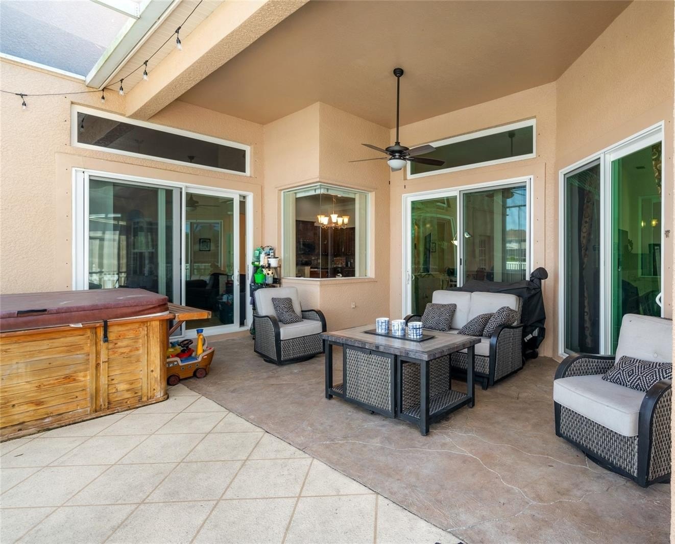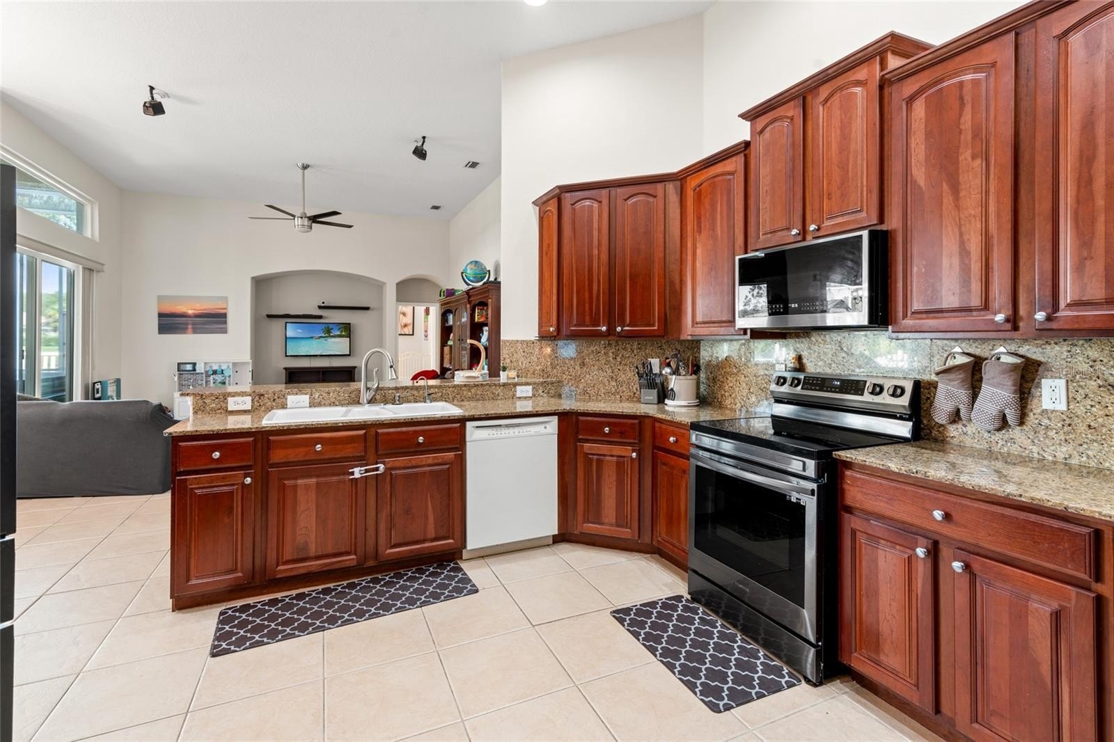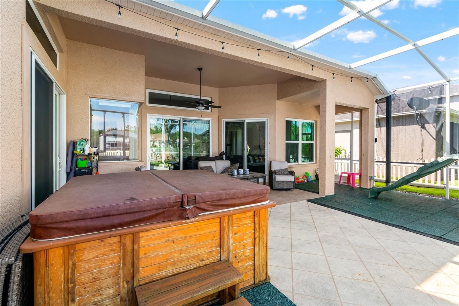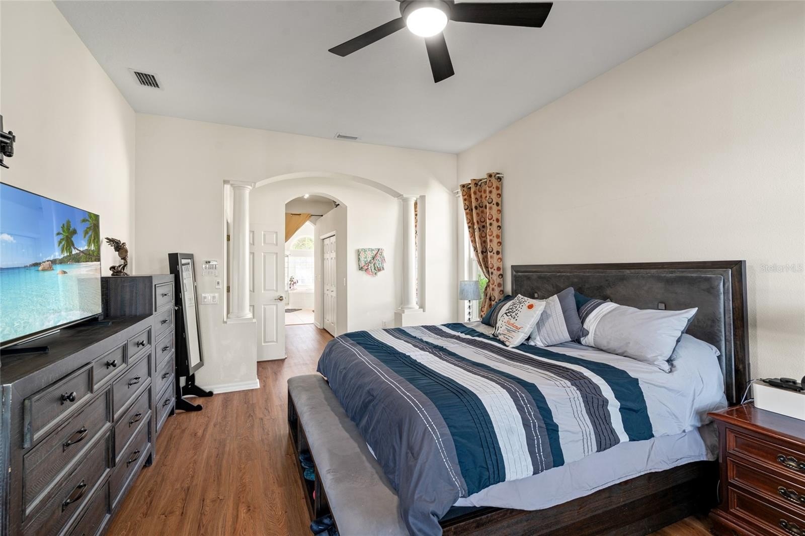 Step inside the grand entry with soaring cathedral ceilings and enjoy a light-filled kitchen. The open-concept layout offers a large family room flowing to an expansive screened lanai with golf course and water views, plus a relaxing hot tub. The main level features 4 bedrooms, including a spacious owner’s suite with dual closets and a luxurious bath. Upstairs, a private bedroom suite with full bath and separate entry is perfect for guests or multigenerational living.