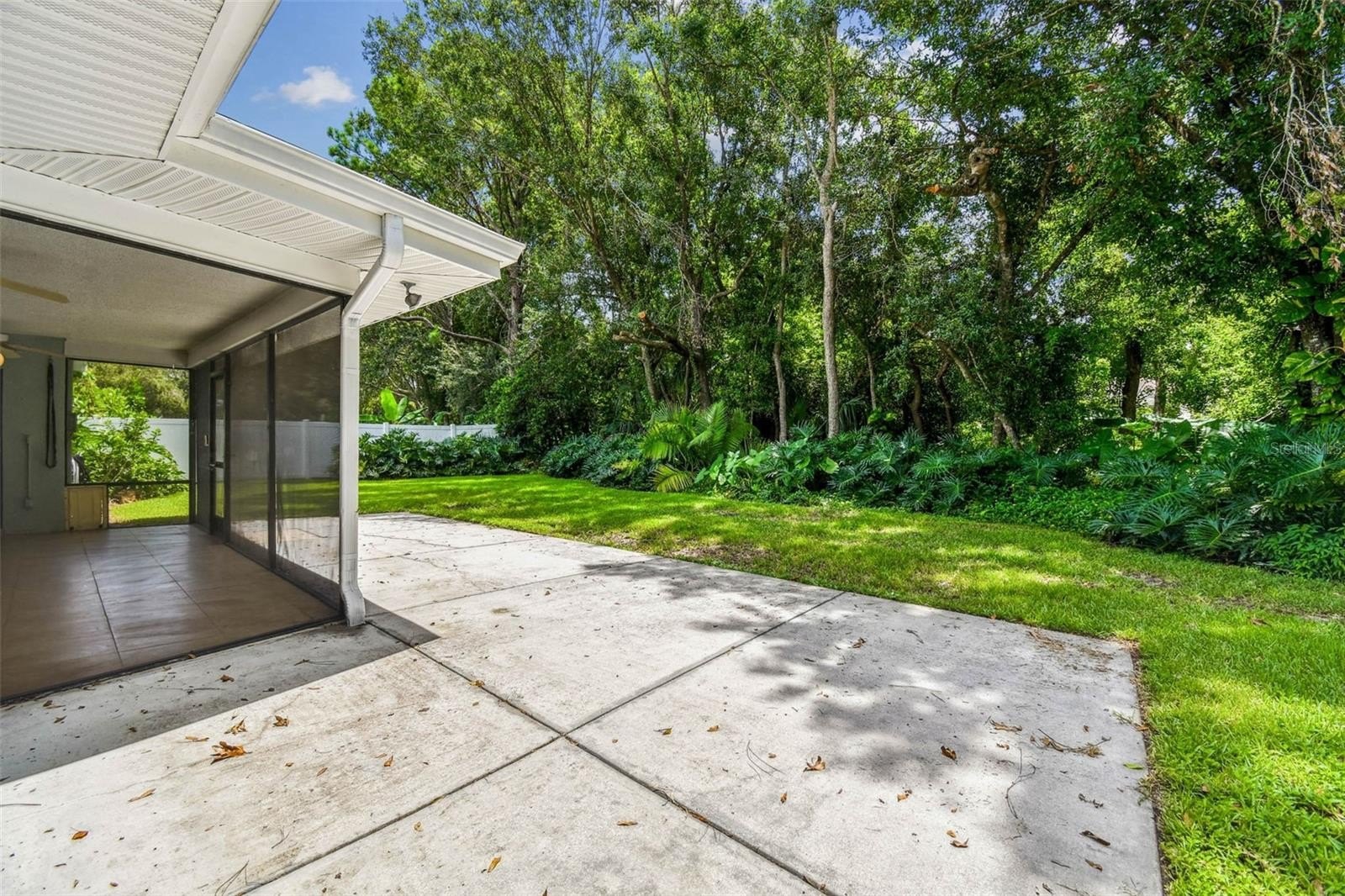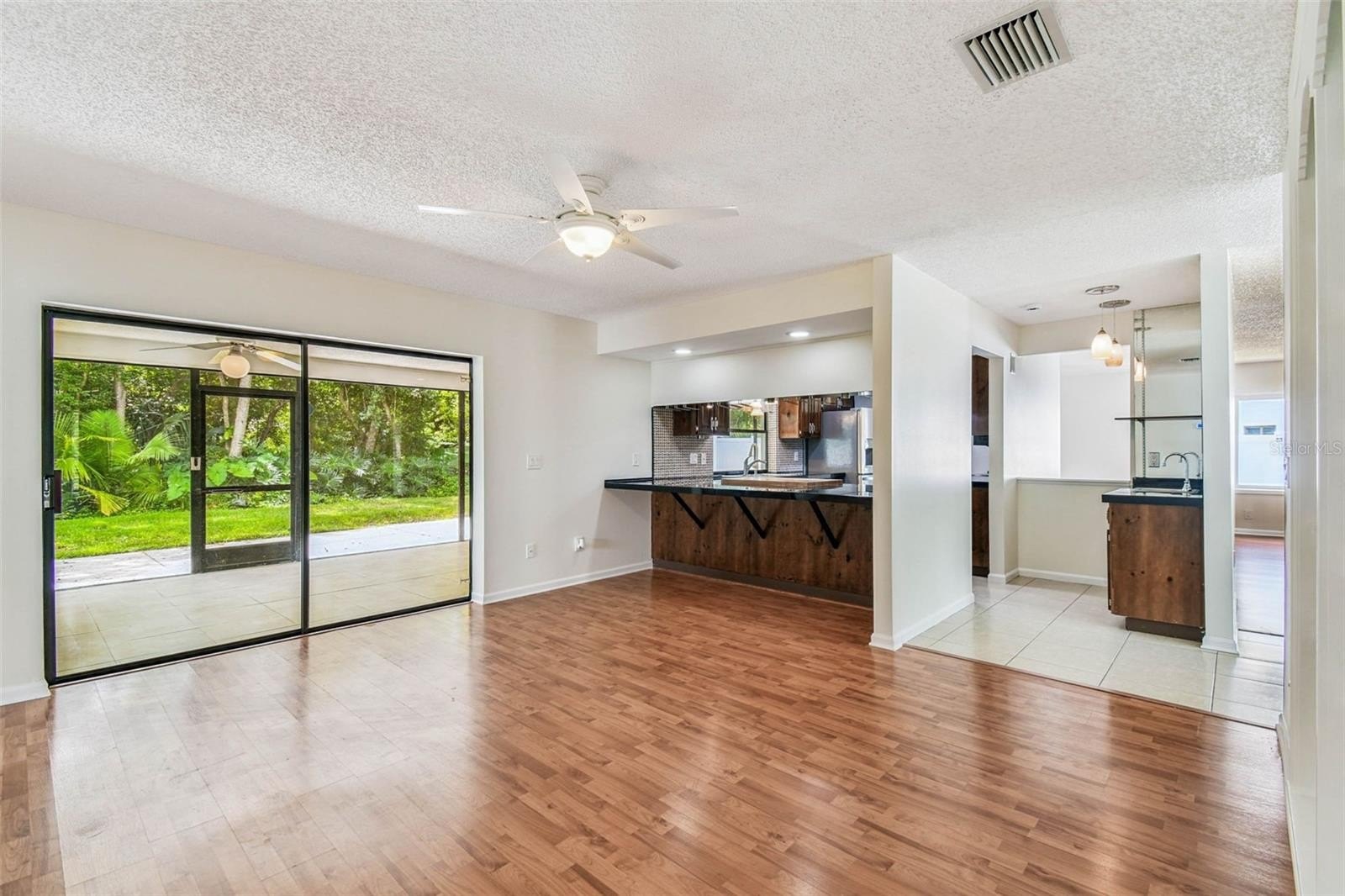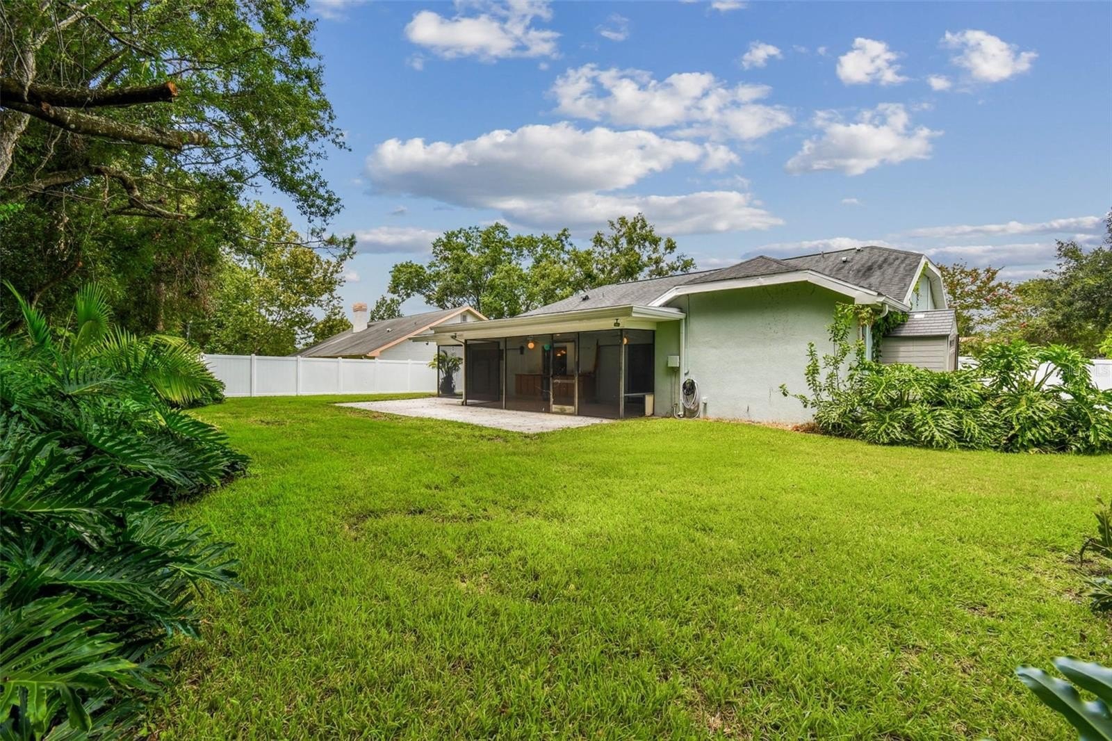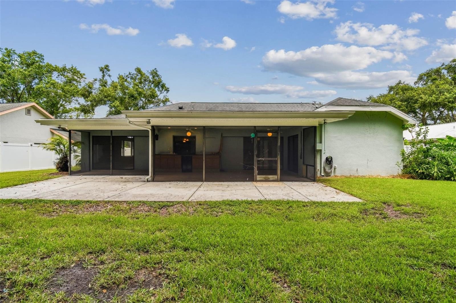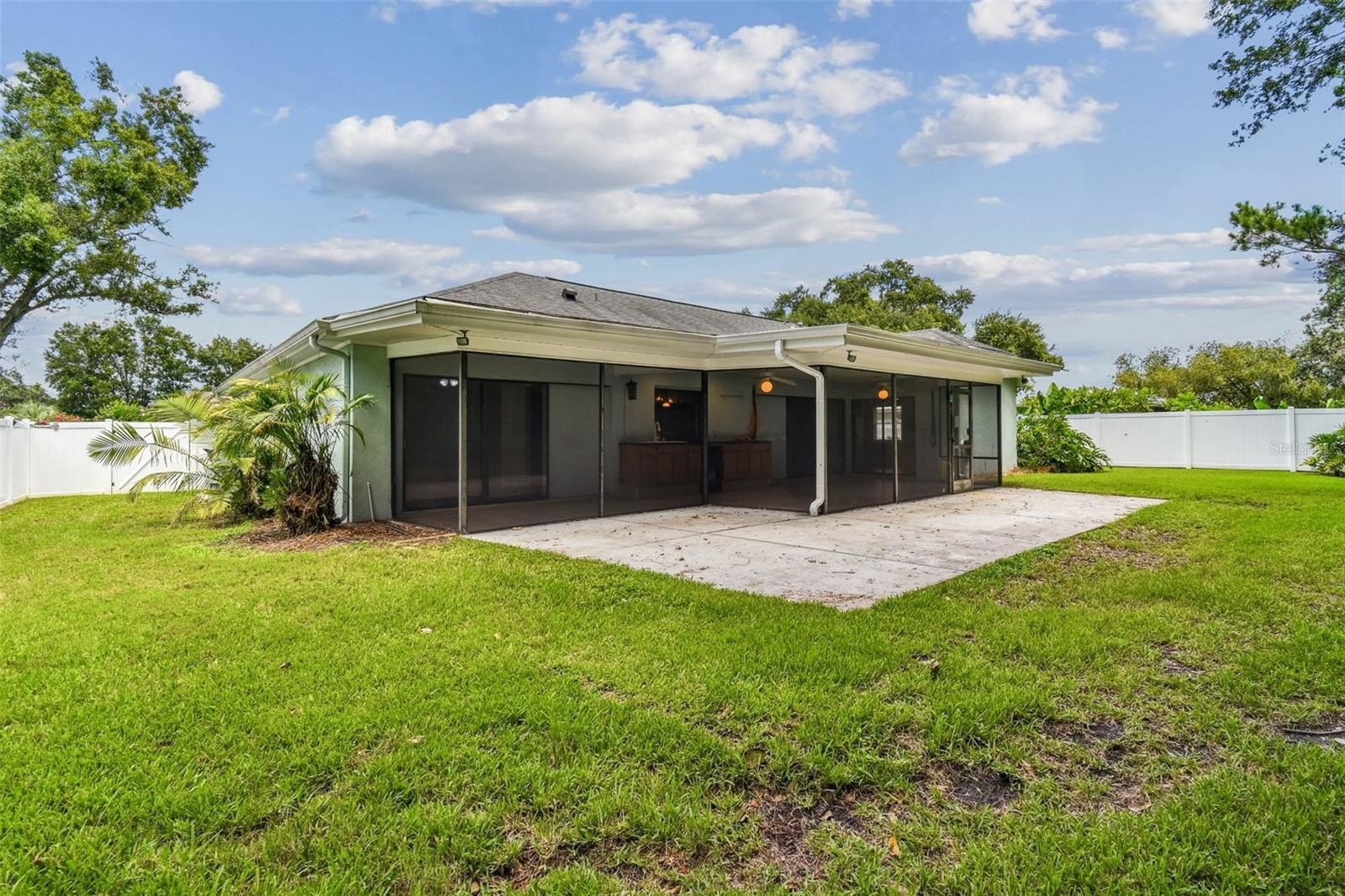 Located in the lovely community of Pebble Creek Village in New Tampa, this charming single story home offers 3 bedrooms, 2 bathrooms and generous living spaces throughout. The extra large living room is perfect for relaxing or entertaining and is conveniently connected to a stylish wet bar-ideal for hosting or enjoying an evening cocktail. A bright dining area with sliding glass doors leads to the over-sized screened lanai, featuring a built in sink and minifridge for outdoor entertaining. The expansive kitchen is equipped with a breakfast bar, newer appliances, window to the porch and open views into the separate family room, making it the true heart of the home. The spacious owner's suite is a private retreat, boasting an ensuite bath and walk in closet. Two additional bedrooms are separate with their own full bathroom, providing comfort and privacy for family or guests. Set on a fenced 86 x 112 lot, the back of the property provides mature trees for ambiance and privacy. Take advantage of the ample greenspace for outdoor living or family sports. The indoor laundry room includes washer, dryer, large sink basin and cabinets galore for all your storage needs. Enjoy all the conveniences of Pebble Creek living-just minutes to schools, shopping, restaurants and major interstates for easy commutes.