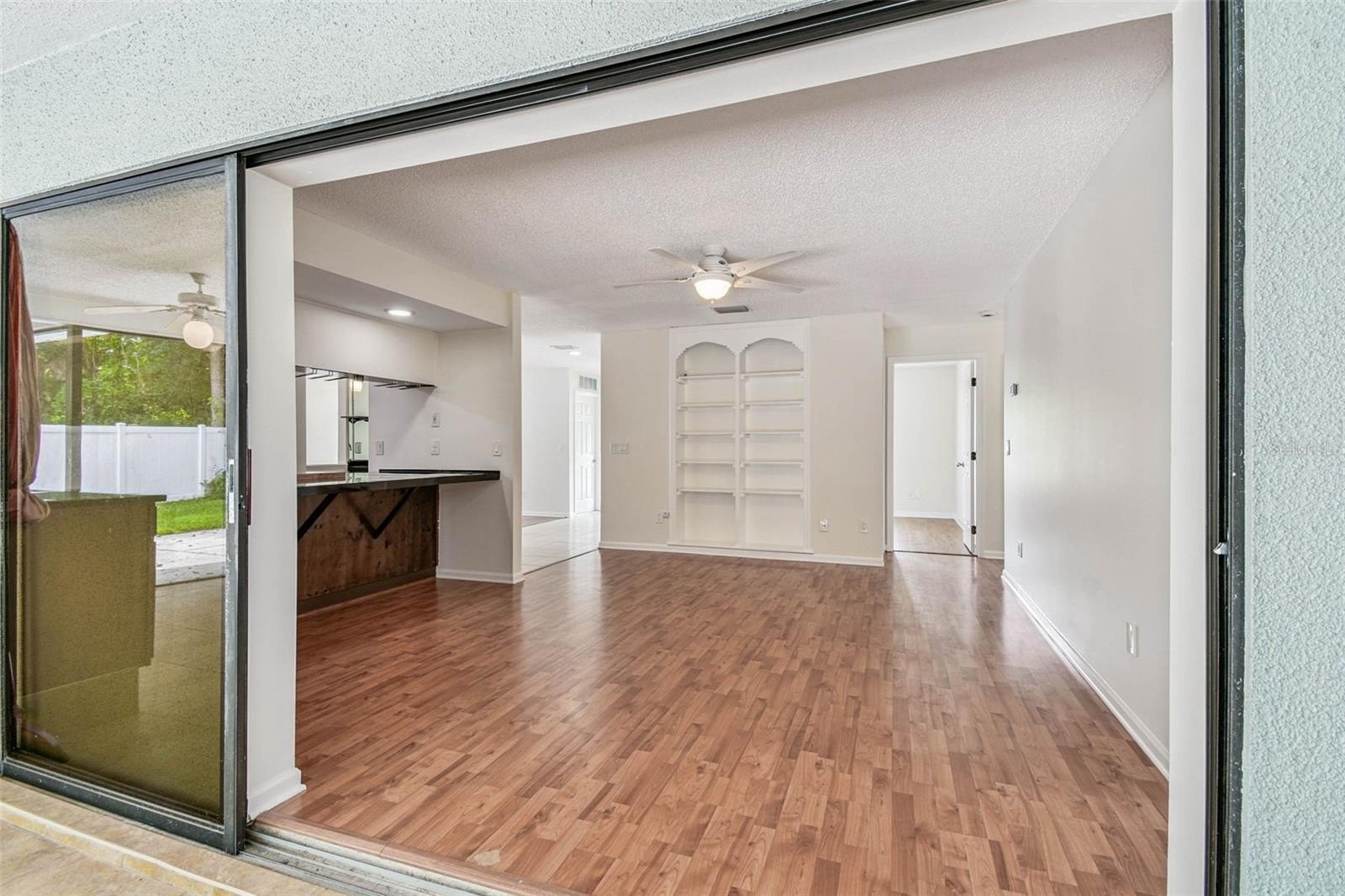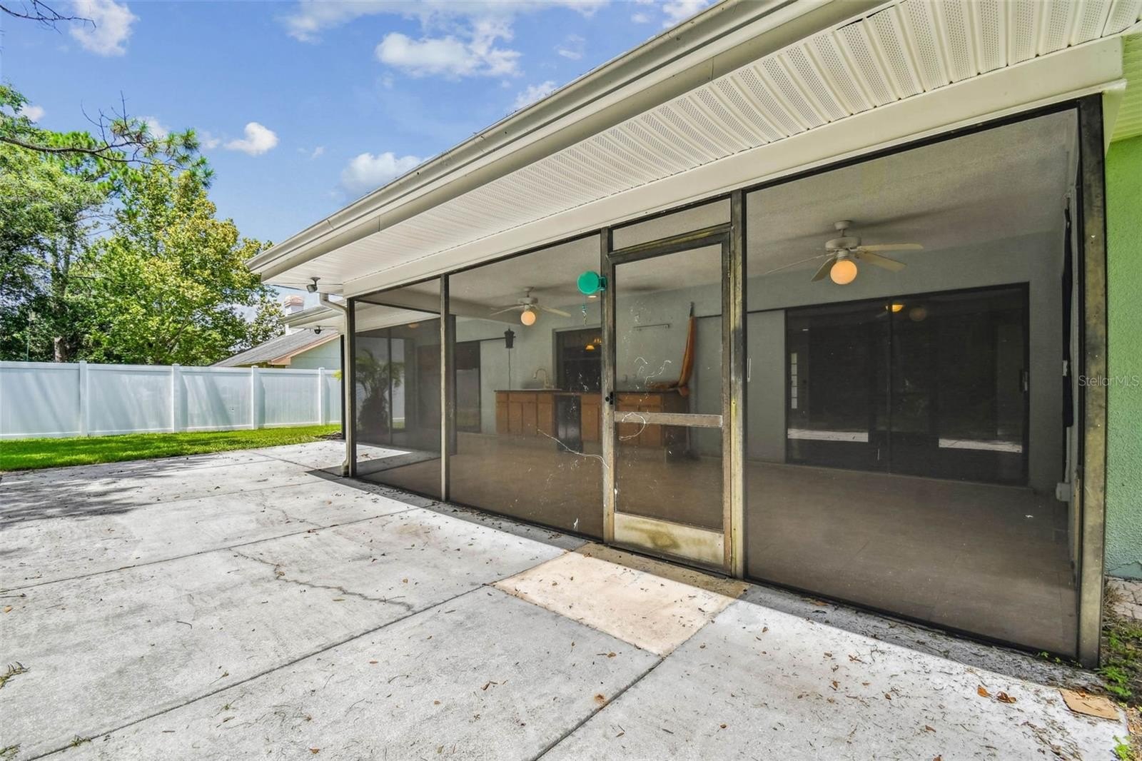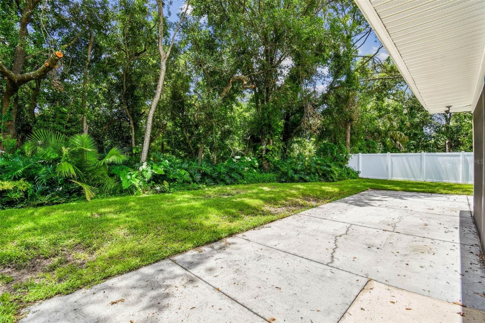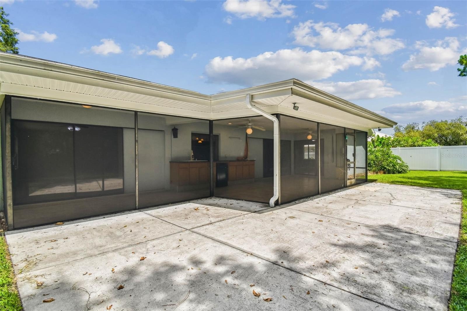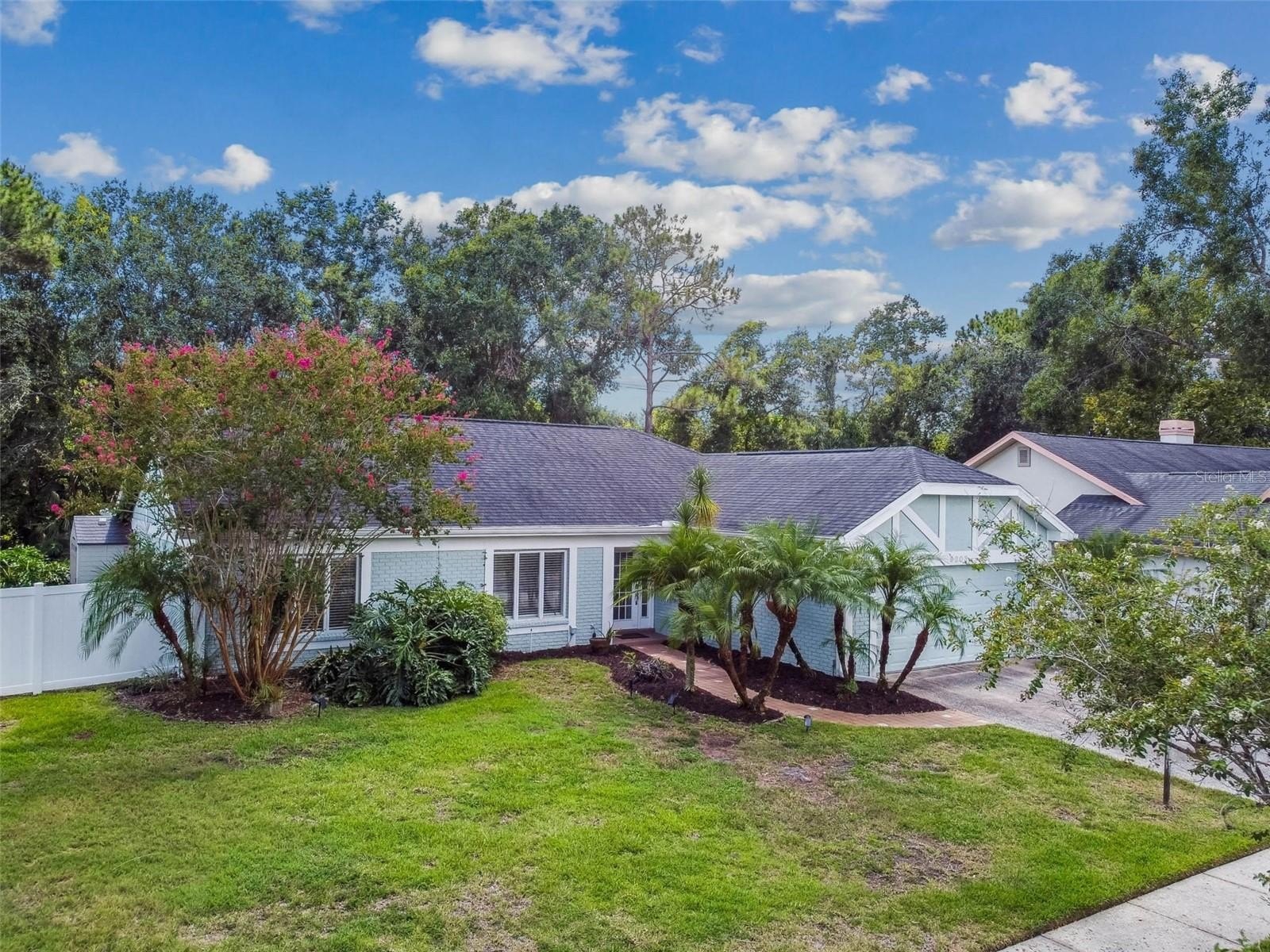 Located in the lovely community of Pebble Creek Village in New Tampa, this charming single story home offers 3 bedrooms, 2 bathrooms and generous living spaces throughout. The extra large living room is perfect for relaxing or entertaining and is conveniently connected to a stylish wet bar-ideal for hosting or enjoying an evening cocktail. A bright dining area with sliding glass doors leads to the over-sized screened lanai, featuring a built in sink and minifridge for outdoor entertaining. The expansive kitchen is equipped with a breakfast bar, newer appliances, window to the porch and open views into the separate family room, making it the true heart of the home. The spacious owner's suite is a private retreat, boasting an ensuite bath and walk in closet. Two additional bedrooms are separate with their own full bathroom, providing comfort and privacy for family or guests. Set on a fenced 86 x 112 lot, the back of the property provides mature trees for ambiance and privacy. Take advantage of the ample greenspace for outdoor living or family sports. The indoor laundry room includes washer, dryer, large sink basin and cabinets galore for all your storage needs. Enjoy all the conveniences of Pebble Creek living-just minutes to schools, shopping, restaurants and major interstates for easy commutes.
