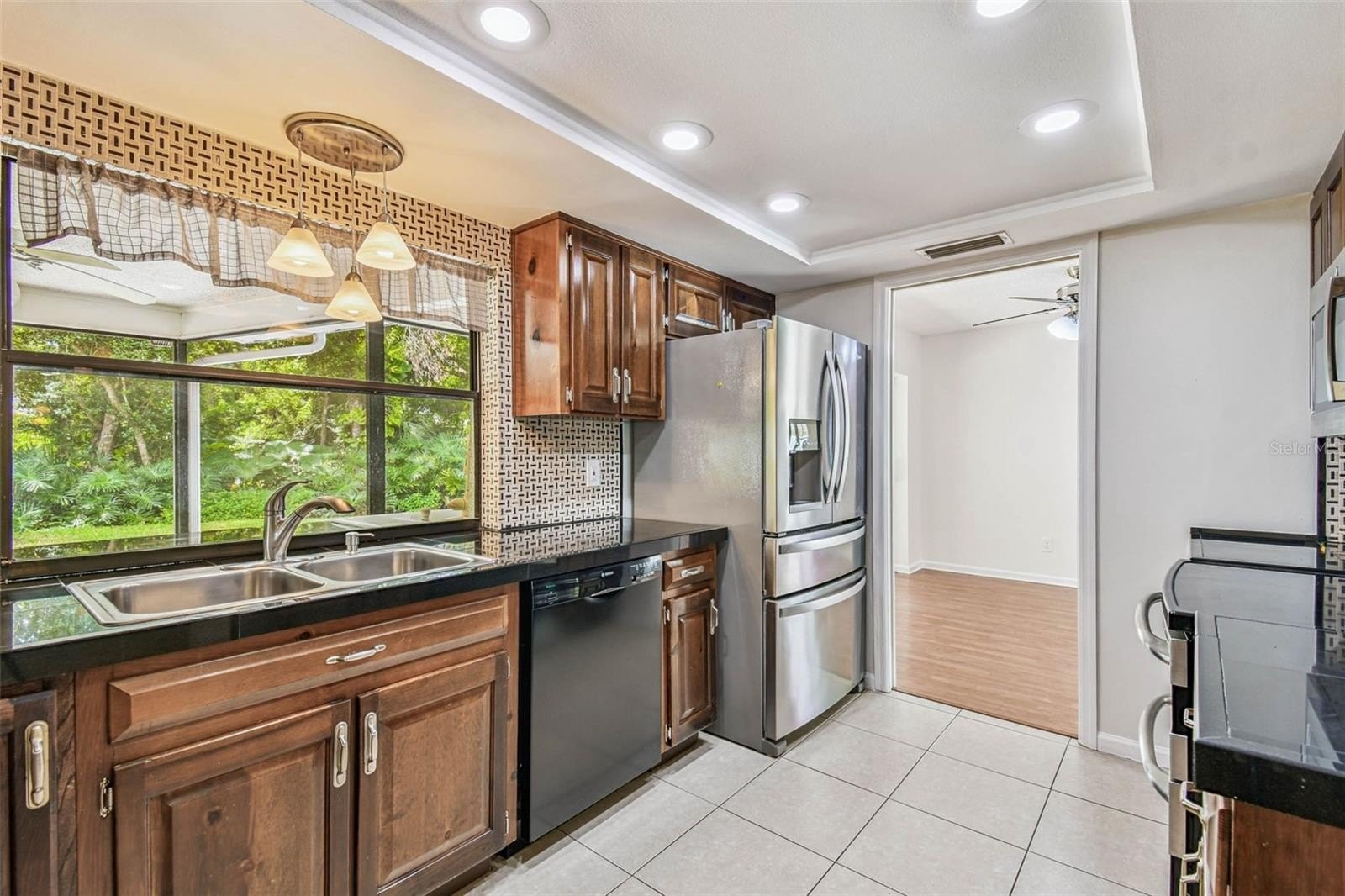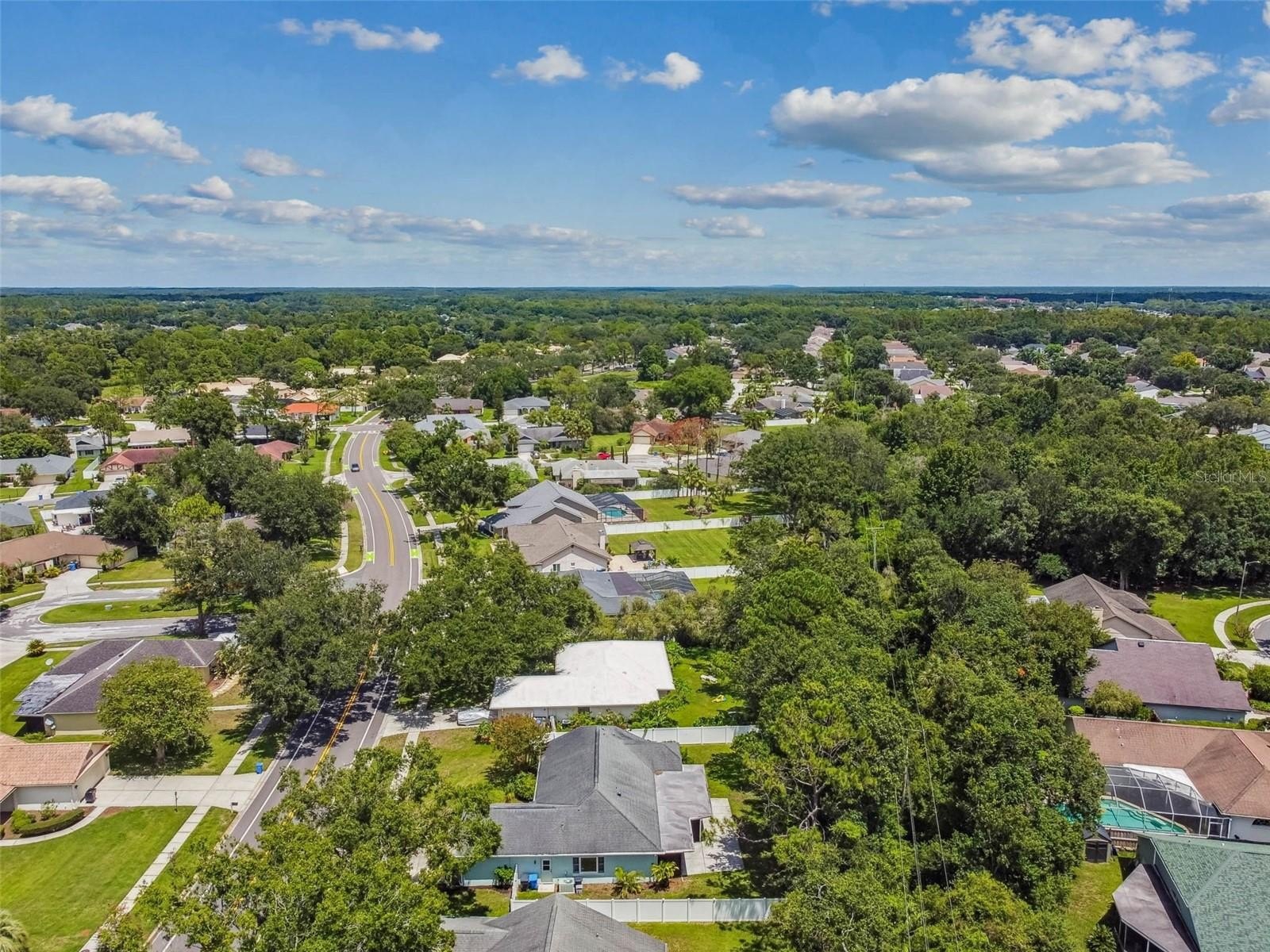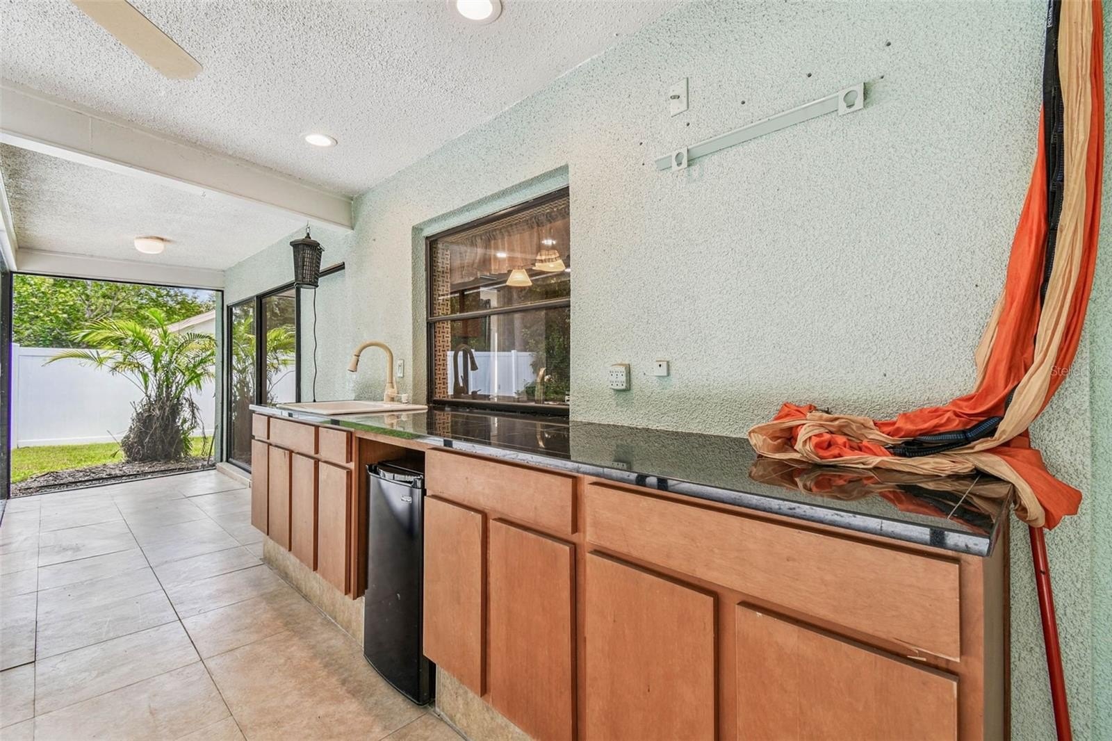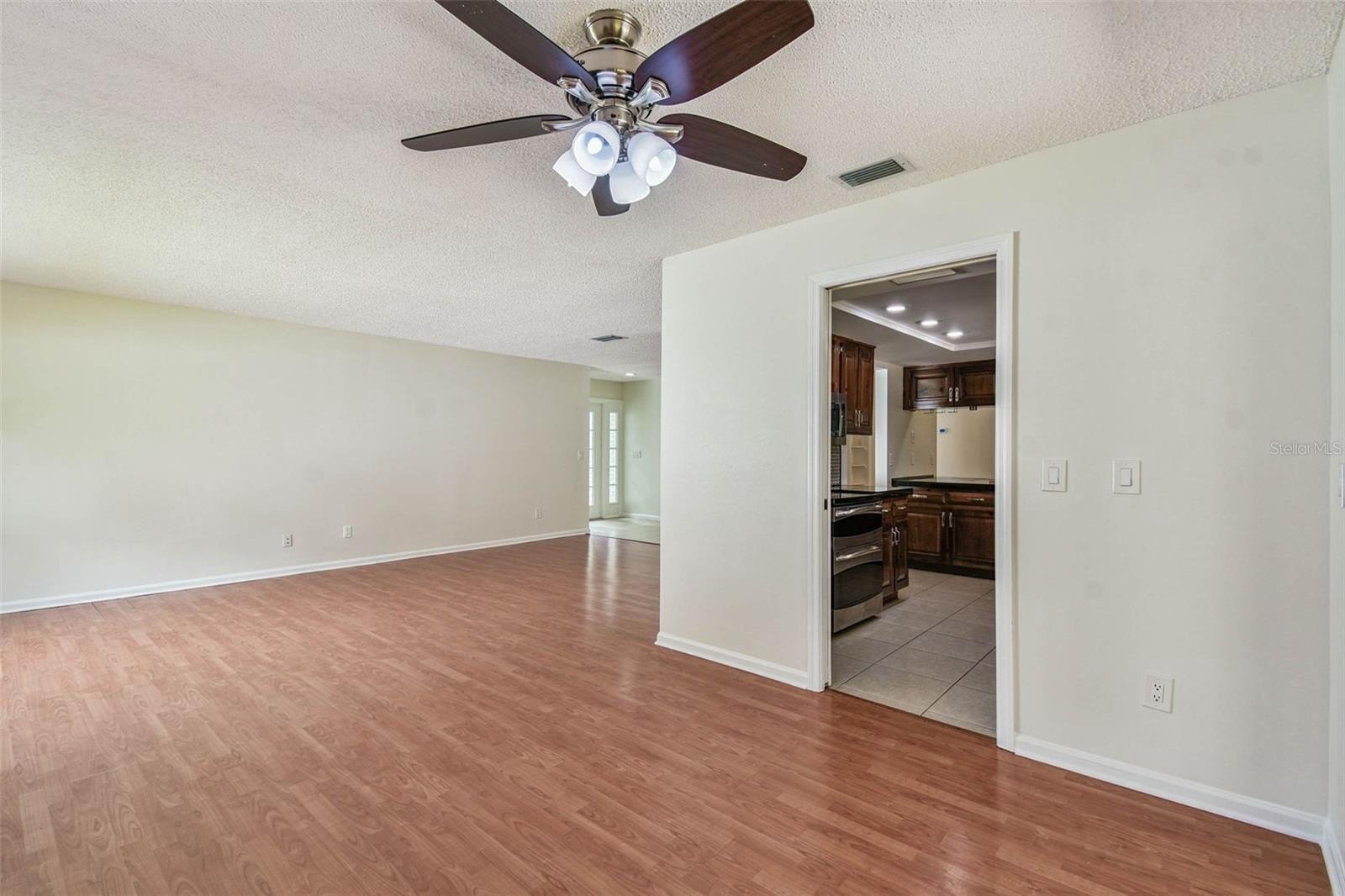 Located in the lovely community of Pebble Creek Village in New Tampa, this charming single story home offers 3 bedrooms, 2 bathrooms and generous living spaces throughout. The extra large living room is perfect for relaxing or entertaining and is conveniently connected to a stylish wet bar-ideal for hosting or enjoying an evening cocktail. A bright dining area with sliding glass doors leads to the over-sized screened lanai, featuring a built in sink and minifridge for outdoor entertaining. The expansive kitchen is equipped with a breakfast bar, newer appliances, window to the porch and open views into the separate family room, making it the true heart of the home. The spacious owner's suite is a private retreat, boasting an ensuite bath and walk in closet. Two additional bedrooms are separate with their own full bathroom, providing comfort and privacy for family or guests. Set on a fenced 86 x 112 lot, the back of the property provides mature trees for ambiance and privacy. Take advantage of the ample greenspace for outdoor living or family sports. The indoor laundry room includes washer, dryer, large sink basin and cabinets galore for all your storage needs. Enjoy all the conveniences of Pebble Creek living-just minutes to schools, shopping, restaurants and major interstates for easy commutes.