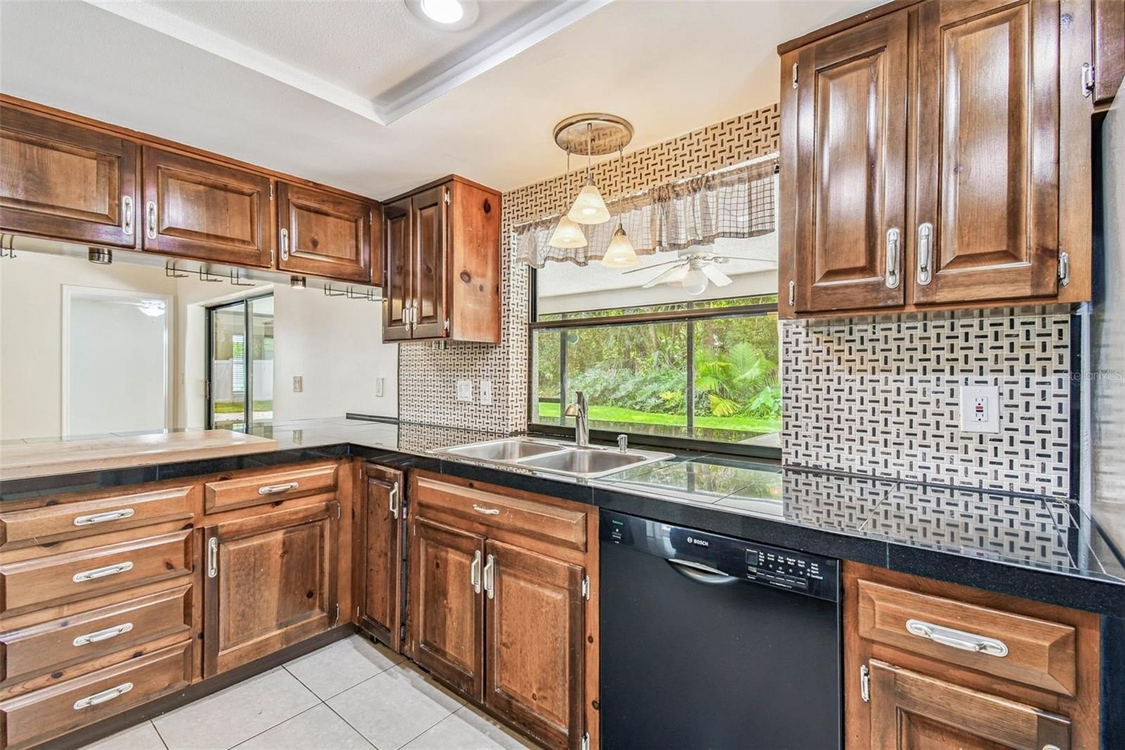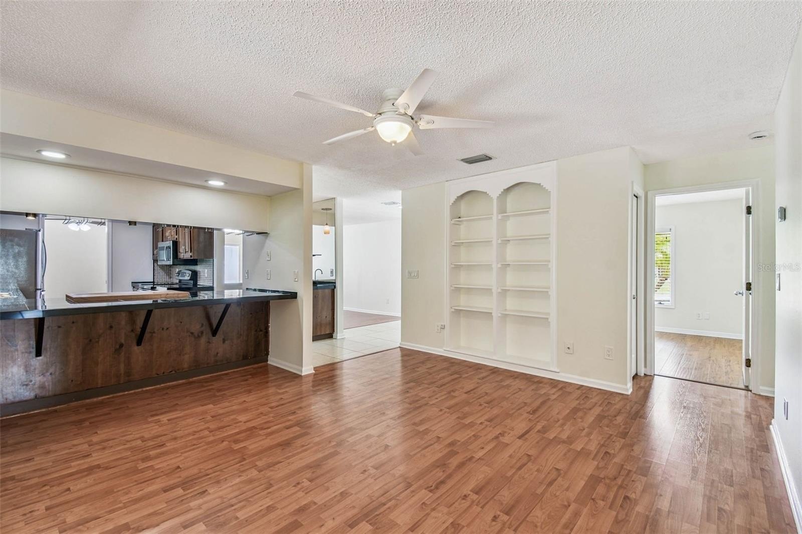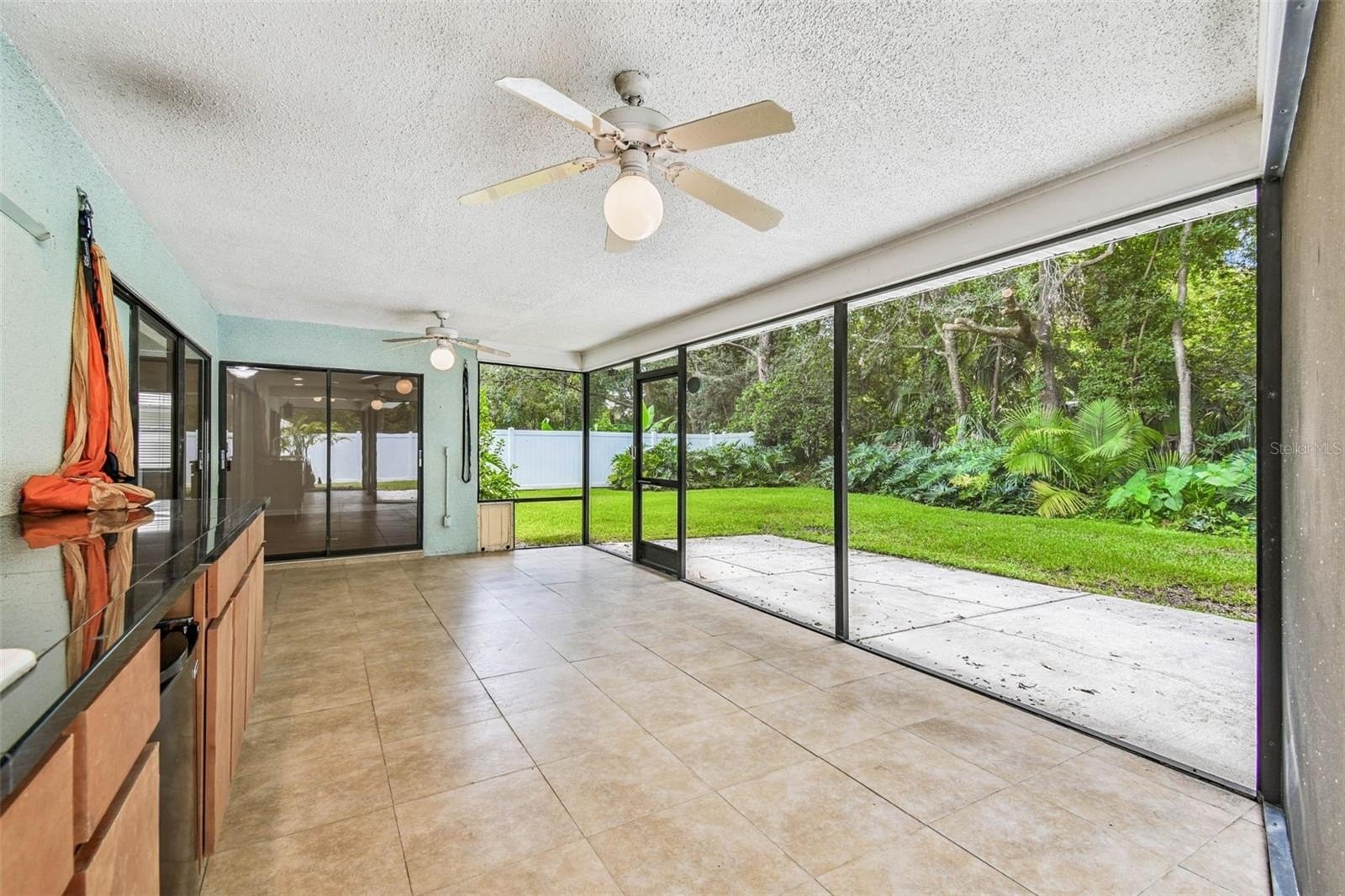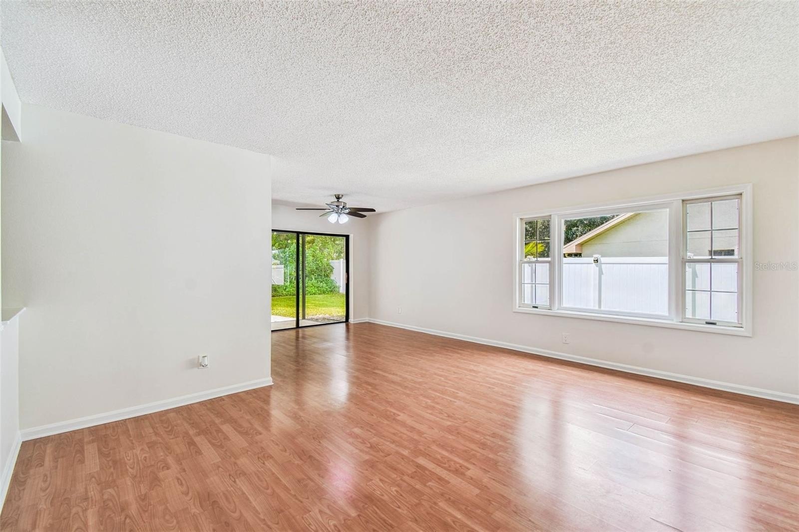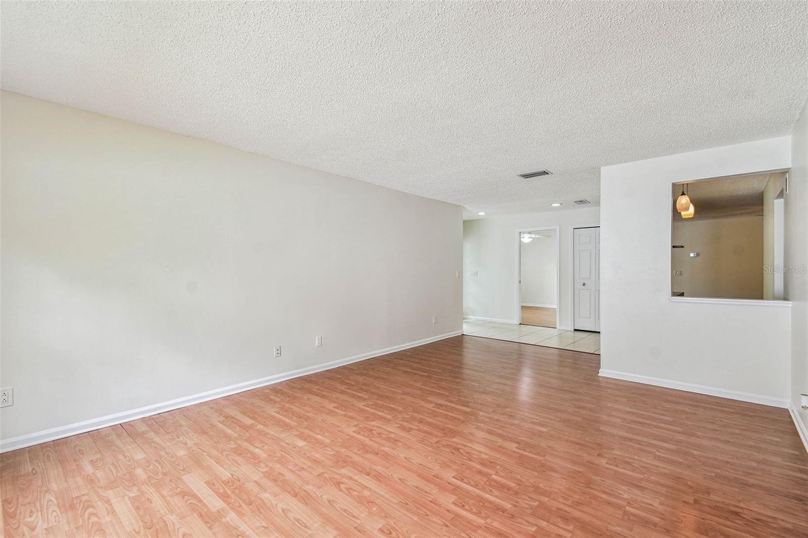 Located in the lovely community of Pebble Creek Village in New Tampa, this charming single story home offers 3 bedrooms, 2 bathrooms and generous living spaces throughout. The extra large living room is perfect for relaxing or entertaining and is conveniently connected to a stylish wet bar-ideal for hosting or enjoying an evening cocktail. A bright dining area with sliding glass doors leads to the over-sized screened lanai, featuring a built in sink and minifridge for outdoor entertaining. The expansive kitchen is equipped with a breakfast bar, newer appliances, window to the porch and open views into the separate family room, making it the true heart of the home. The spacious owner's suite is a private retreat, boasting an ensuite bath and walk in closet. Two additional bedrooms are separate with their own full bathroom, providing comfort and privacy for family or guests. Set on a fenced 86 x 112 lot, the back of the property provides mature trees for ambiance and privacy. Take advantage of the ample greenspace for outdoor living or family sports. The indoor laundry room includes washer, dryer, large sink basin and cabinets galore for all your storage needs. Enjoy all the conveniences of Pebble Creek living-just minutes to schools, shopping, restaurants and major interstates for easy commutes.