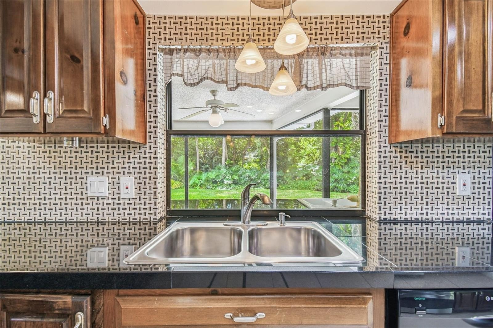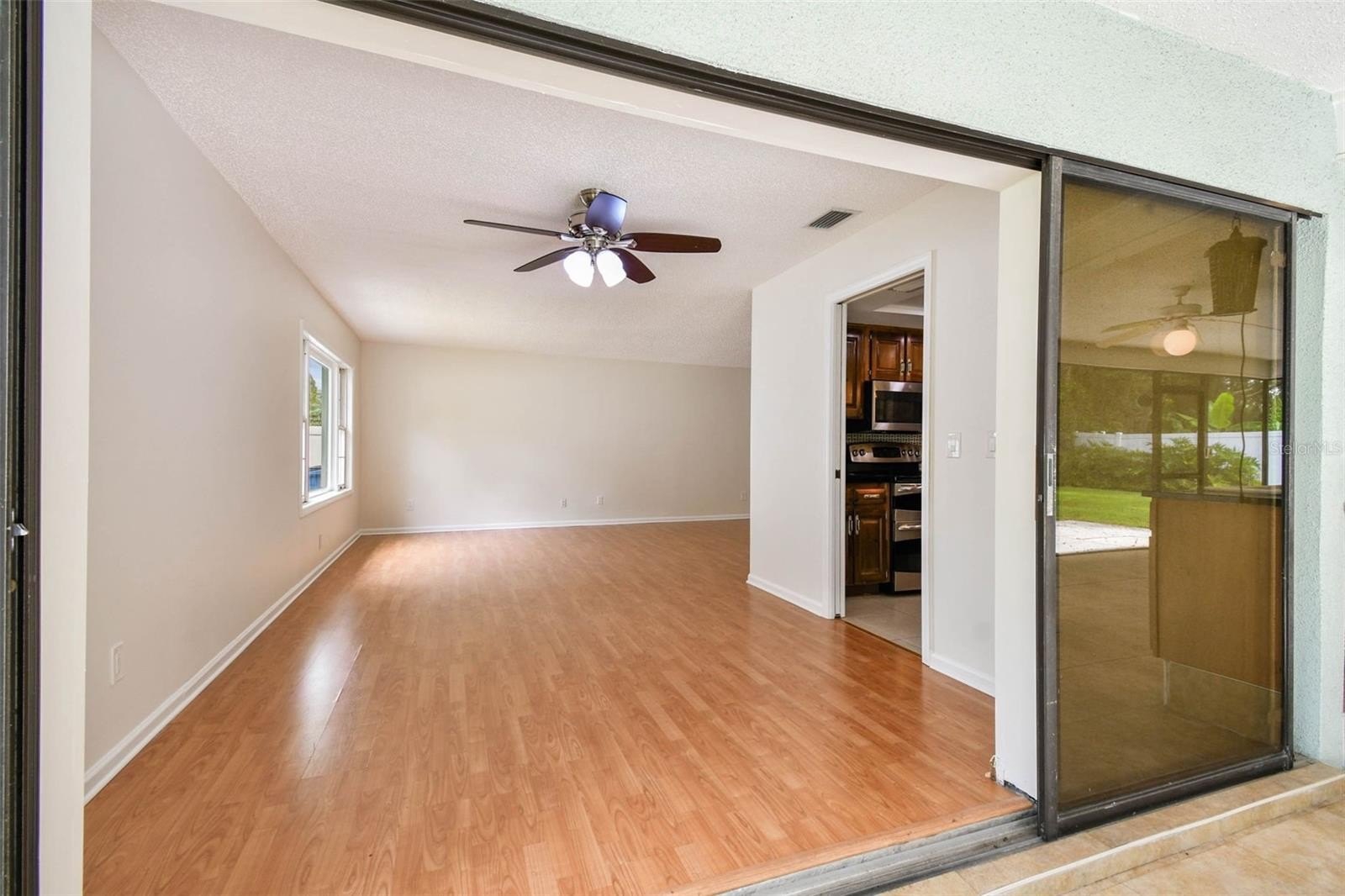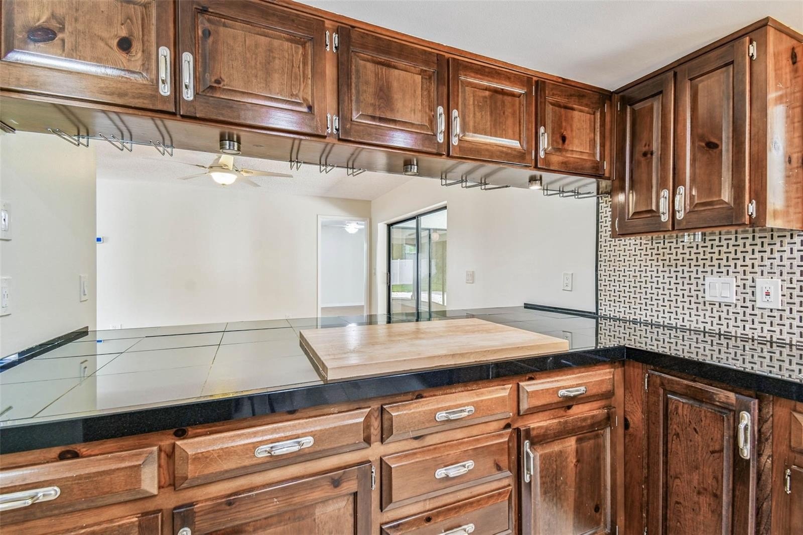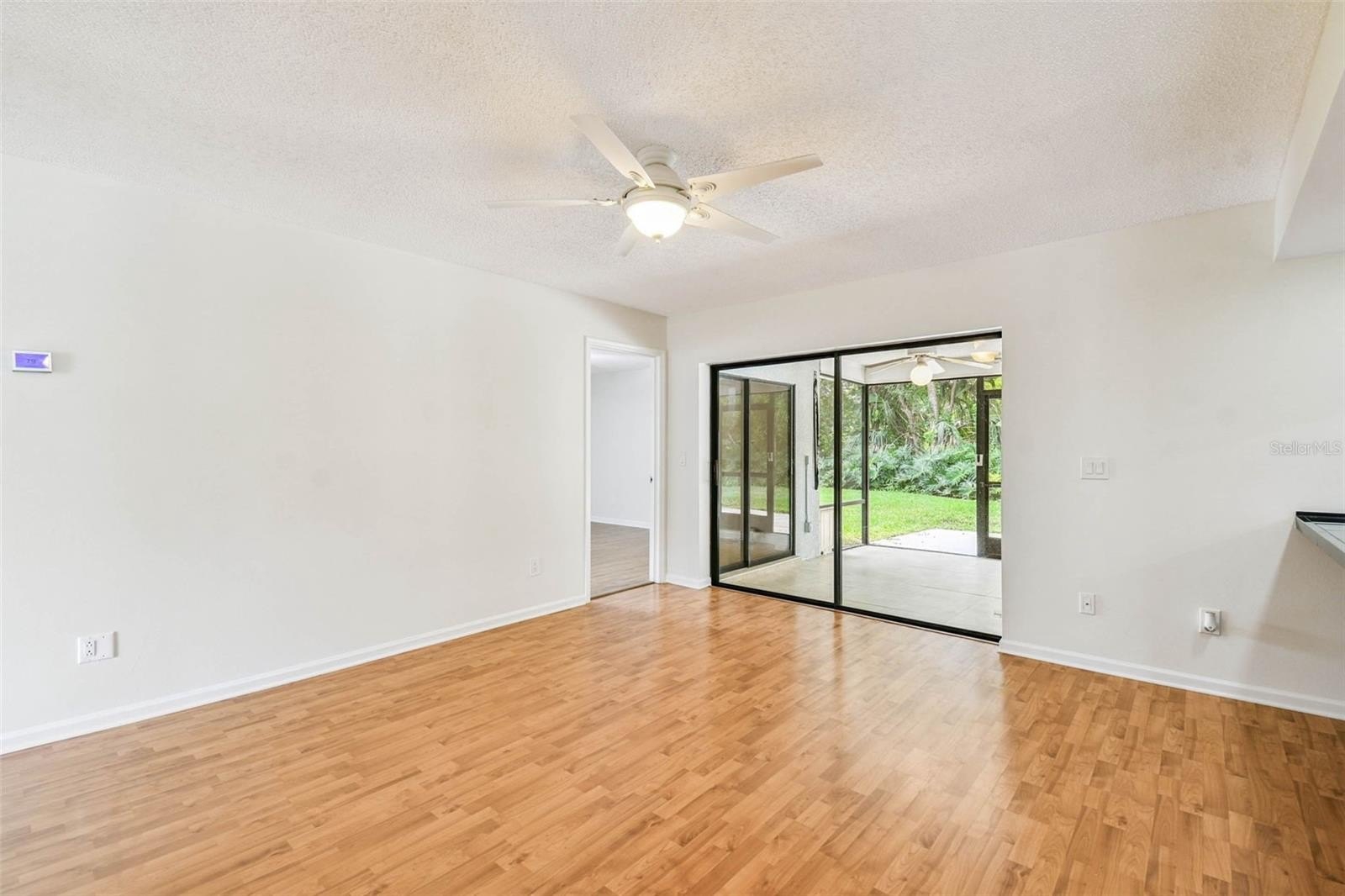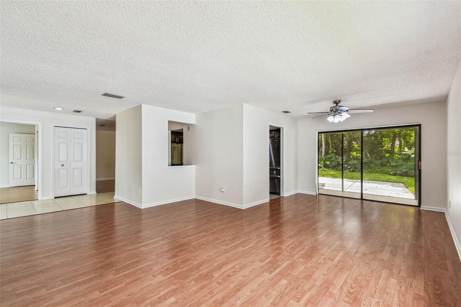Located in the lovely community of Pebble Creek Village in New Tampa, this charming single story home offers 3 bedrooms, 2 bathrooms and generous living spaces throughout. The extra large living room is perfect for relaxing or entertaining and is conveniently connected to a stylish wet bar-ideal for hosting or enjoying an evening cocktail. A bright dining area with sliding glass doors leads to the over-sized screened lanai, featuring a built in sink and minifridge for outdoor entertaining. The expansive kitchen is equipped with a breakfast bar, newer appliances, window to the porch and open views into the separate family room, making it the true heart of the home. The spacious owner's suite is a private retreat, boasting an ensuite bath and walk in closet. Two additional bedrooms are separate with their own full bathroom, providing comfort and privacy for family or guests. Set on a fenced 86 x 112 lot, the back of the property provides mature trees for ambiance and privacy. Take advantage of the ample greenspace for outdoor living or family sports. The indoor laundry room includes washer, dryer, large sink basin and cabinets galore for all your storage needs. Enjoy all the conveniences of Pebble Creek living-just minutes to schools, shopping, restaurants and major interstates for easy commutes.