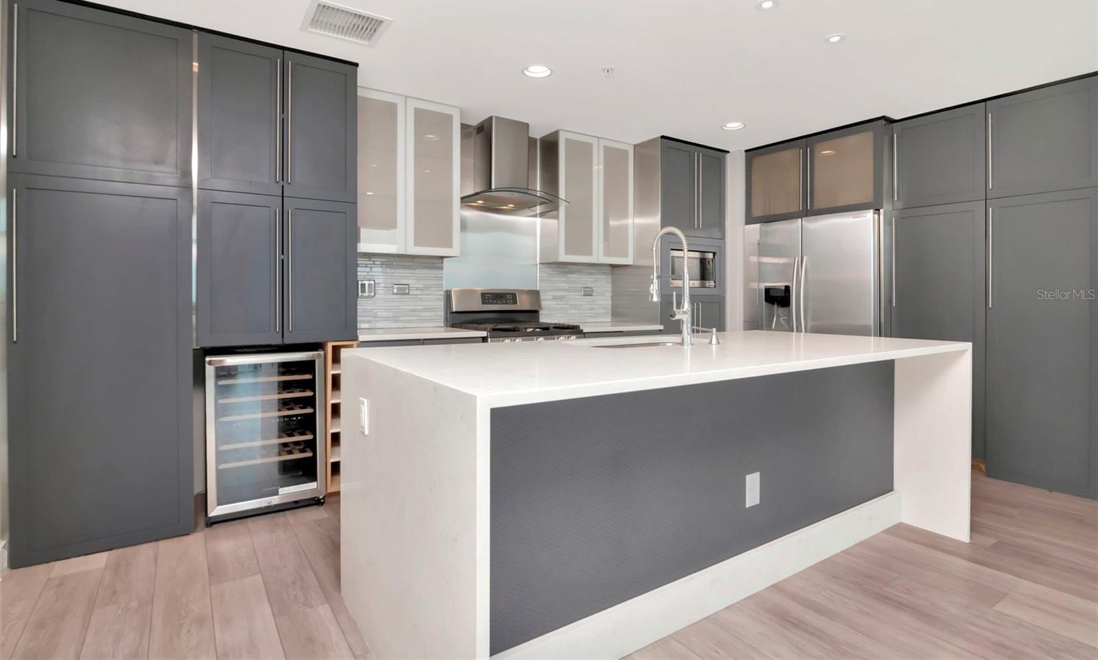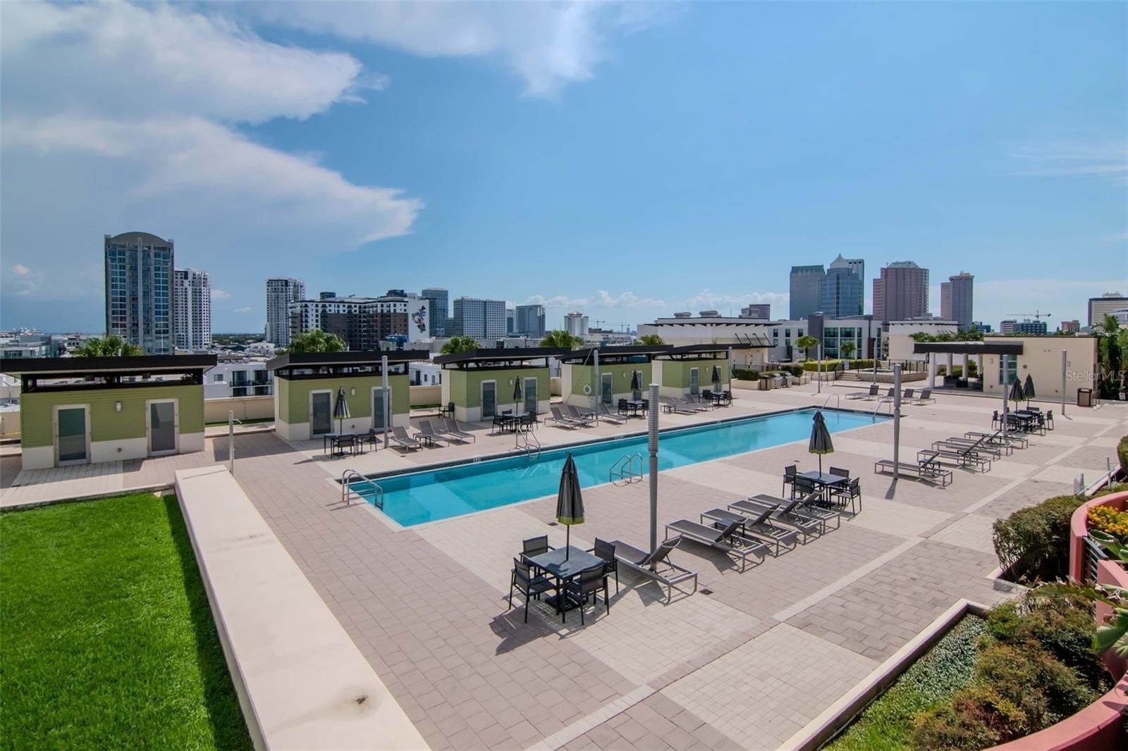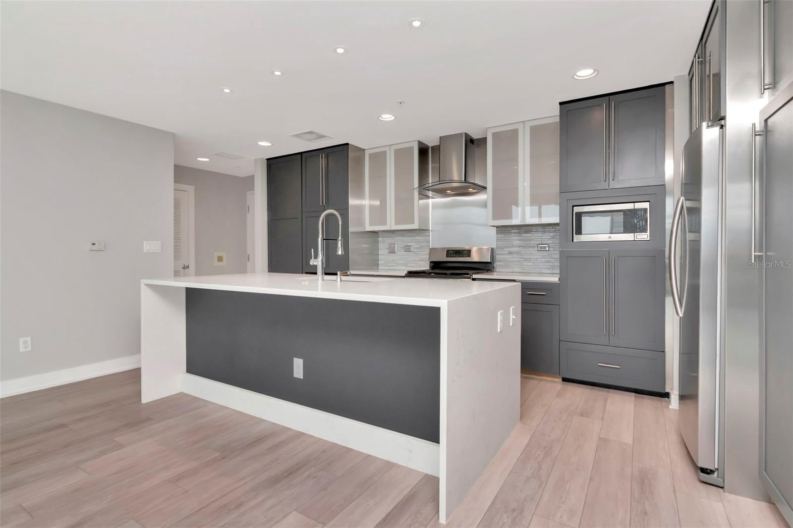 WHEN ONLY THE BEST WILL DO! Experience luxury living in the vibrant heart of downtown Tampa in Grand Central at Kennedy. This exceptional condominium is move-in ready with its professionally updated kitchen, flooring and interior paint. The gourmet chef's kitchen is a masterpiece, featuring custom contemporary cabinets, a grand quartz island with double waterfall edges, attractive backsplash, and newer stainless steel appliances featuring a gas stove, range hood, refrigerator, wine refrigerator, built-in microwave and dishwasher. The living space feels larger with floor-to-ceiling windows providing a picturesque view of the city and pool area below. The 9th-floor rooftop includes 2 pools and hot tubs, a state-of-the-art fitness center, cabanas, a grilling area, a guest-friendly clubhouse, lush green spaces, and a pet walk. This unit comes with a parking space in the gated garage below the building. Grand Central's HOA provides comprehensive services including 24-hour security and concierge, air conditioning, gas, water, sewer, pest control, and trash collection. Owners are responsible only for electric and Wi-Fi. Downstairs convenience also includes covered outdoor social areas, Crunch Fitness, award-winning Cena Italian Restaurant, Pour House, The Poké Company, Massage Envy, Gelato-Go, and Stageworks Theater. You’re also within walking distance to Publix Supermarket, Starbucks, salons, studios, dry cleaners, doctors, and dentists. Across the street, enjoy Pickleball Park and a dog park for outdoor fun. Located in the Channelside District, adjacent to the Water Street District, this prime location provides easy access to Publix, Madison Street Park, GreenWise Market, coffee shops, trolley access to Ybor City, Sparkman Wharf, Amalie Arena, and the Tampa Riverwalk.