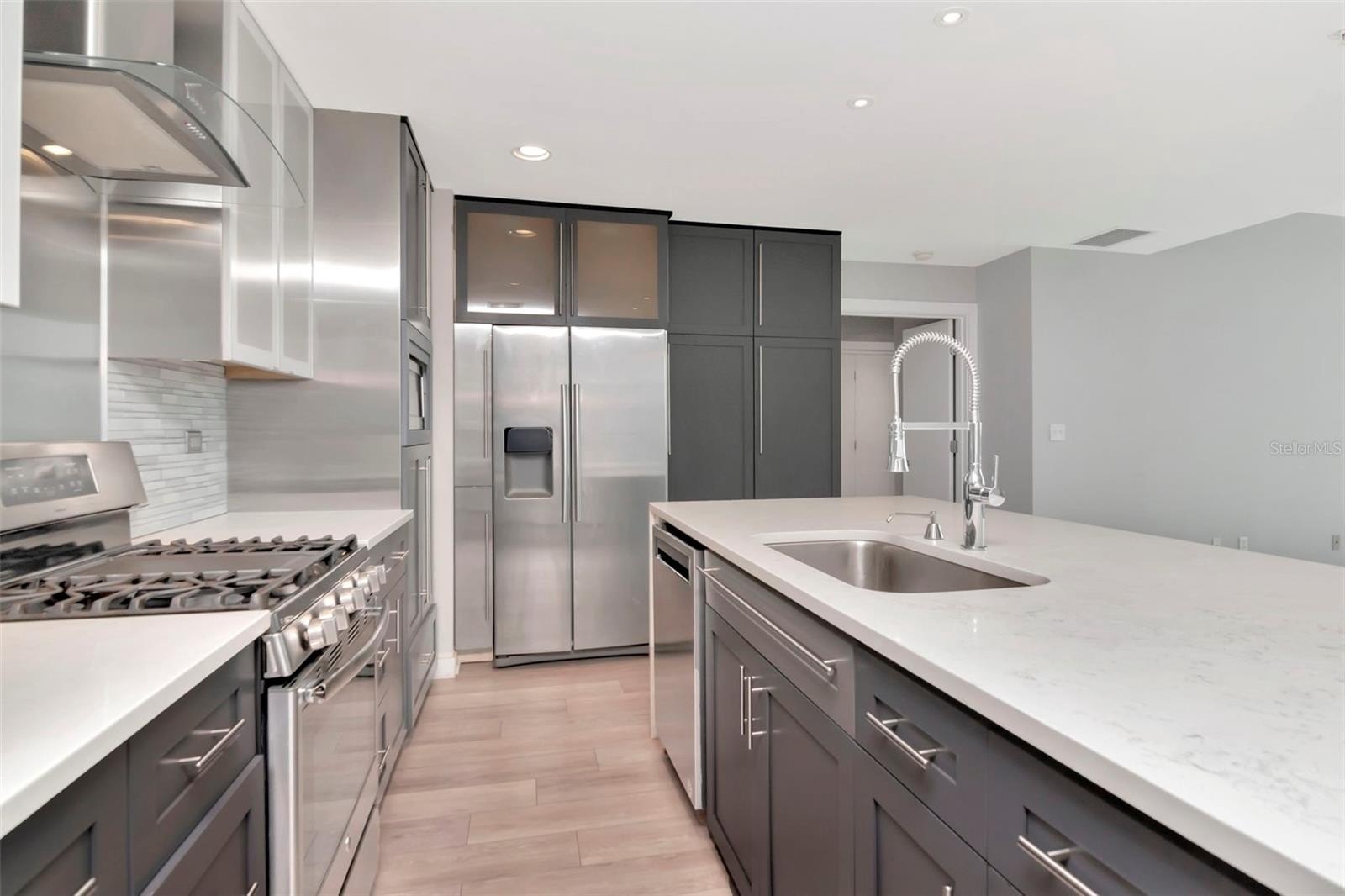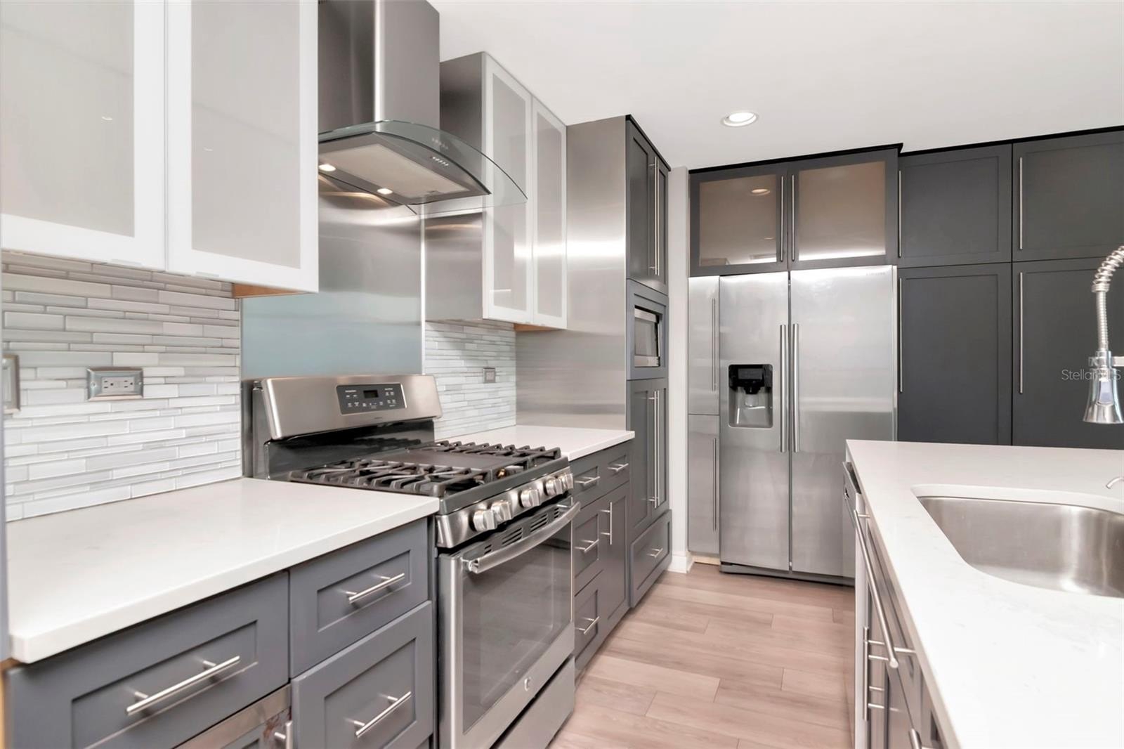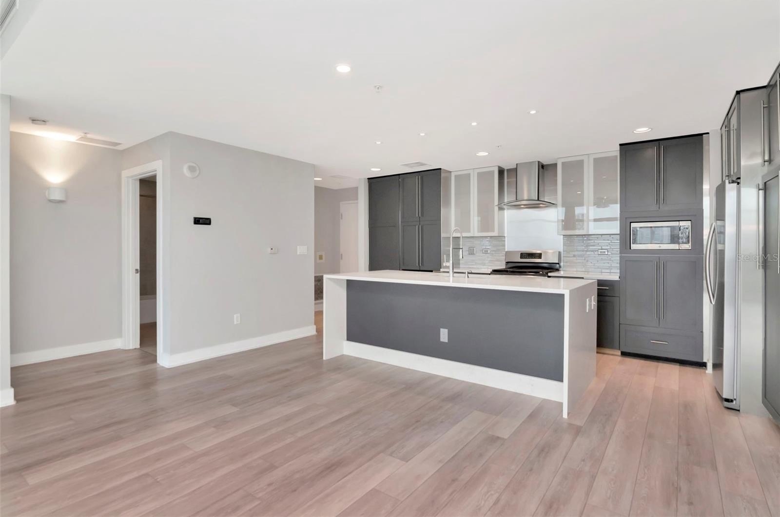 WHEN ONLY THE BEST WILL DO! Experience luxury living in the vibrant heart of downtown Tampa in Grand Central at Kennedy. This exceptional condominium is move-in ready with its professionally updated kitchen, flooring and interior paint. The gourmet chef's kitchen is a masterpiece, featuring custom contemporary cabinets, a grand quartz island with double waterfall edges, attractive backsplash, and newer stainless steel appliances featuring a gas stove, range hood, refrigerator, wine refrigerator, built-in microwave and dishwasher. The living space feels larger with floor-to-ceiling windows providing a picturesque view of the city and pool area below. The 9th-floor rooftop includes 2 pools and hot tubs, a state-of-the-art fitness center, cabanas, a grilling area, a guest-friendly clubhouse, lush green spaces, and a pet walk. This unit comes with a parking space in the gated garage below the building. Grand Central's HOA provides comprehensive services including 24-hour security and concierge, air conditioning, gas, water, sewer, pest control, and trash collection. Owners are responsible only for electric and Wi-Fi. Downstairs convenience also includes covered outdoor social areas, Crunch Fitness, award-winning Cena Italian Restaurant, Pour House, The Poké Company, Massage Envy, Gelato-Go, and Stageworks Theater. You’re also within walking distance to Publix Supermarket, Starbucks, salons, studios, dry cleaners, doctors, and dentists. Across the street, enjoy Pickleball Park and a dog park for outdoor fun. Located in the Channelside District, adjacent to the Water Street District, this prime location provides easy access to Publix, Madison Street Park, GreenWise Market, coffee shops, trolley access to Ybor City, Sparkman Wharf, Amalie Arena, and the Tampa Riverwalk.