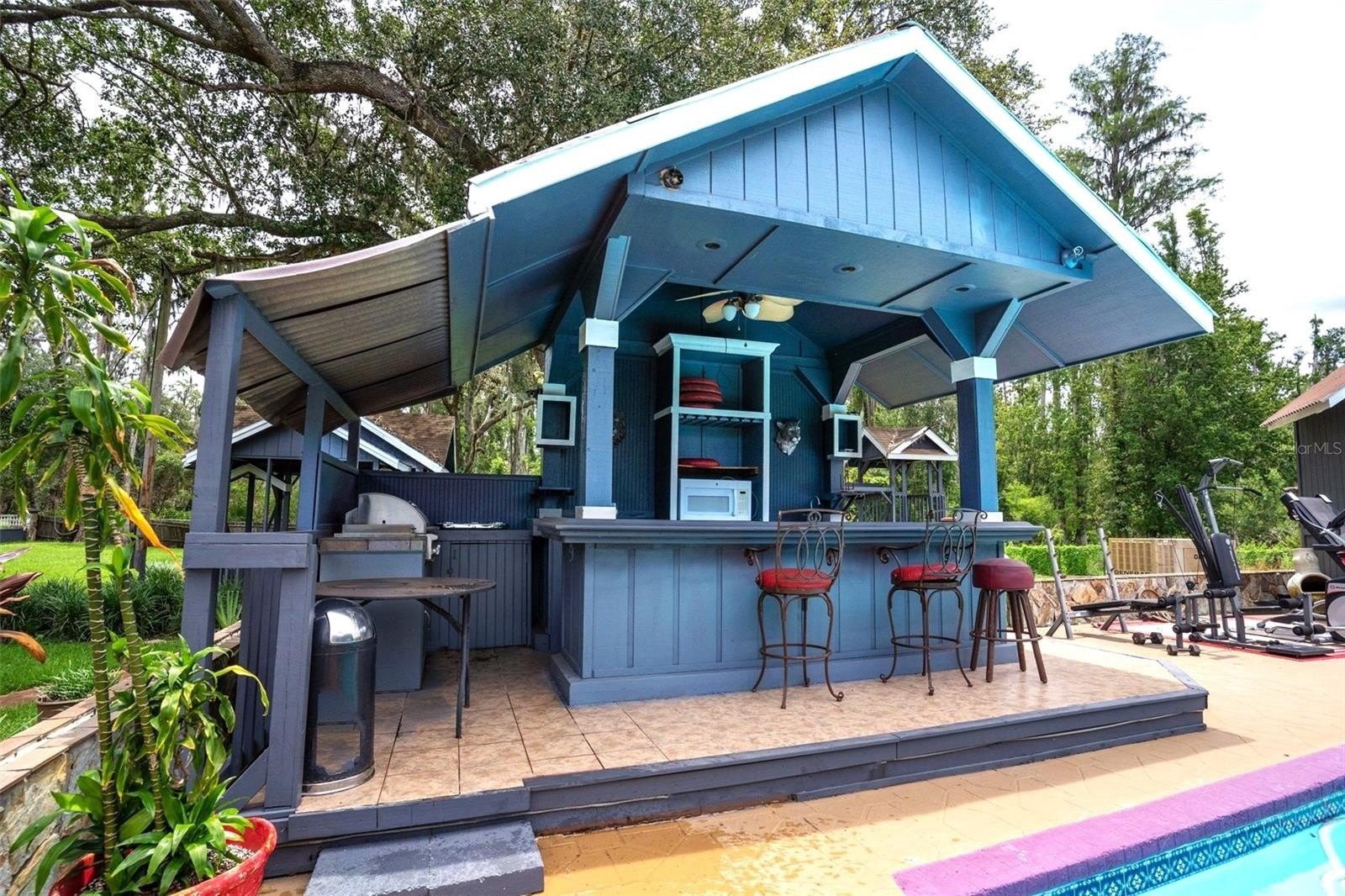 A standalone pool house bath, outdoor kitchen, and bar area for effortless entertaining
