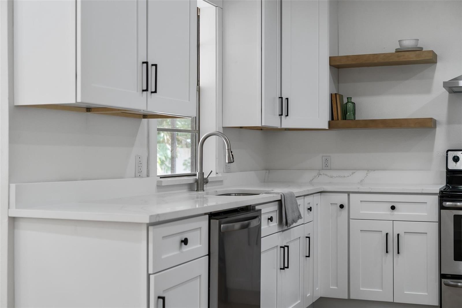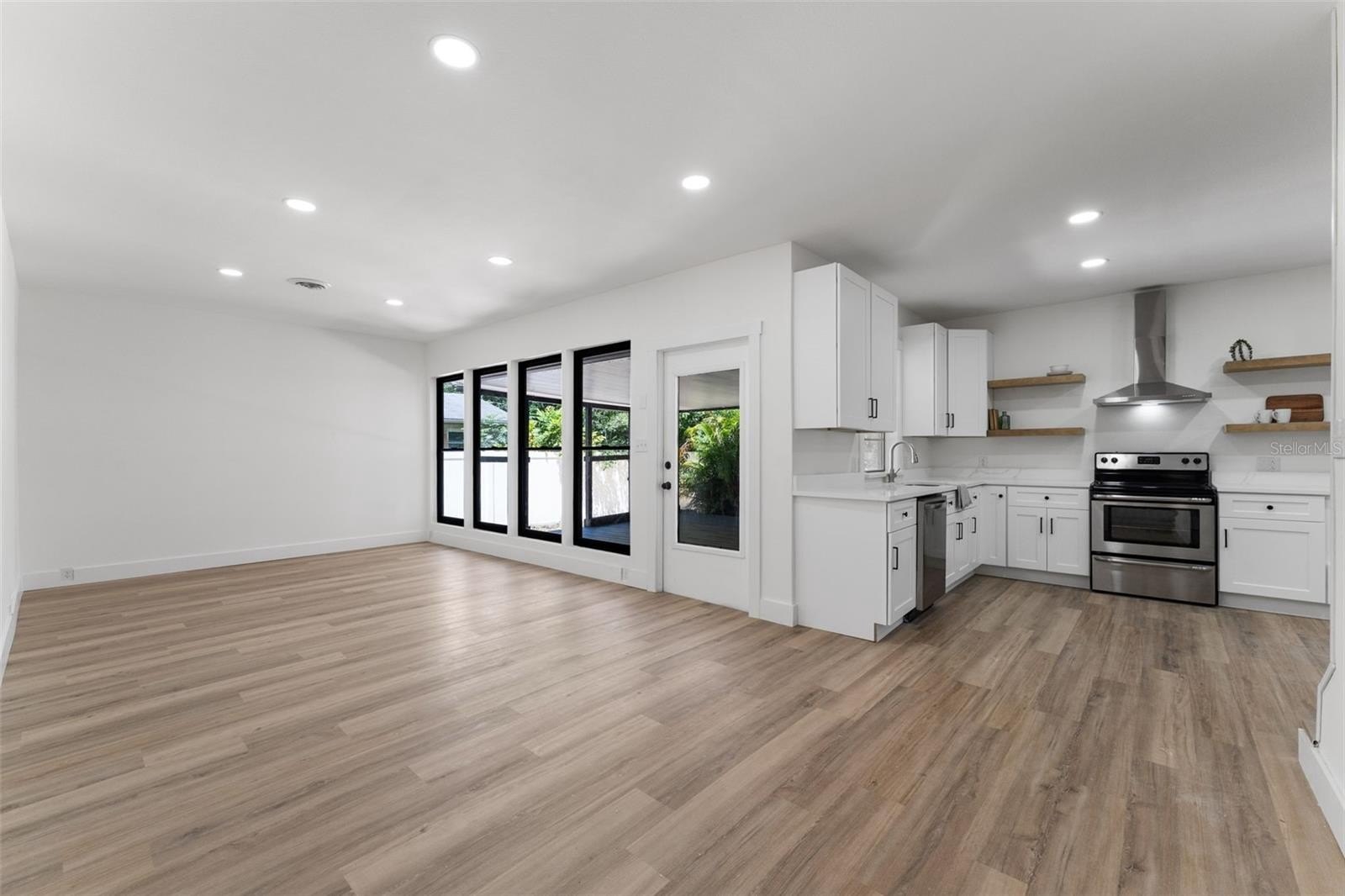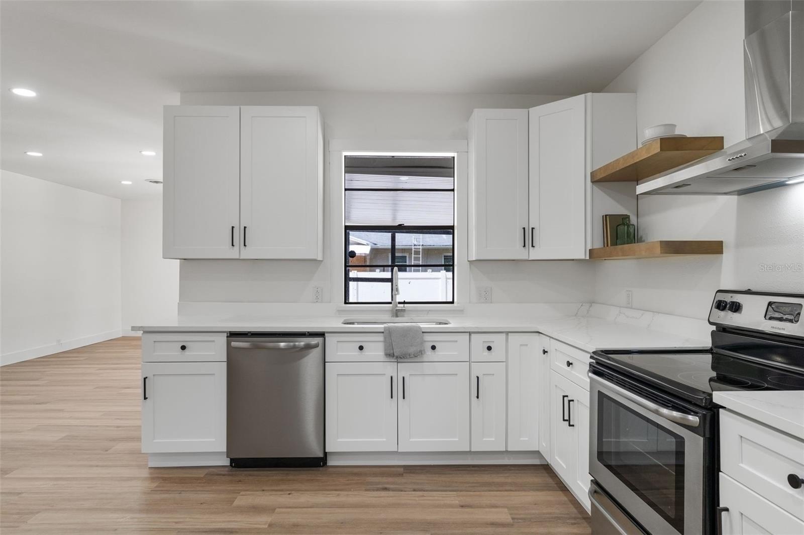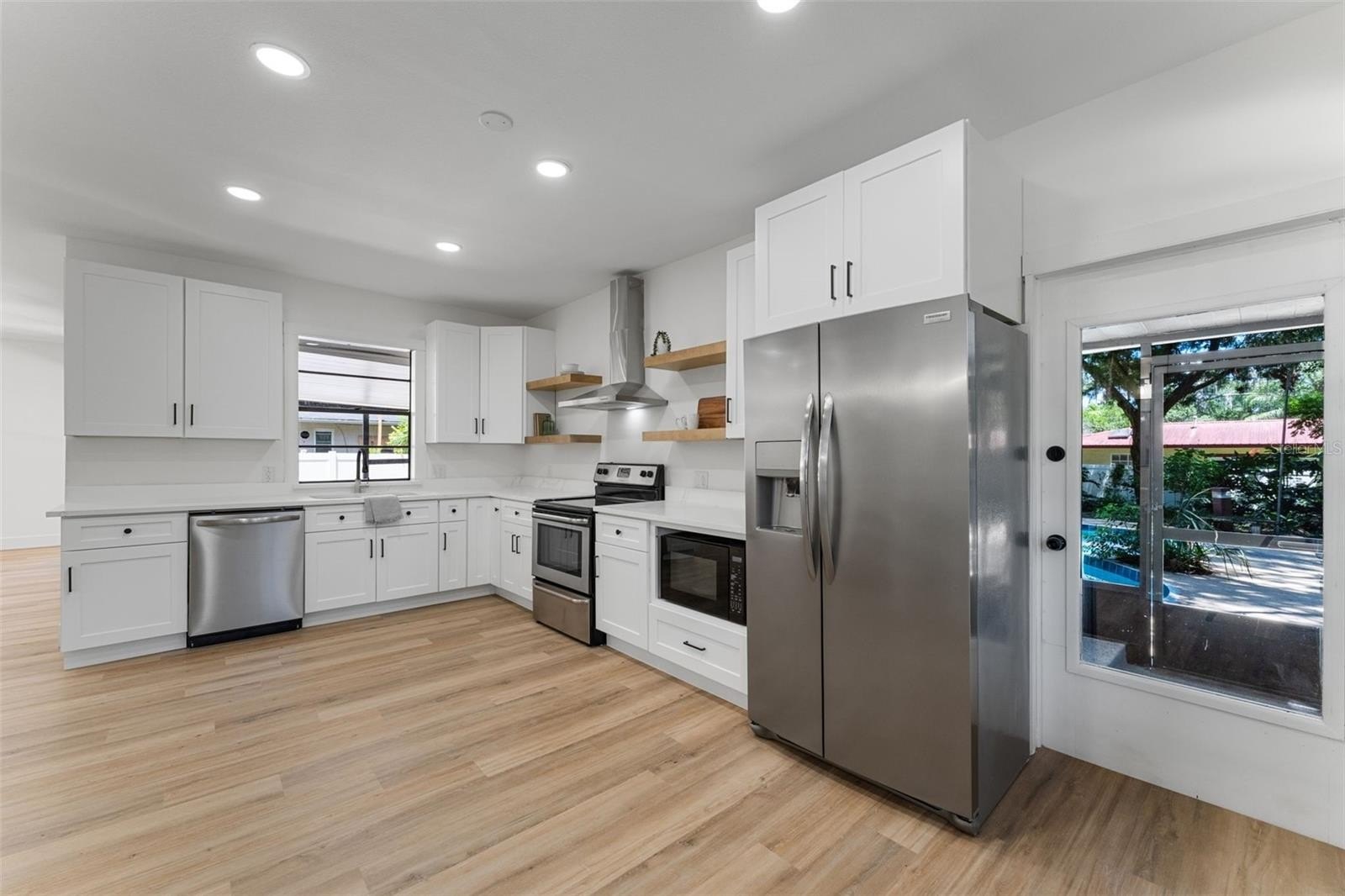 Offering four bedrooms and three bathrooms (two full and one half), the layout is both functional and stylish. The half bath is conveniently located near the back entrance for easy access from the pool. The open-concept kitchen has been completely renovated with soft-close white shaker cabinets, quartz countertops, stainless steel appliances, open wood shelving, a sleek vent hood, and modern fixtures. A spacious living/dining area lined with windows flows seamlessly into the open back porch, creating the ideal setting for entertaining or relaxing.