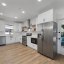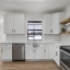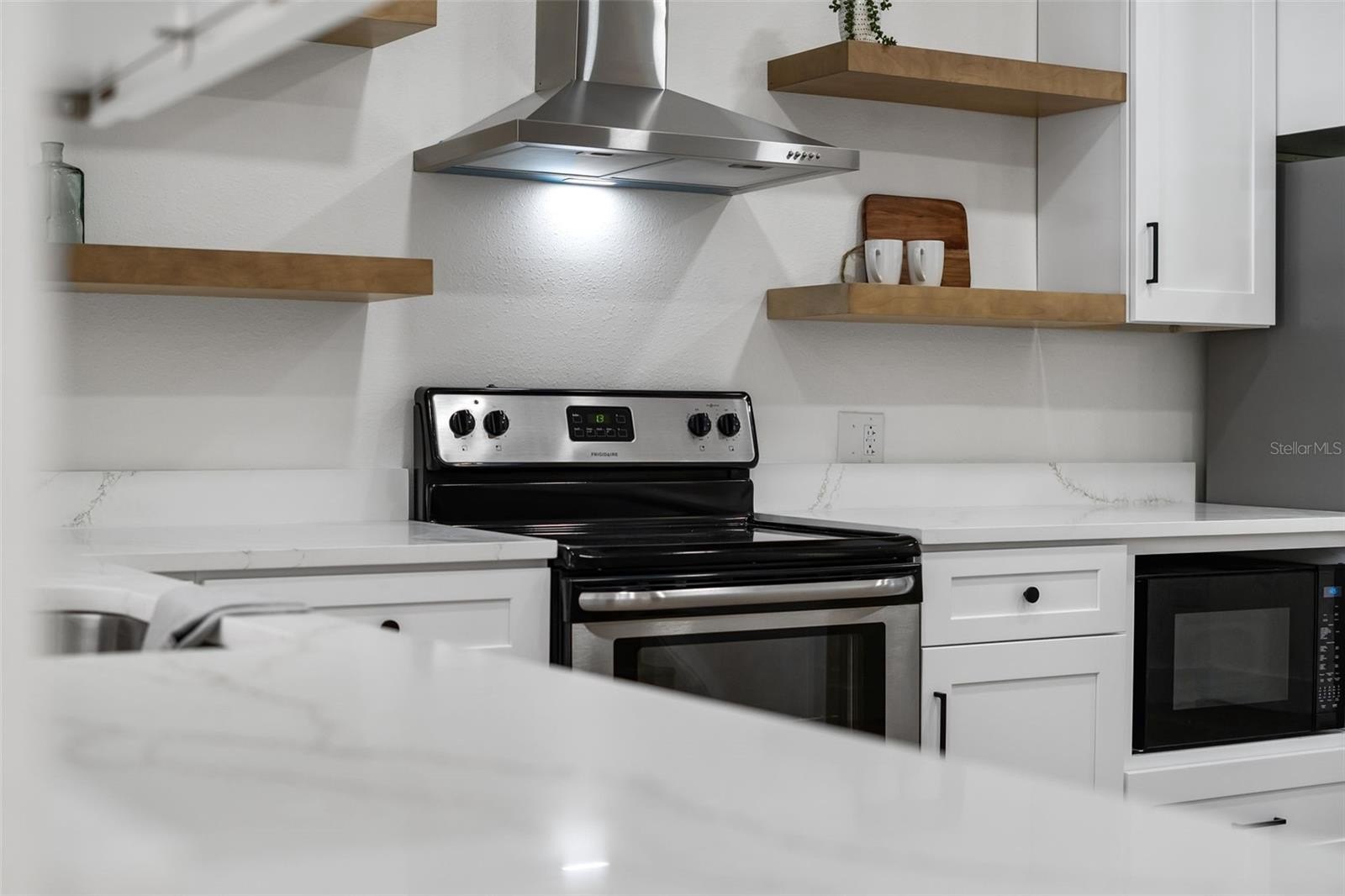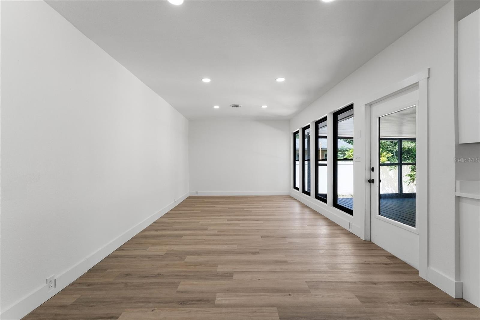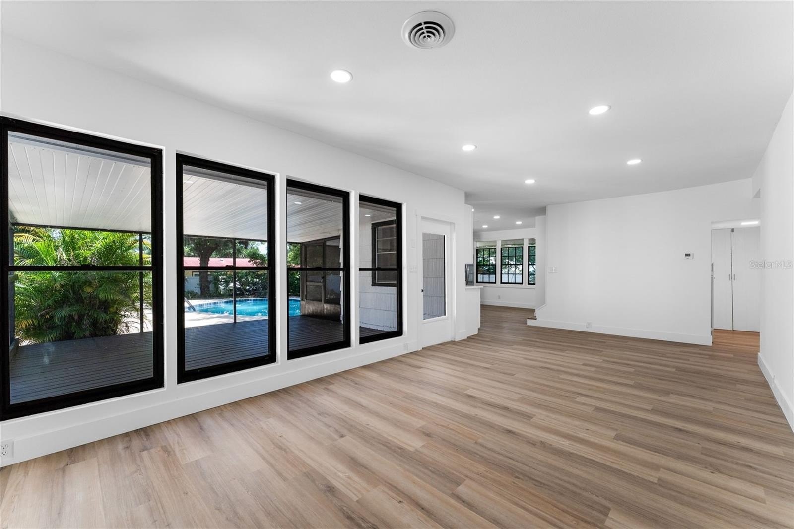 Offering four bedrooms and three bathrooms (two full and one half), the layout is both functional and stylish. The half bath is conveniently located near the back entrance for easy access from the pool. The open-concept kitchen has been completely renovated with soft-close white shaker cabinets, quartz countertops, stainless steel appliances, open wood shelving, a sleek vent hood, and modern fixtures. A spacious living/dining area lined with windows flows seamlessly into the open back porch, creating the ideal setting for entertaining or relaxing.