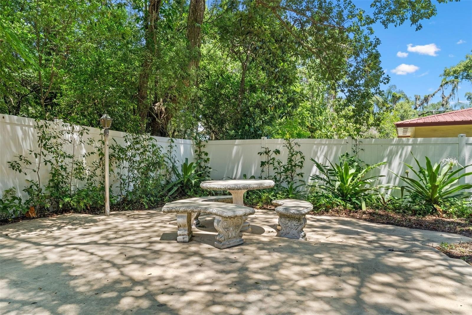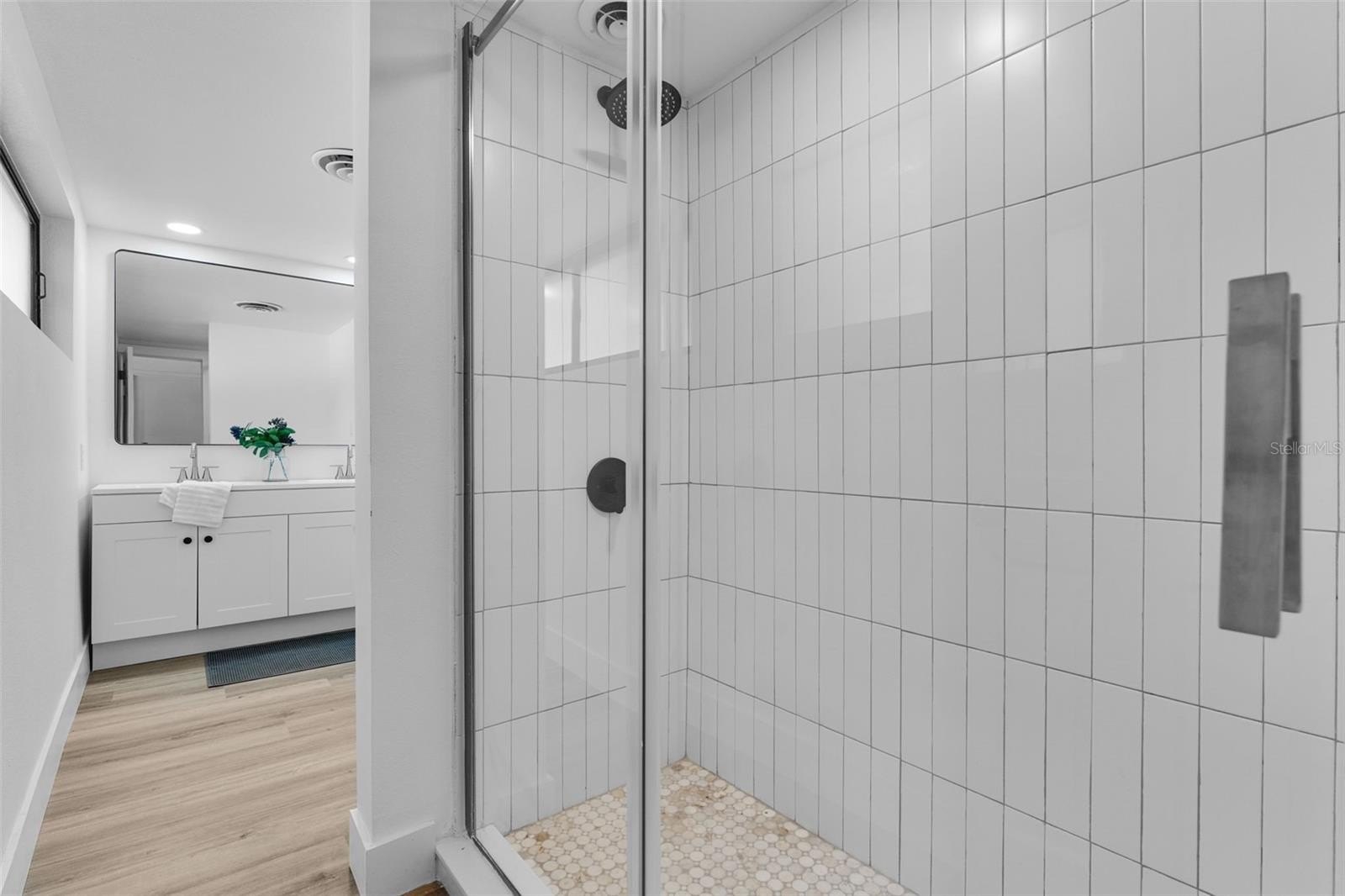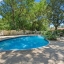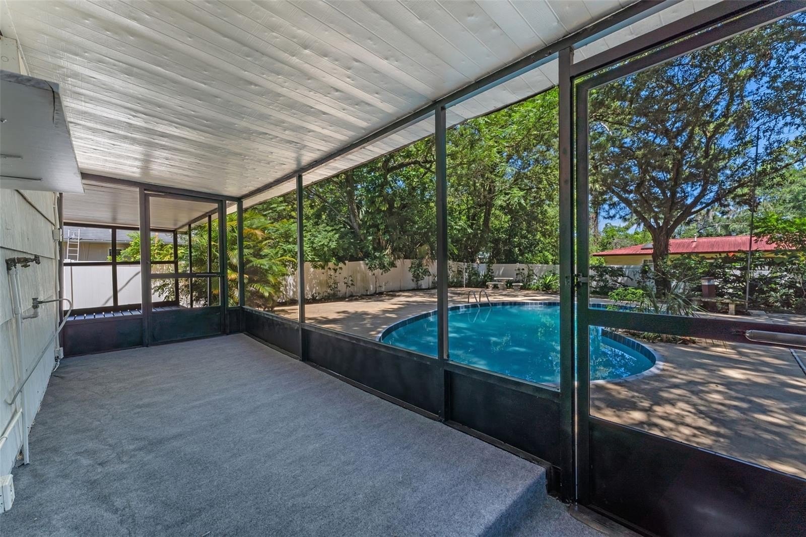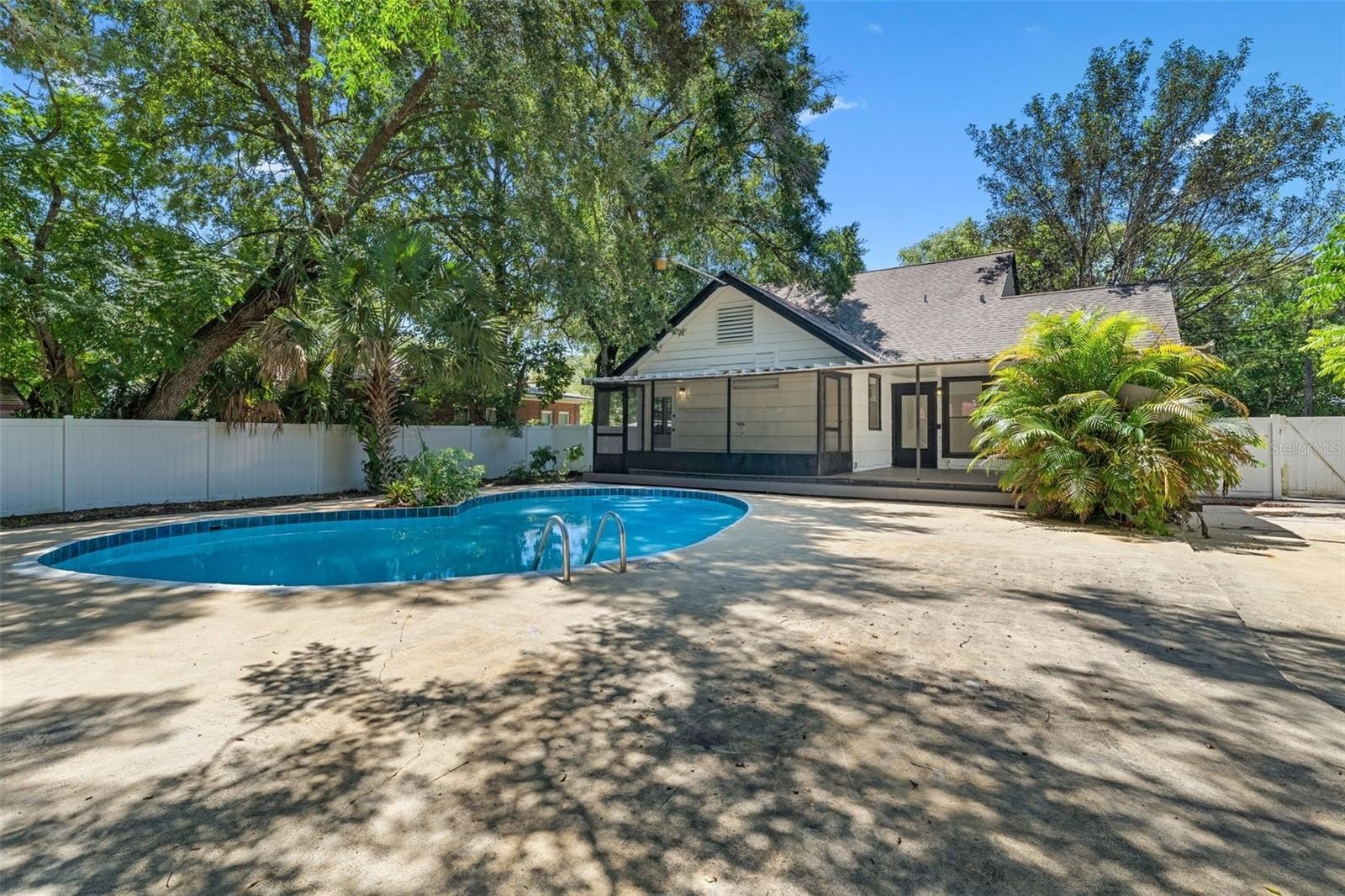 The updated bathrooms include a newly tiled walk-in shower with a sliding glass door in the primary suite, new vanities, toilets, and upgraded fixtures. Outside, enjoy a fully fenced backyard with white vinyl privacy fencing, mature trees, and ample patio space around the pool, including a separate screened in porch area.