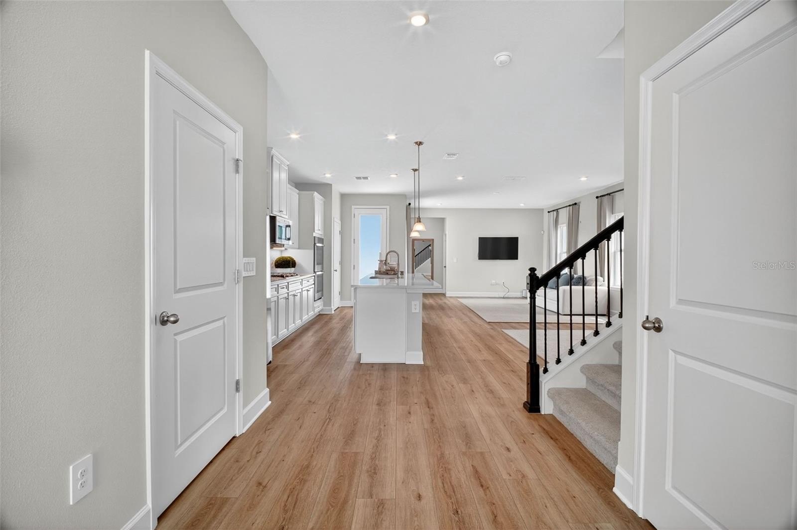 Welcome to your new Central Florida home! This never-lived-in gem has been used as the Hutchinson model for the Parkview Preserve community by Ryan Homes, their most popular floor plan! This corner lot home offers an open concept that is perfect for both everyday living and for entertaining. You'll enjoy a great view from one of the few covered front patios in the community, which is adorned with beautiful stone. The study/den at the front of the home can be used as a TV room, home office, workout room, or playroom. The comfortable living room/dining room combo opens to a covered side lanai. The fully-appointed kitchen includes a double oven, a gorgeous quartz island, and high end backsplash. This home includes a Level 3 design package, so there are upgrades galore! As you ascend the stairs, you'll admire the beautiful iron railing that leads to the spacious loft. All bedrooms are upstairs, making the second floor a private retreat with the primary en suite on one side and the other two bedrooms on the other. The laundry room is also conveniently located on the second floor. Back on the first floor, you also have storage space under the stairs and a half bathroom. The 2-car garage is at the back of the home, and the smart garage door opener and thermostat are WiFi-enabled. Your new lifestyle is complete with a community pool, cabana, playground, dog park, and walking/biking trails. Conveniently located near SR-429, you'll have easy access to all that Central Florida has to offer. Kelly Park Crossing and Publix are just two miles away, and the new Wyld Oaks Town Center is being built right next door! Why wait to build when you can make this better-than-new home yours today? Schedule your private showing before this rare find is gone!