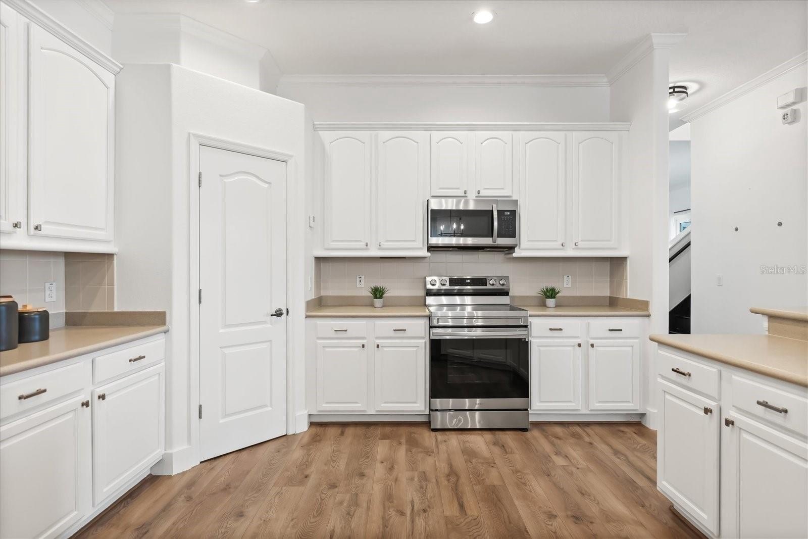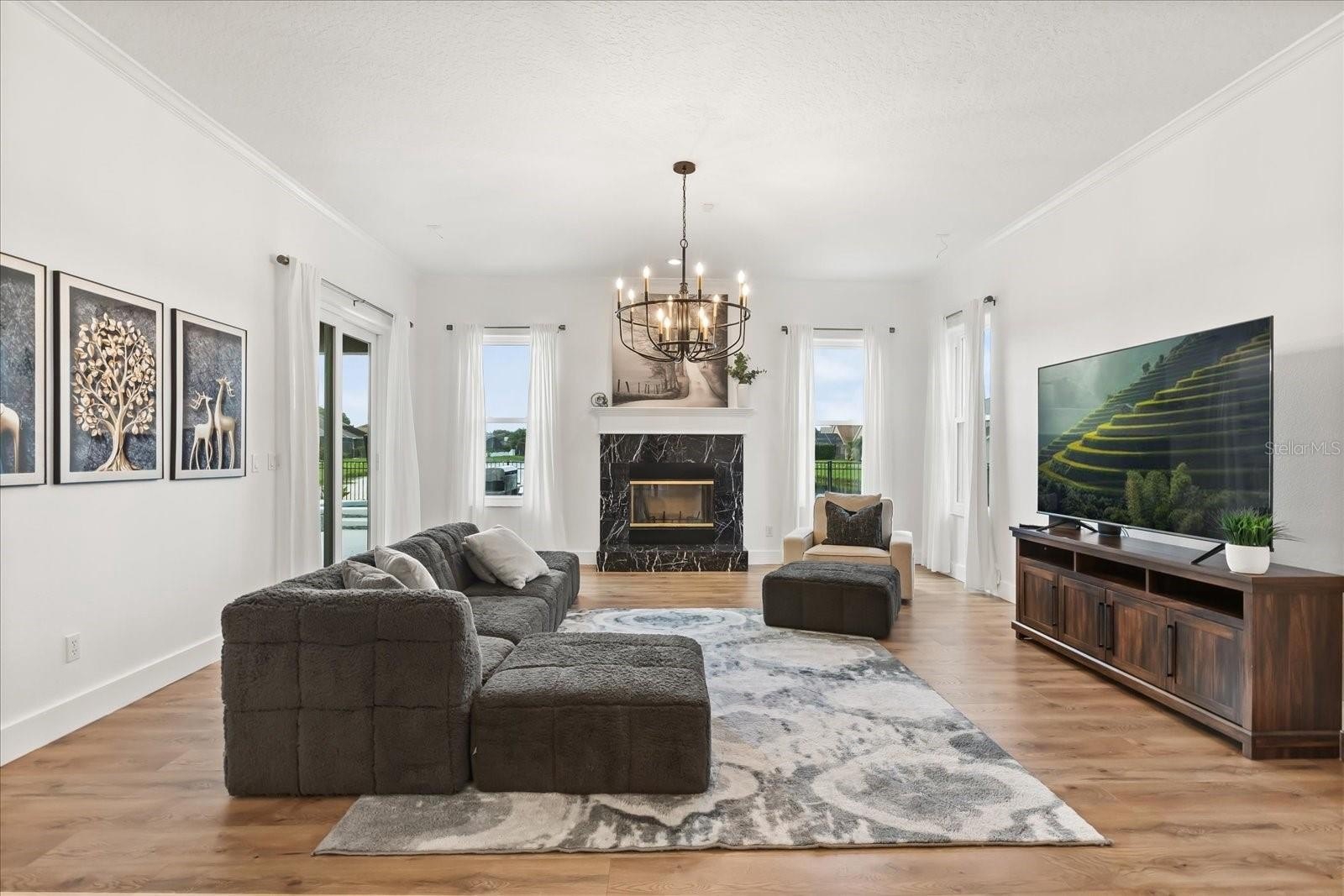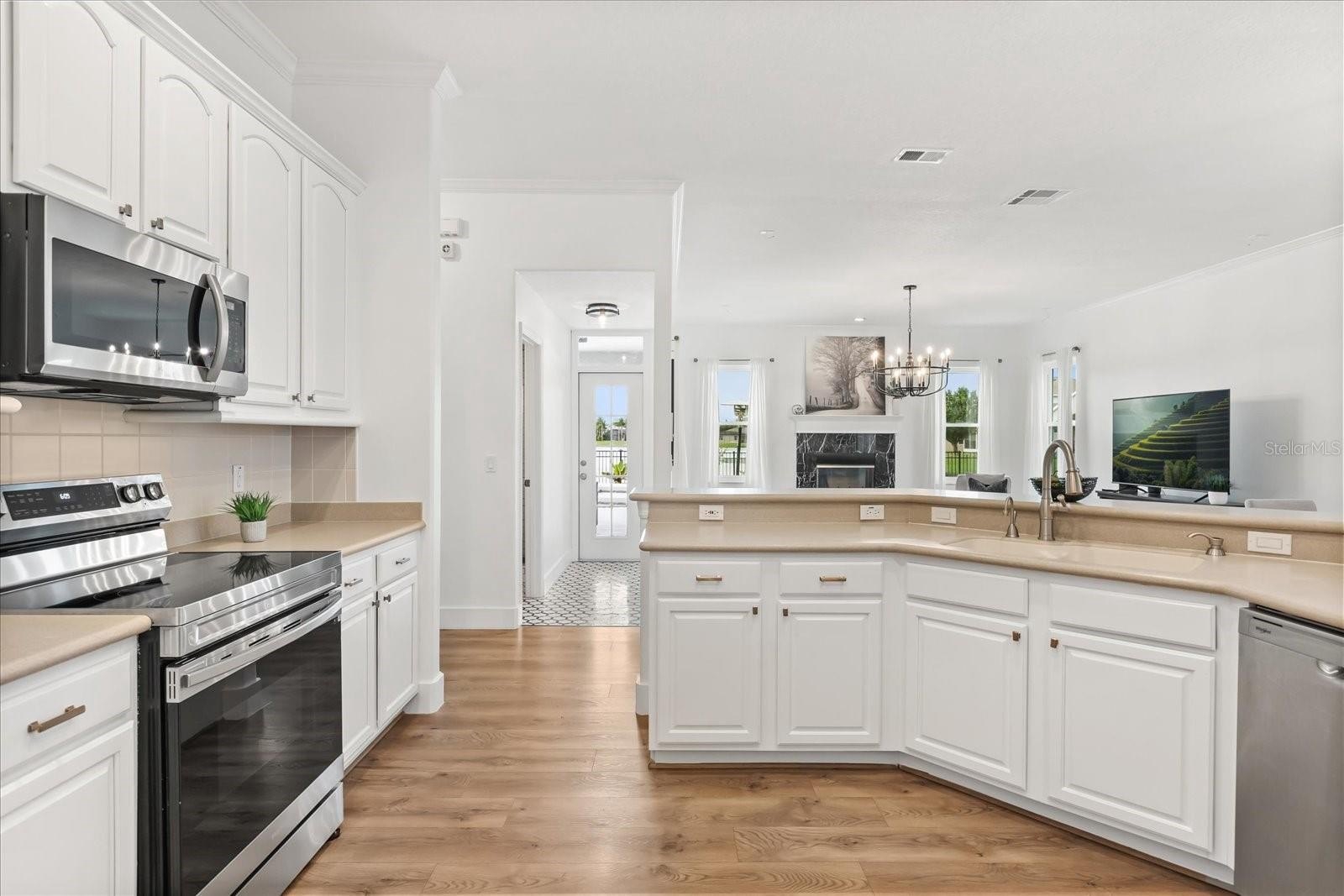 The chef’s dream kitchen showcases 42'' cabinets, stainless steel appliances, a walk-in pantry, and a center island that overlooks the expansive family room with a cozy fireplace—a perfect space for entertaining guests or family gatherings. All guest bathrooms have been tastefully renovated with high-end finishes, while the spacious primary suite is conveniently located on the first floor, featuring double walk-in closets, double tray ceilings, and a relaxing jacuzzi tub, creating a luxurious retreat.