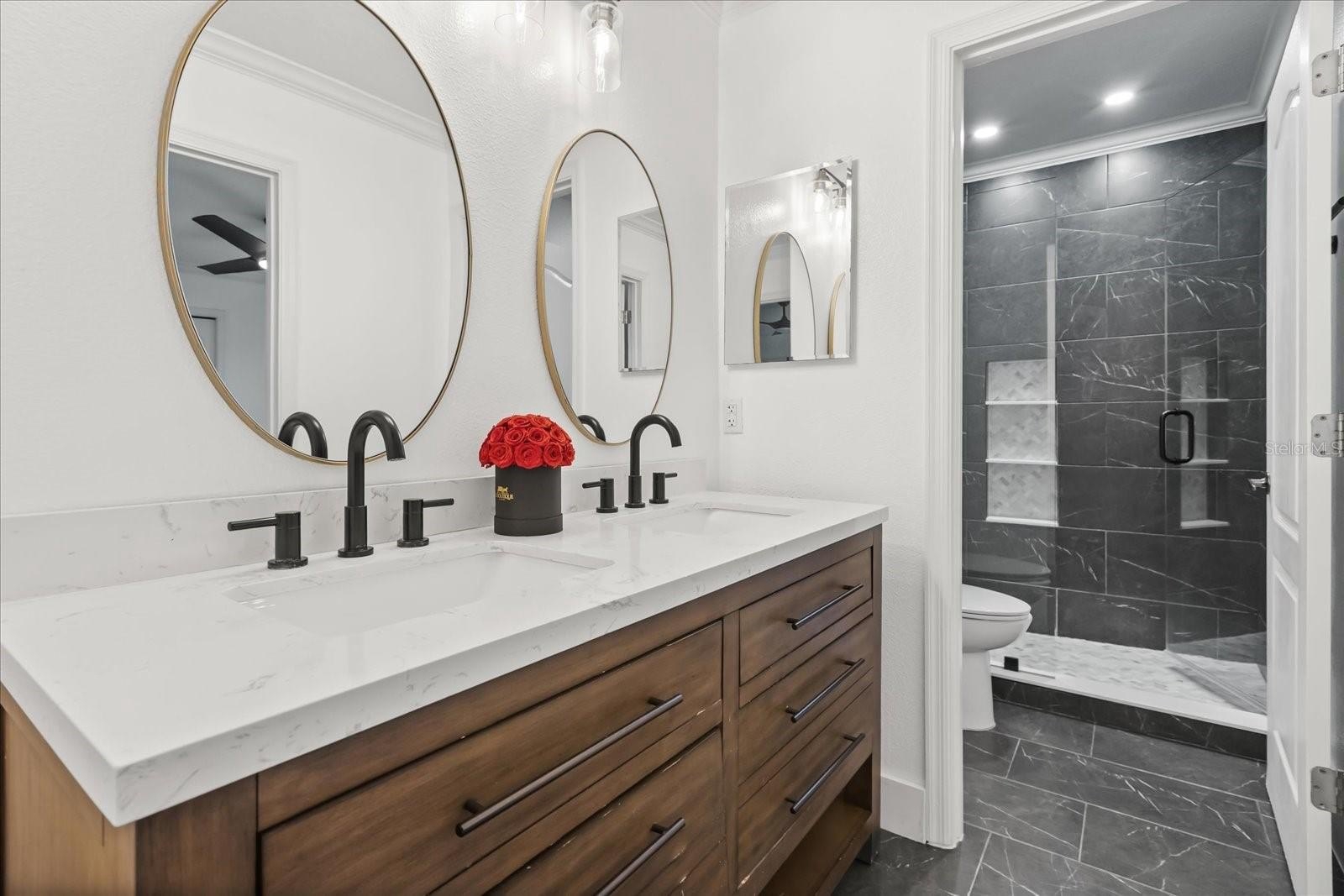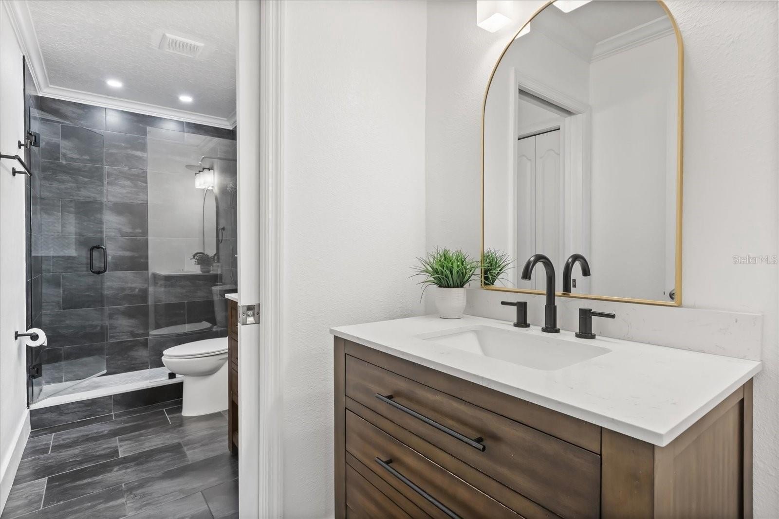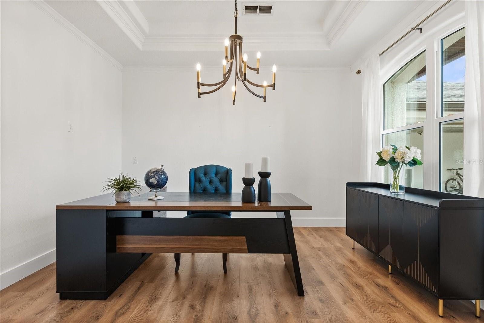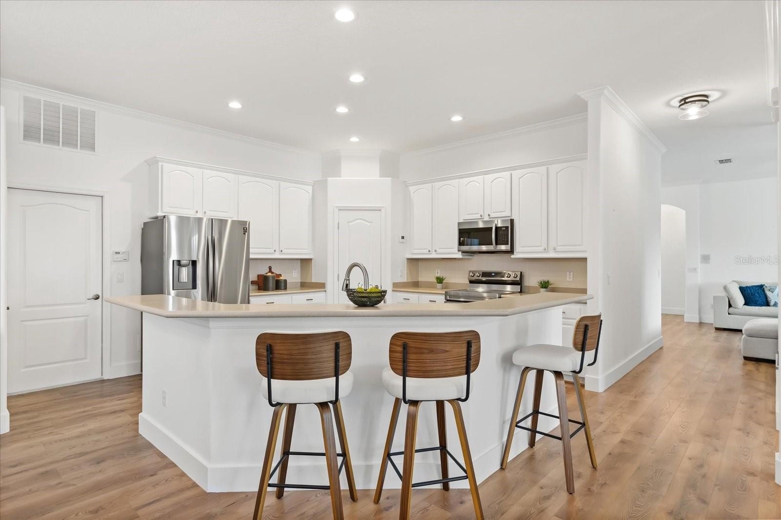 The chef’s dream kitchen showcases 42'' cabinets, stainless steel appliances, a walk-in pantry, and a center island that overlooks the expansive family room with a cozy fireplace—a perfect space for entertaining guests or family gatherings. All guest bathrooms have been tastefully renovated with high-end finishes, while the spacious primary suite is conveniently located on the first floor, featuring double walk-in closets, double tray ceilings, and a relaxing jacuzzi tub, creating a luxurious retreat.