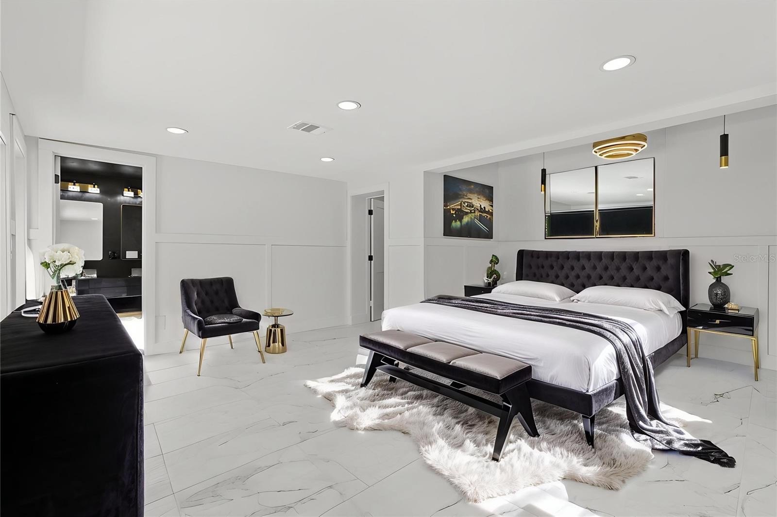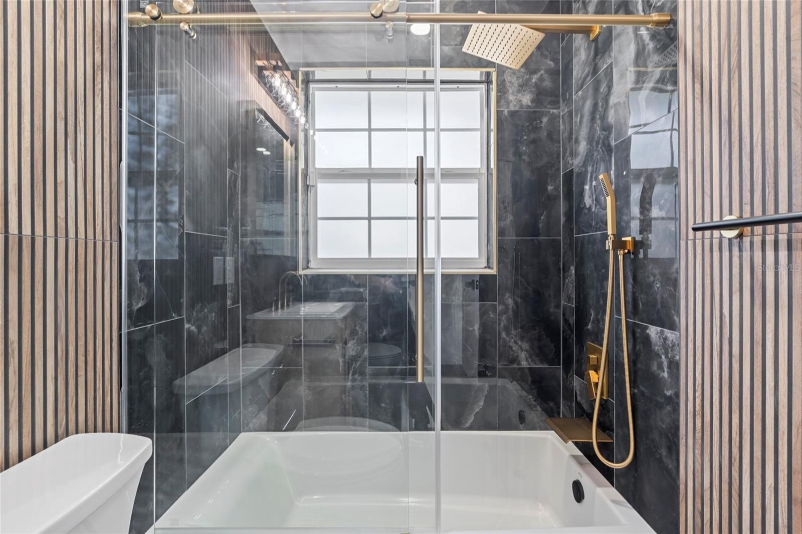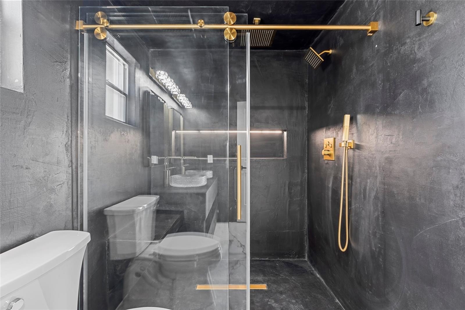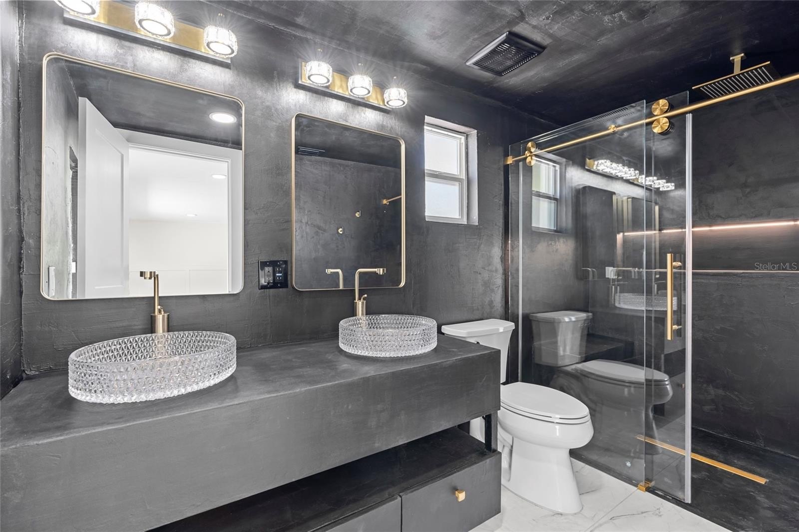 The primary suite boasts a large walk-in closet and tulum-inspired bath featuring dual vanities, diamond sinks, frameless shower doors, a dual rainfall shower with separate handle, and a custom LED niche for shampoo and conditioner. Two additional bedrooms with deep closets share a beautifully updated bath with modern tile and elegant gold accents. and a custom wet bar with wine cooler is perfect for entertaining.